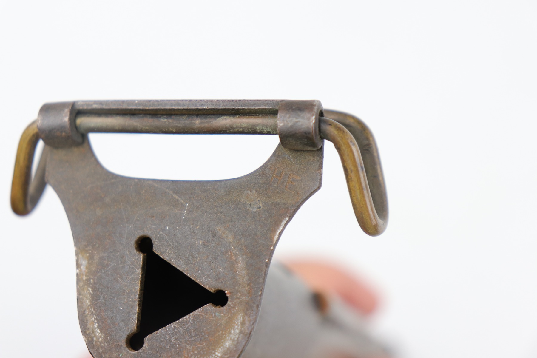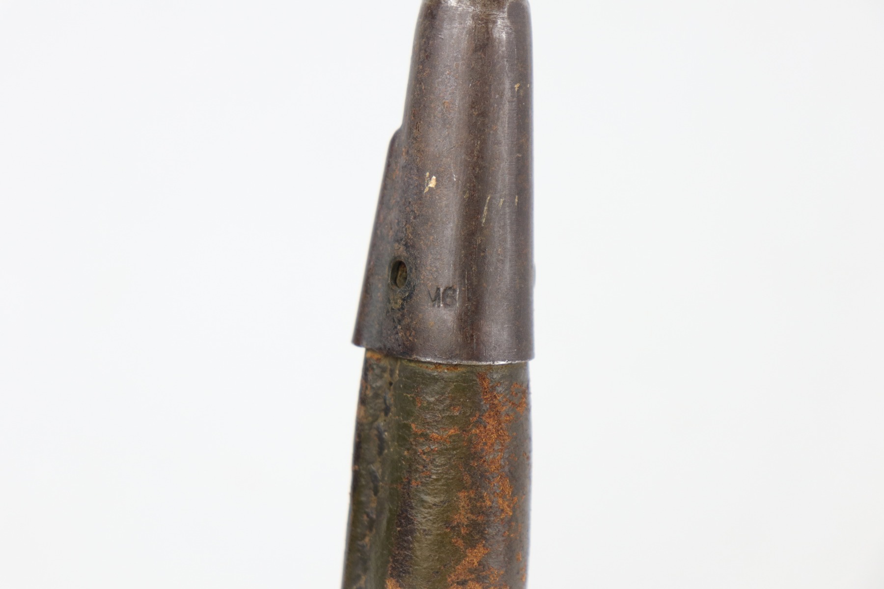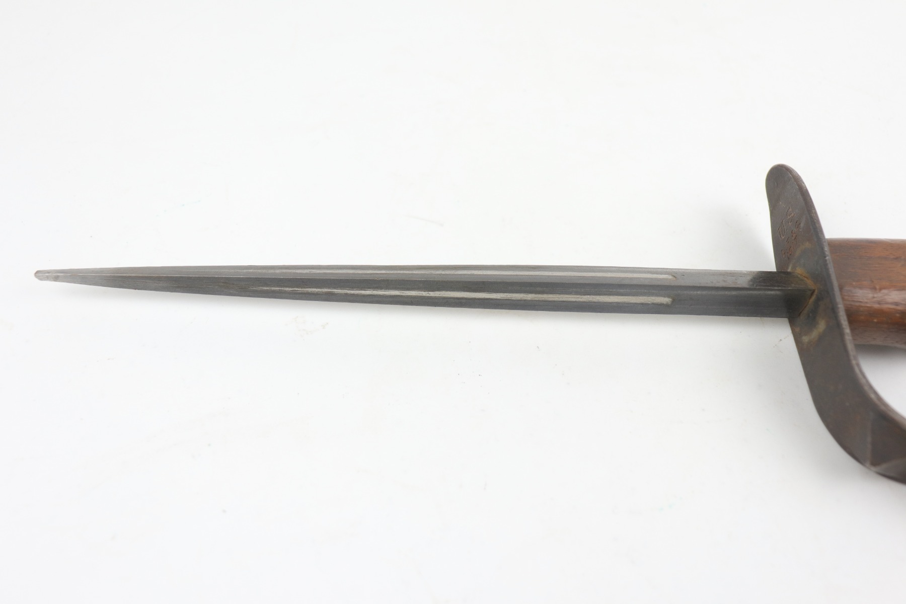 7/15/20 – This is an original WW1 Trench Fighting Knife in its original scabbard. The knife is dated 1917 and marked “US” and “LF&C”. Most of the original bluing on the blade is in tact but there are streaks of wear on each side of the blade. There is patina and light rust on the handle. The wood is in excellent condition. Unfortunately, the very tip of the blade is broken off. The scabbard is marked “M.S.” and “HE”. It is in good condition but there is patina on the metal parts throughout. There are scuff marks on the leather throughout. The tip is a little loose.