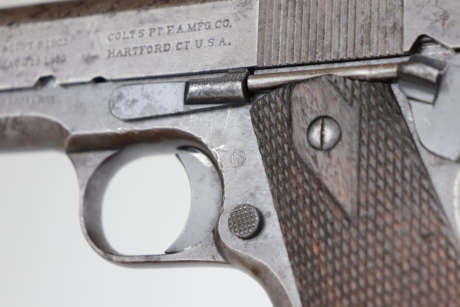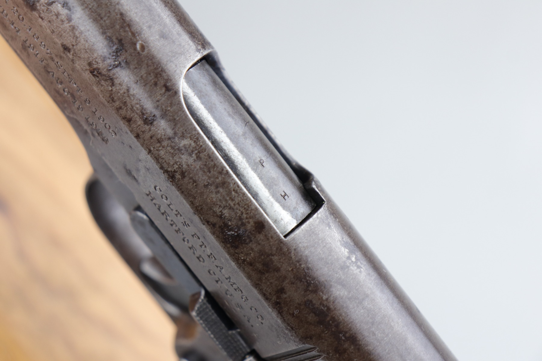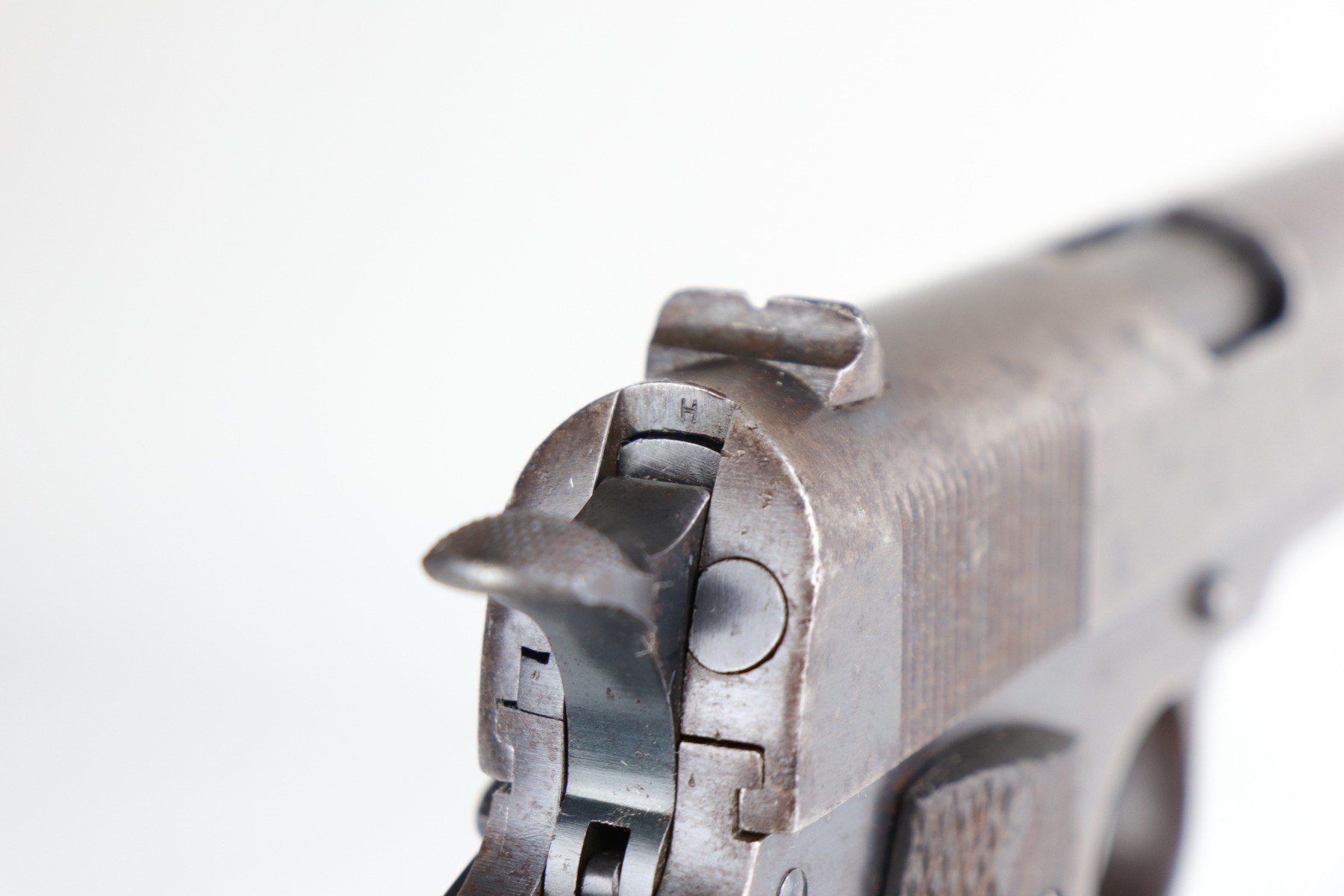 4/28/20 – This is an authentic and original WW1 US Military Colt Model 1911 pistol, chambered in .45 ACP. Cosmetically, this gun is in fair condition, but it functions perfectly well. The gun has lost almost all of its original finish and there are obvious spots of heavy patina throughout. There are also a few dings and scratches here and there. The barrel has the correct vertical “P H” proofs and is original. According to Goddard’s “The Government Model”, this was shipped to the Springfield Armory on May 22, 1917. The frame has the proper “GHS” acceptance proof. The bore is worn – pin-pricking throughout and very little rifling remaining. Comes with a proper magazine that is also fairly worn.