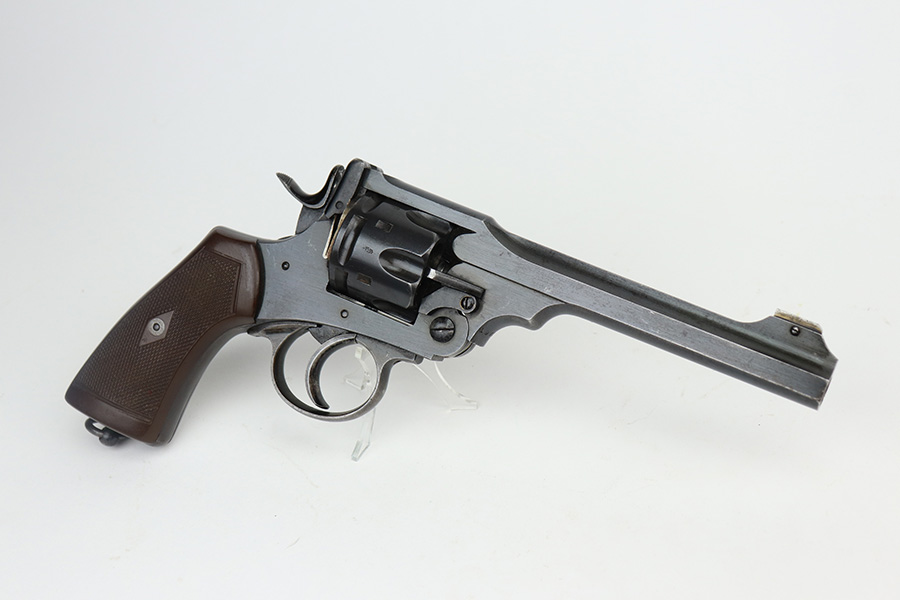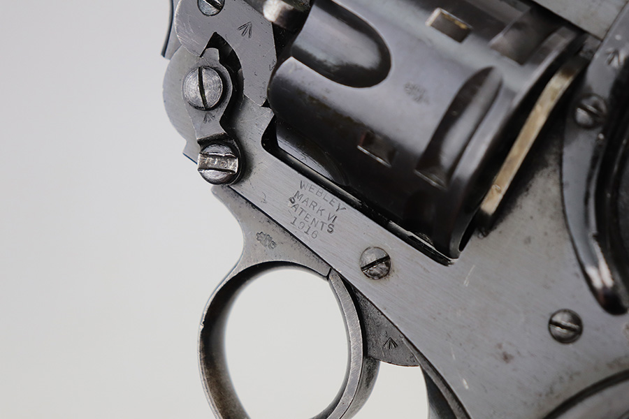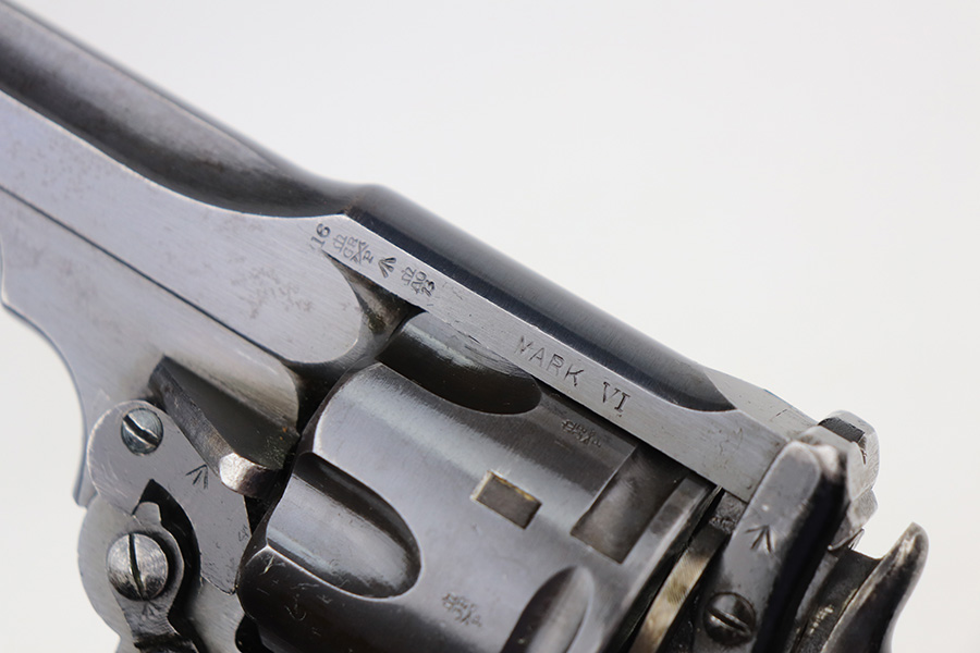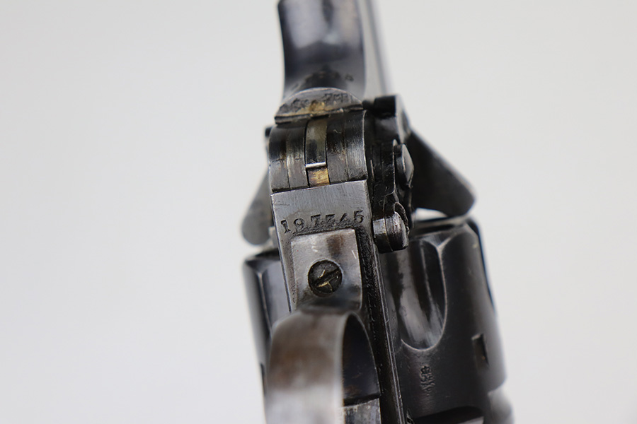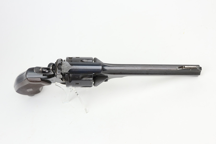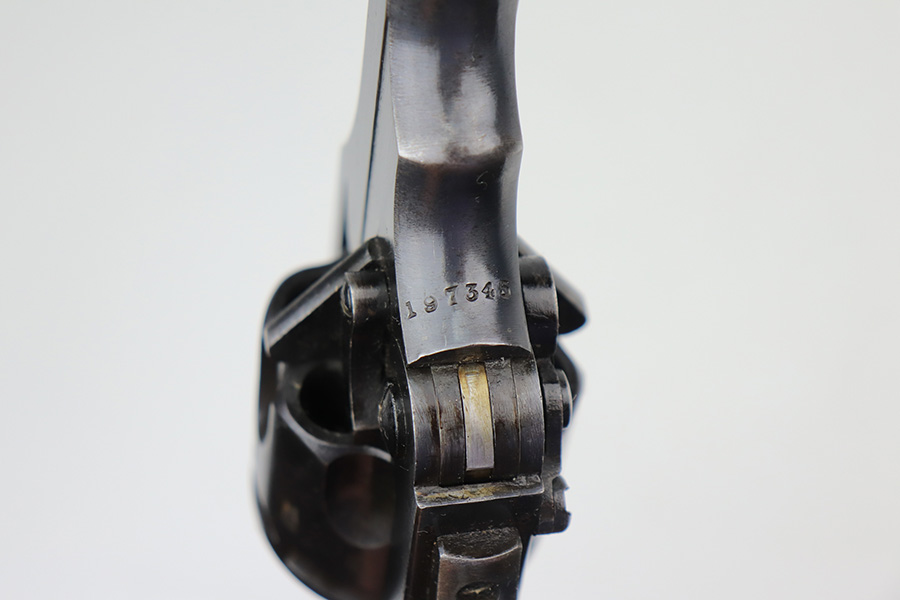 5/7/21 – This is an excellent example of a Webley Mark VI revolver issued to the British military during WW1. This one is all matching and chambered in .445. The cylinder has not been altered or shaved. It has retained about 94-95% of its original bluing. There is minor wear on some the high edges, a hint of thinning on the straps, and minor wear with a few small dings on the underside of the trigger guard. Tiny dots of oxidation on the barrel. Comes with excellent grips. The bore is excellent – shiny with strong rifling.
