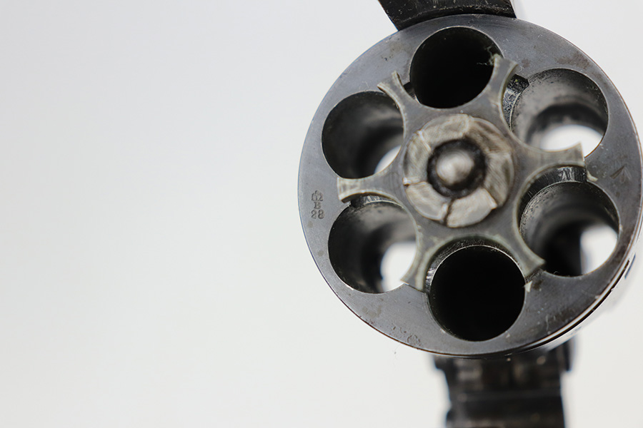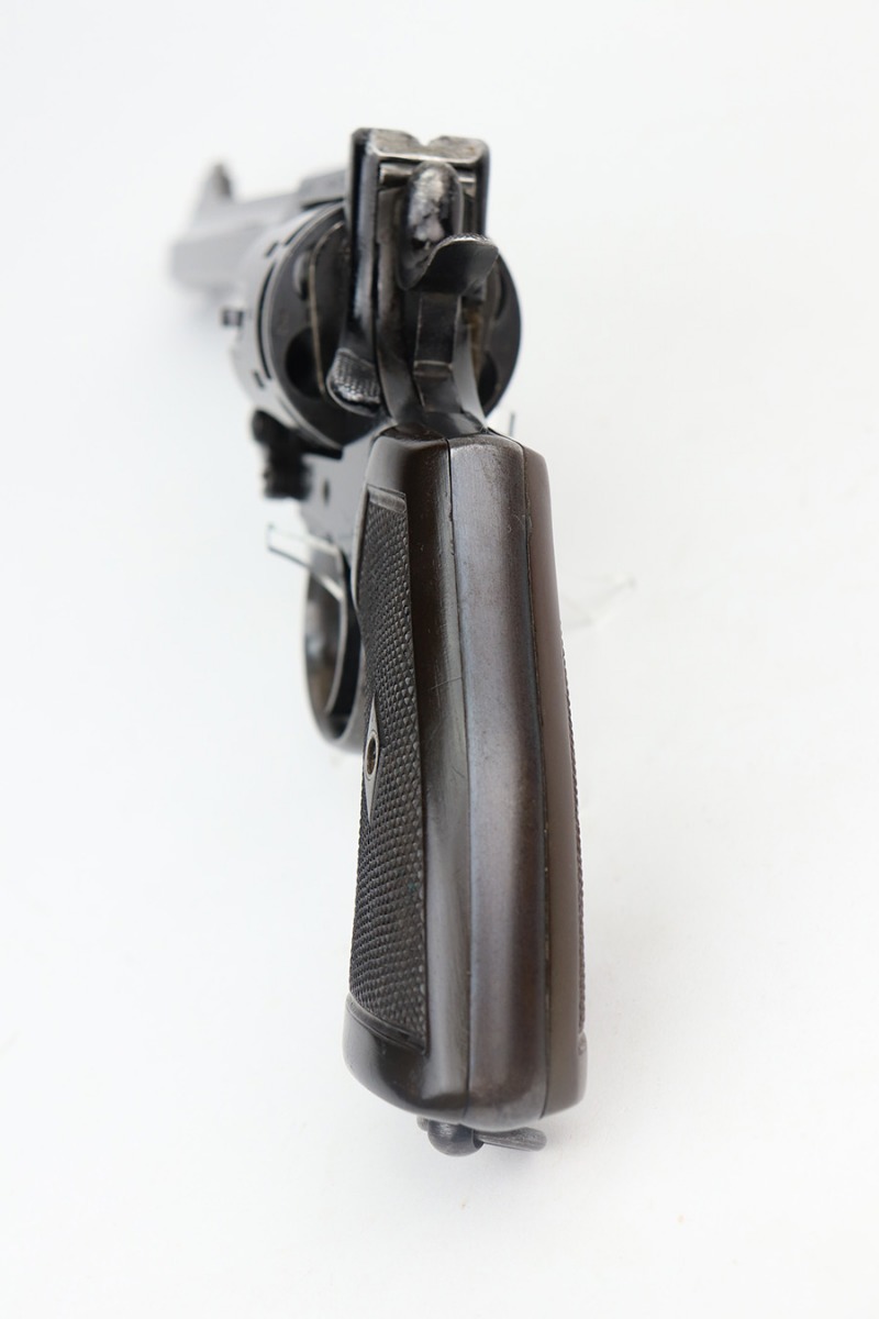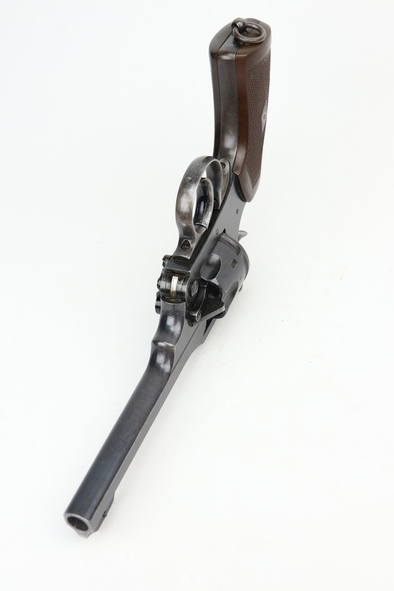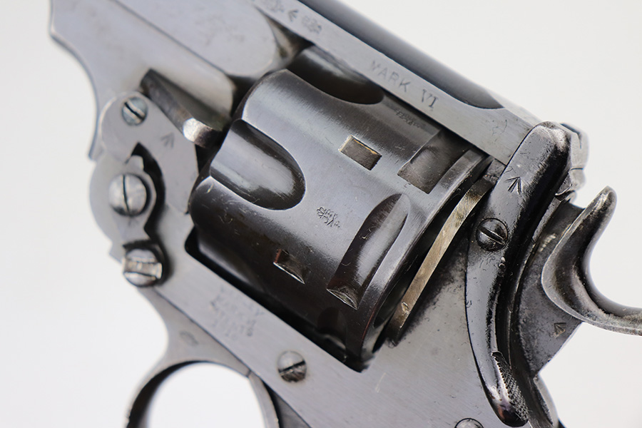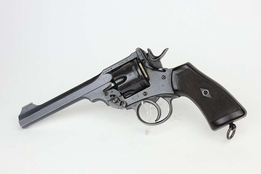 5/7/21 – This is an excellent example of a Webley Mark VI revolver issued to the British military during WW1. This one is all matching and chambered in .445. The cylinder has not been altered or shaved. It has retained about 94-95% of its original bluing. There is minor wear on some the high edges, a hint of thinning on the straps, and minor wear with a few small dings on the underside of the trigger guard. Tiny dots of oxidation on the barrel. Comes with excellent grips. The bore is excellent – shiny with strong rifling.