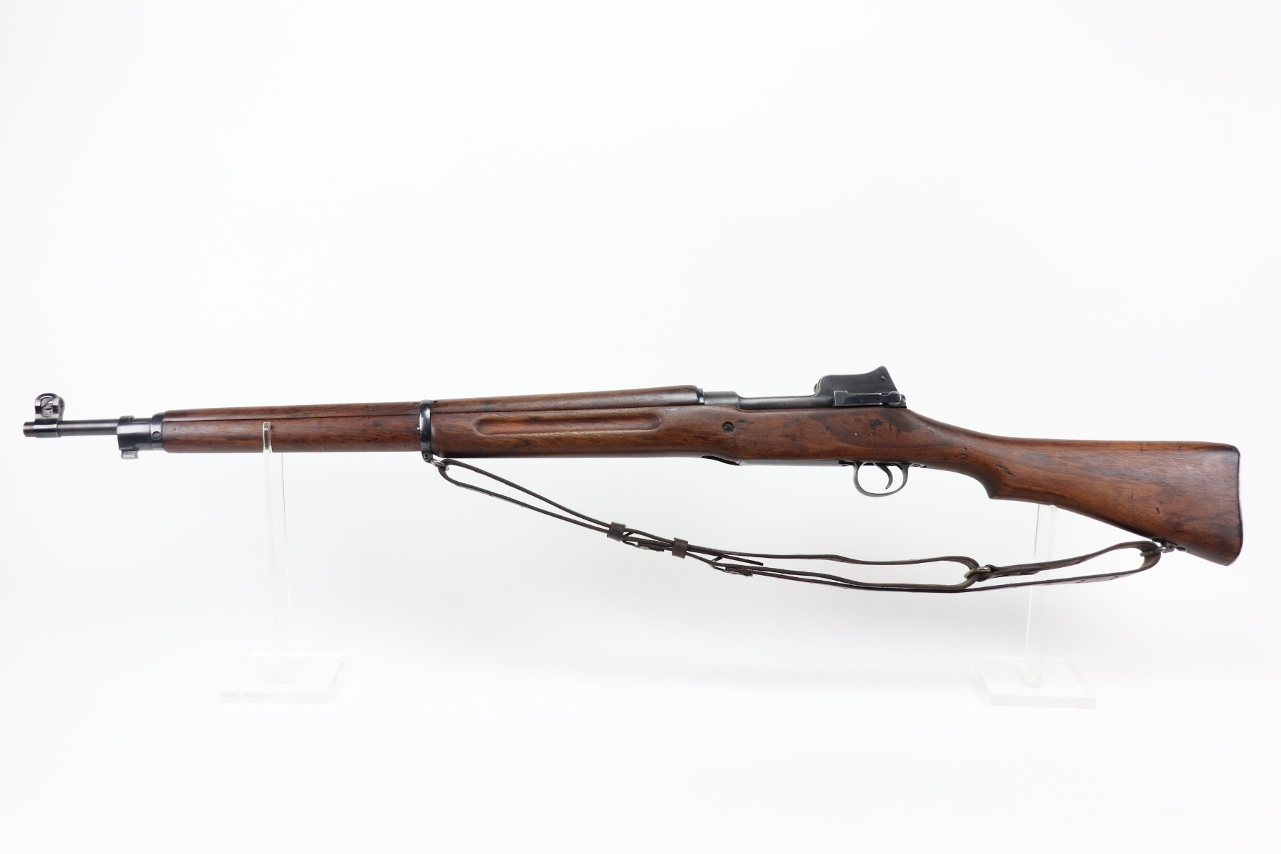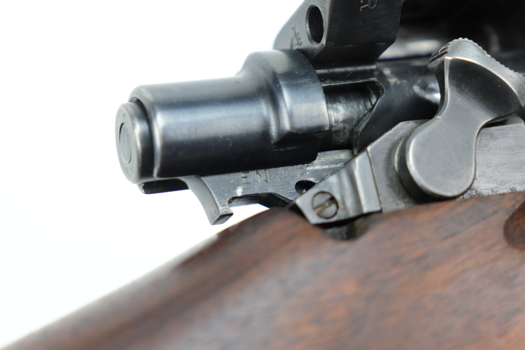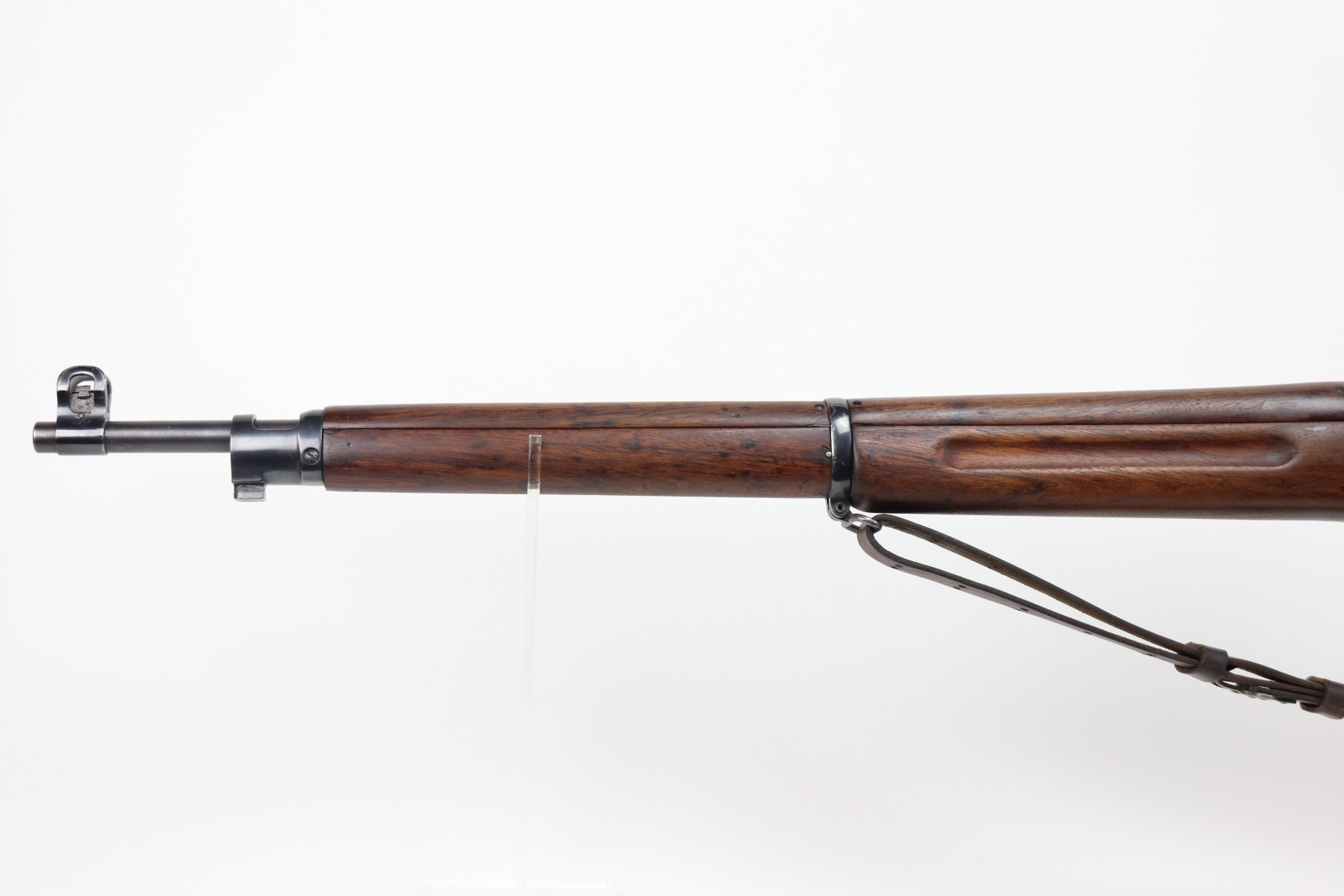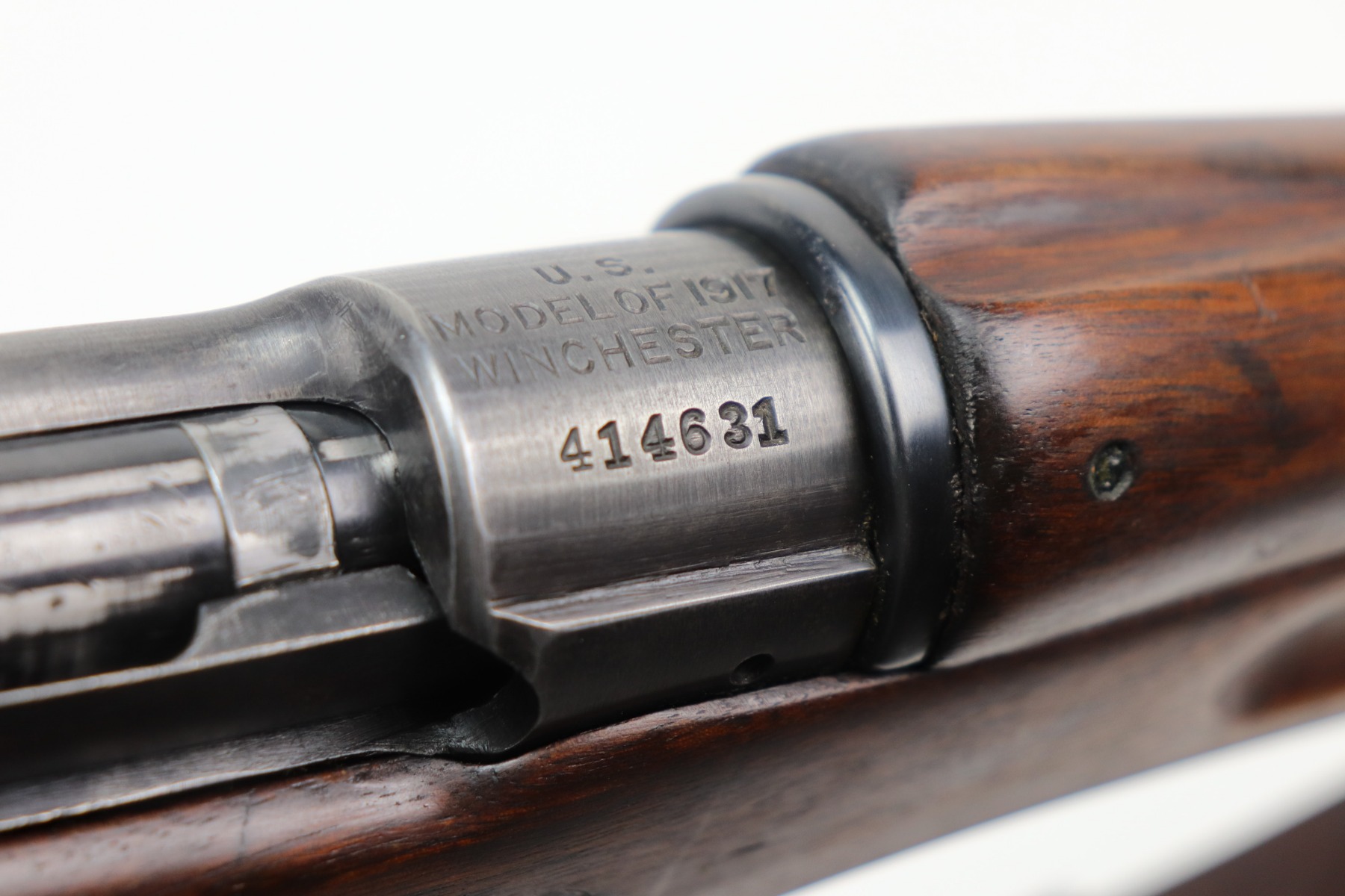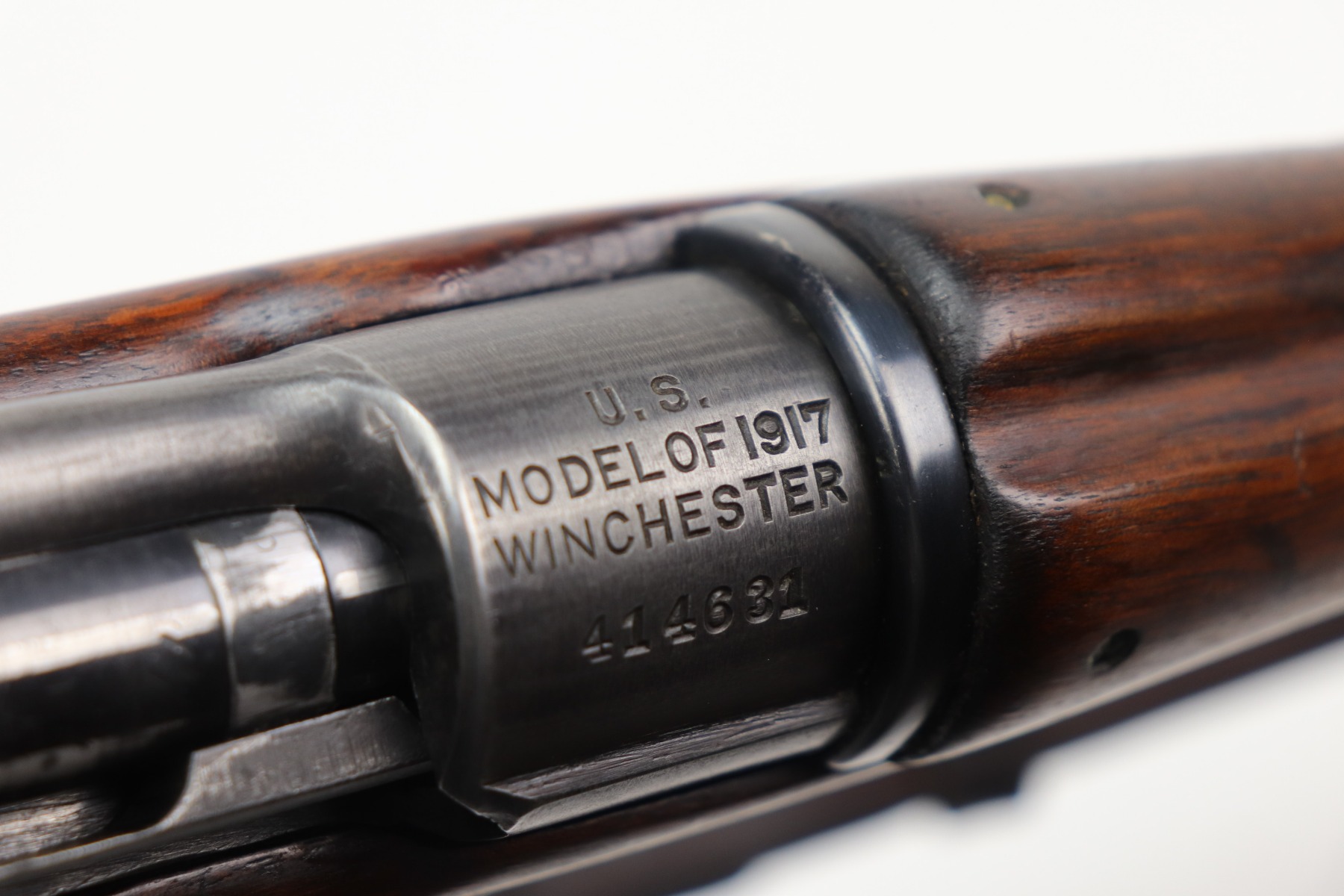 2/22/21 – This is an excellent example of a Winchester Model 1917 issued to the US military in September of 1918. The receiver and barrel have the proper flaming bomb military proofs. We were told the bolt was made by Eddystone. There is a name scratched into the right side of the receiver. Overall, the gun is in excellent condition, but there is minor thinning on the barrel and receiver and spotty discoloration on the barrel bands and floor plate. The stock is very nice but seems to have been lightly sanded at some point. The gun comes with an original sling. The bore is near-mint.