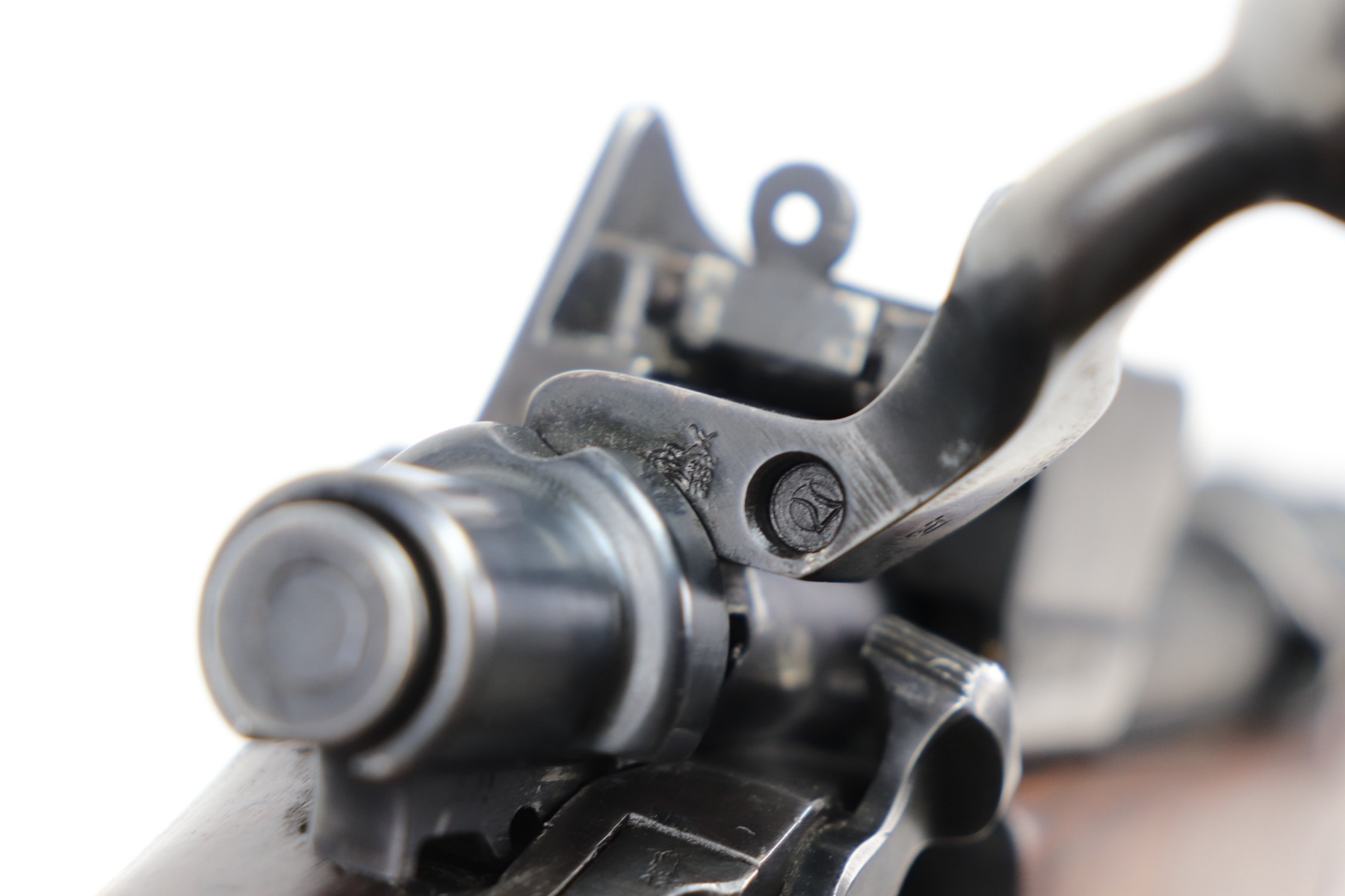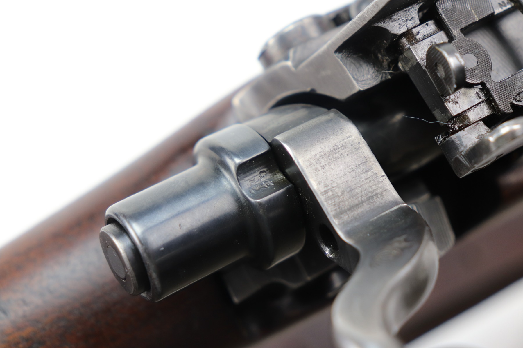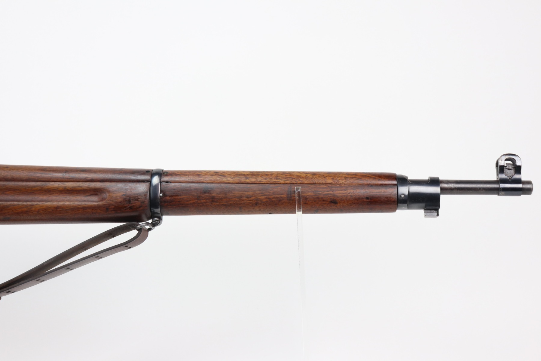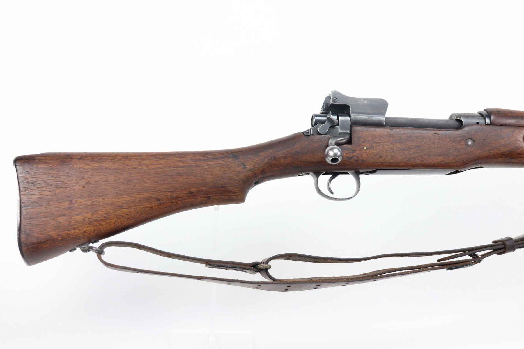 2/22/21 – This is an excellent example of a Winchester Model 1917 issued to the US military in September of 1918. The receiver and barrel have the proper flaming bomb military proofs. We were told the bolt was made by Eddystone. There is a name scratched into the right side of the receiver. Overall, the gun is in excellent condition, but there is minor thinning on the barrel and receiver and spotty discoloration on the barrel bands and floor plate. The stock is very nice but seems to have been lightly sanded at some point. The gun comes with an original sling. The bore is near-mint.