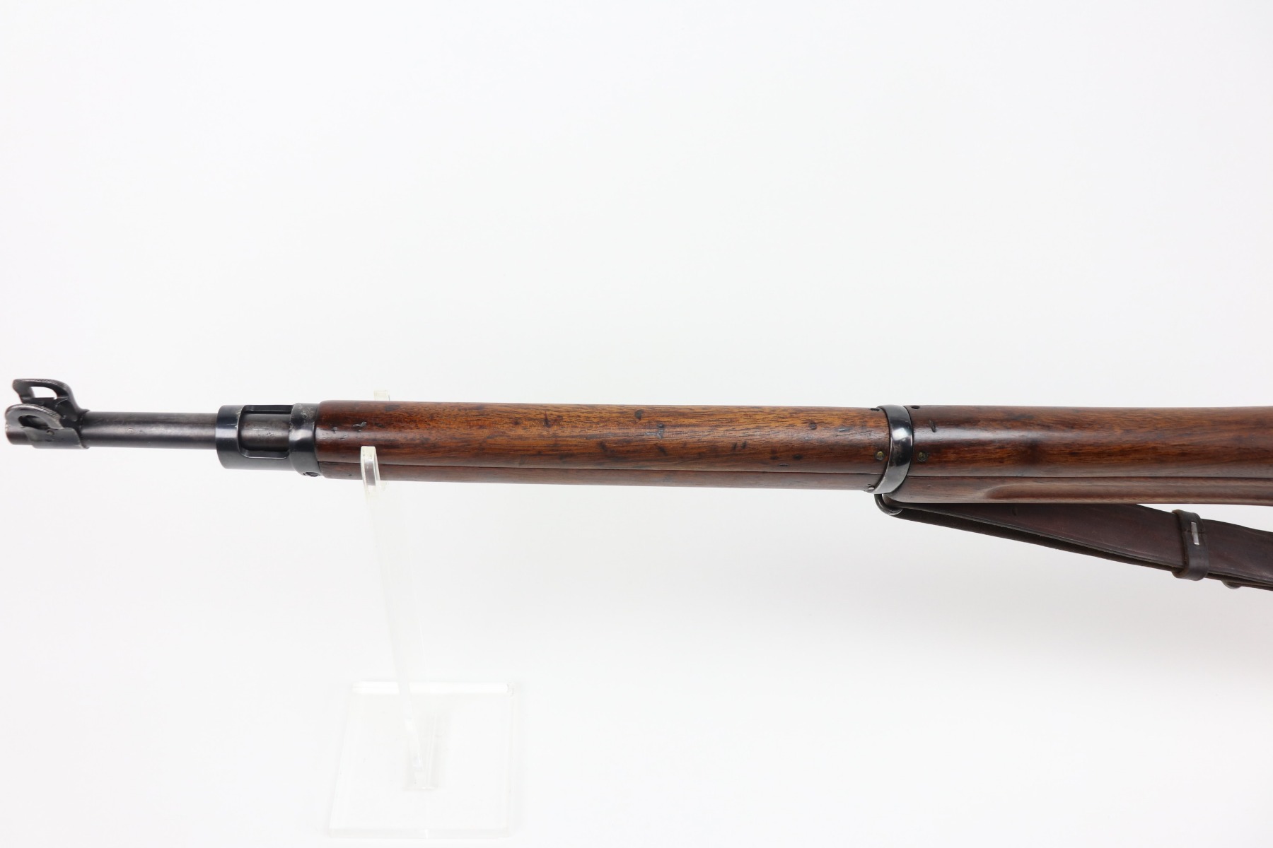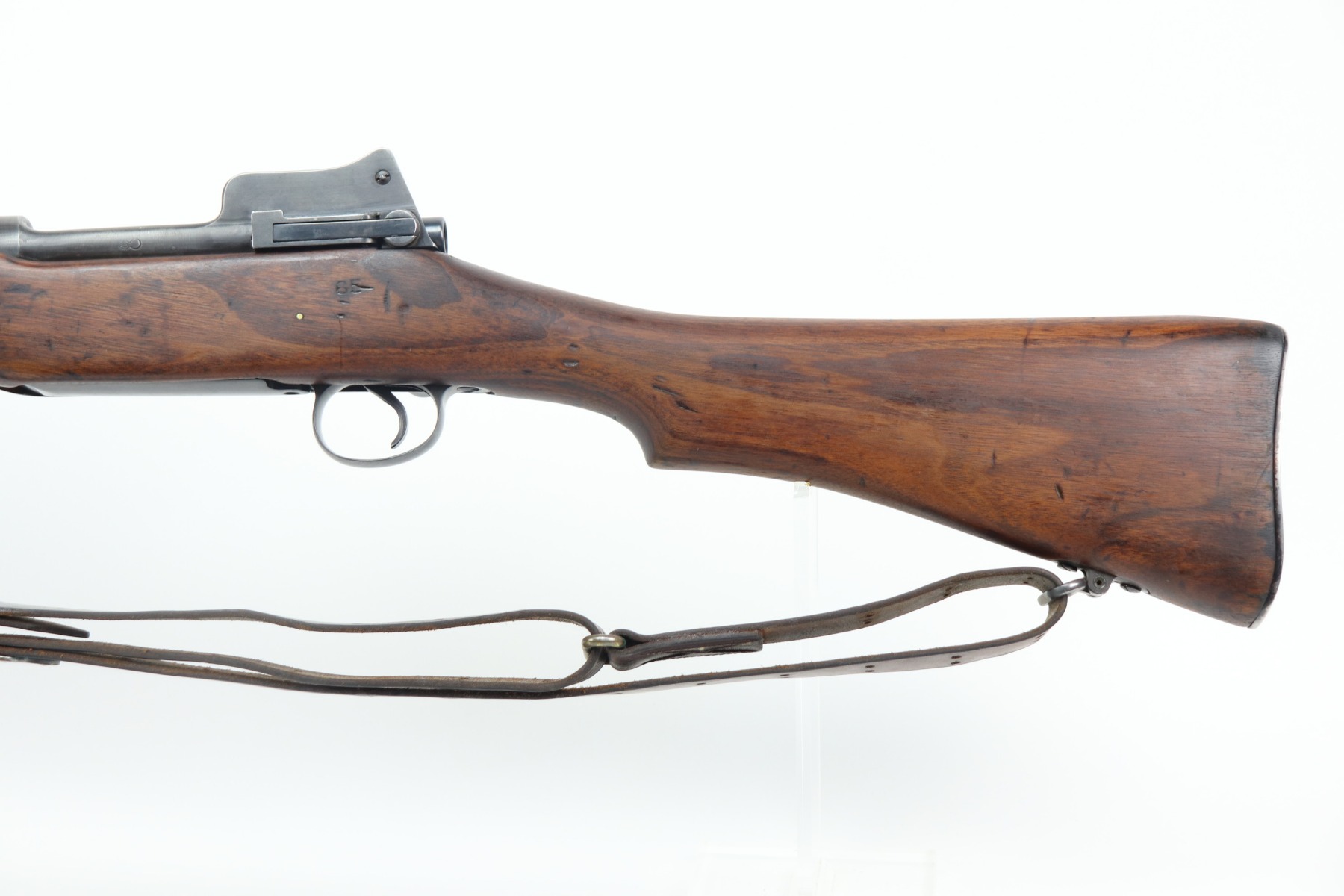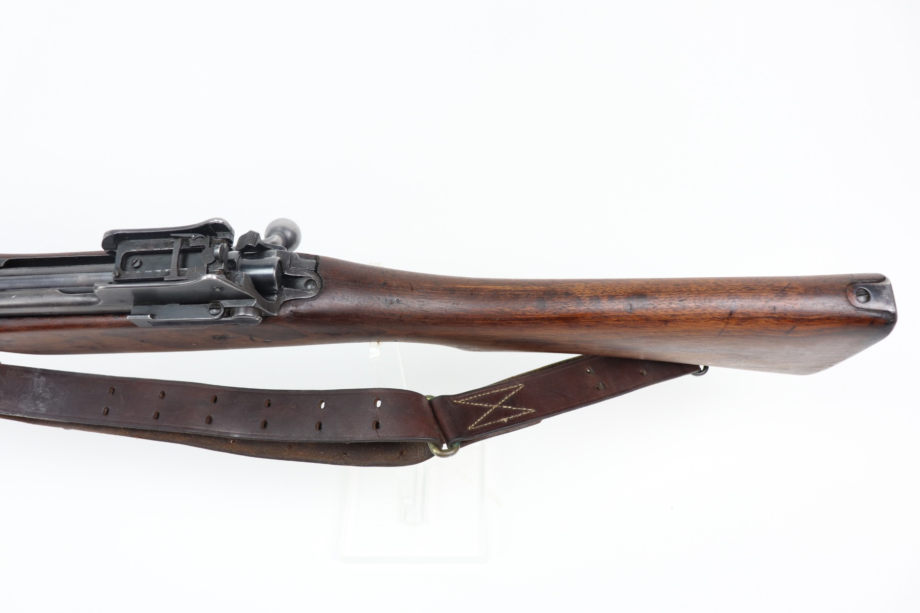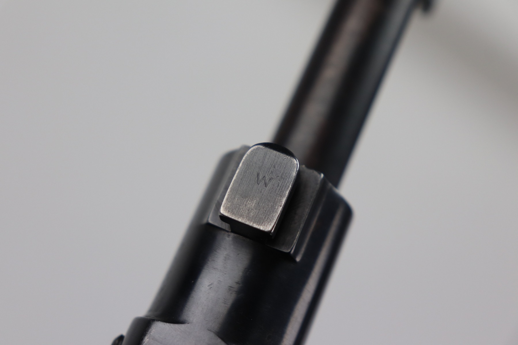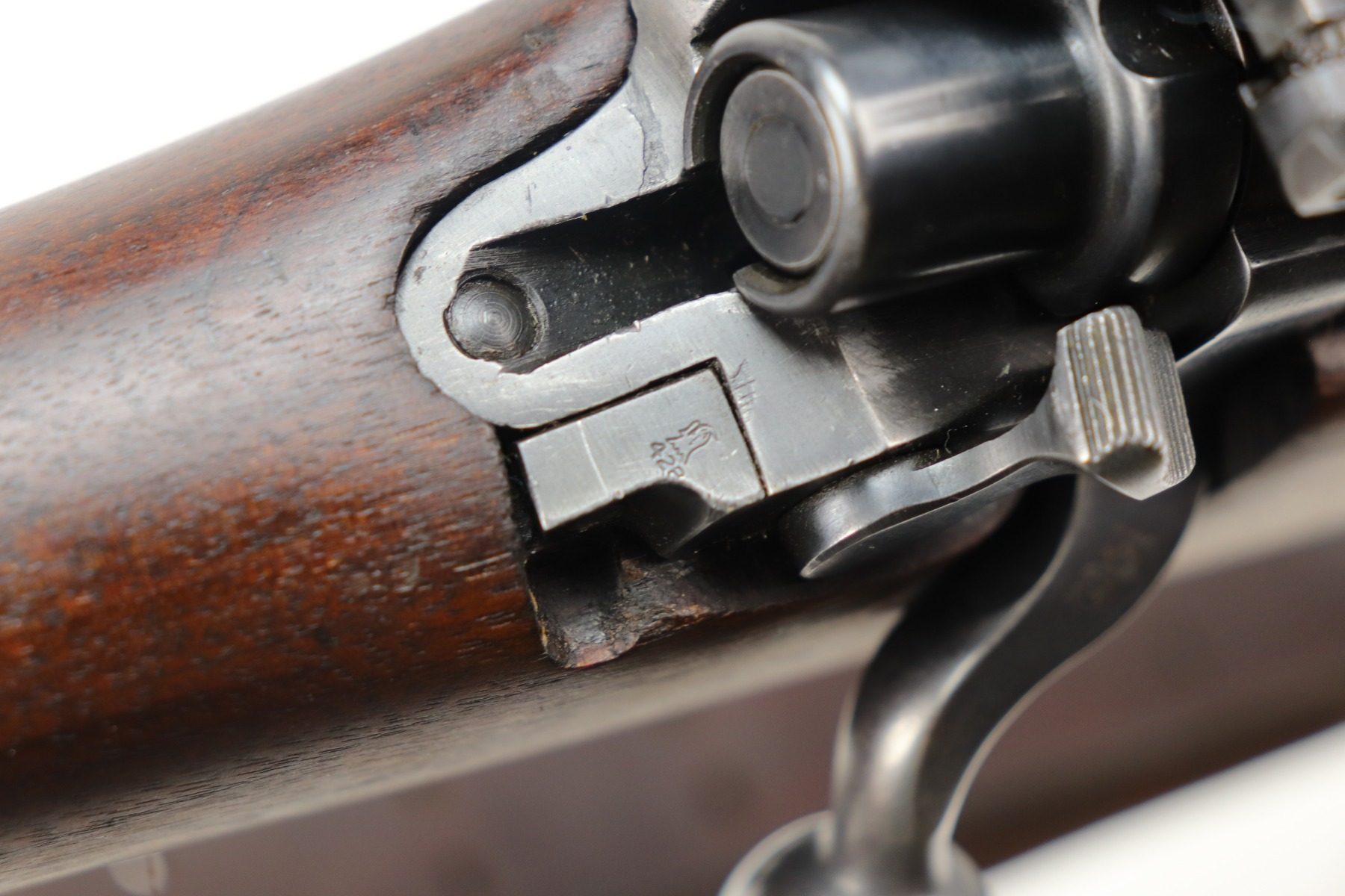 2/22/21 – This is an excellent example of a Winchester Model 1917 issued to the US military in September of 1918. The receiver and barrel have the proper flaming bomb military proofs. We were told the bolt was made by Eddystone. There is a name scratched into the right side of the receiver. Overall, the gun is in excellent condition, but there is minor thinning on the barrel and receiver and spotty discoloration on the barrel bands and floor plate. The stock is very nice but seems to have been lightly sanded at some point. The gun comes with an original sling. The bore is near-mint.