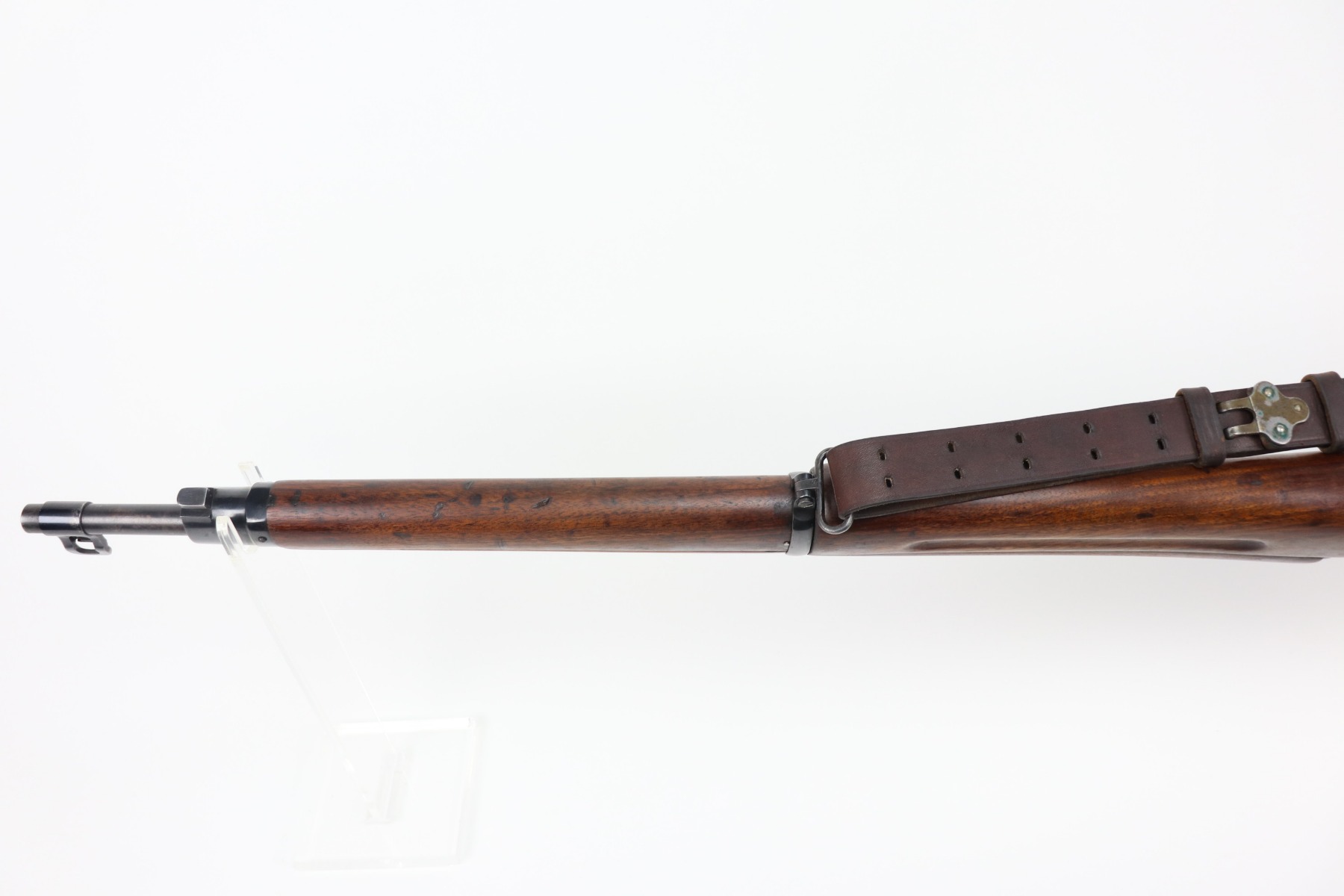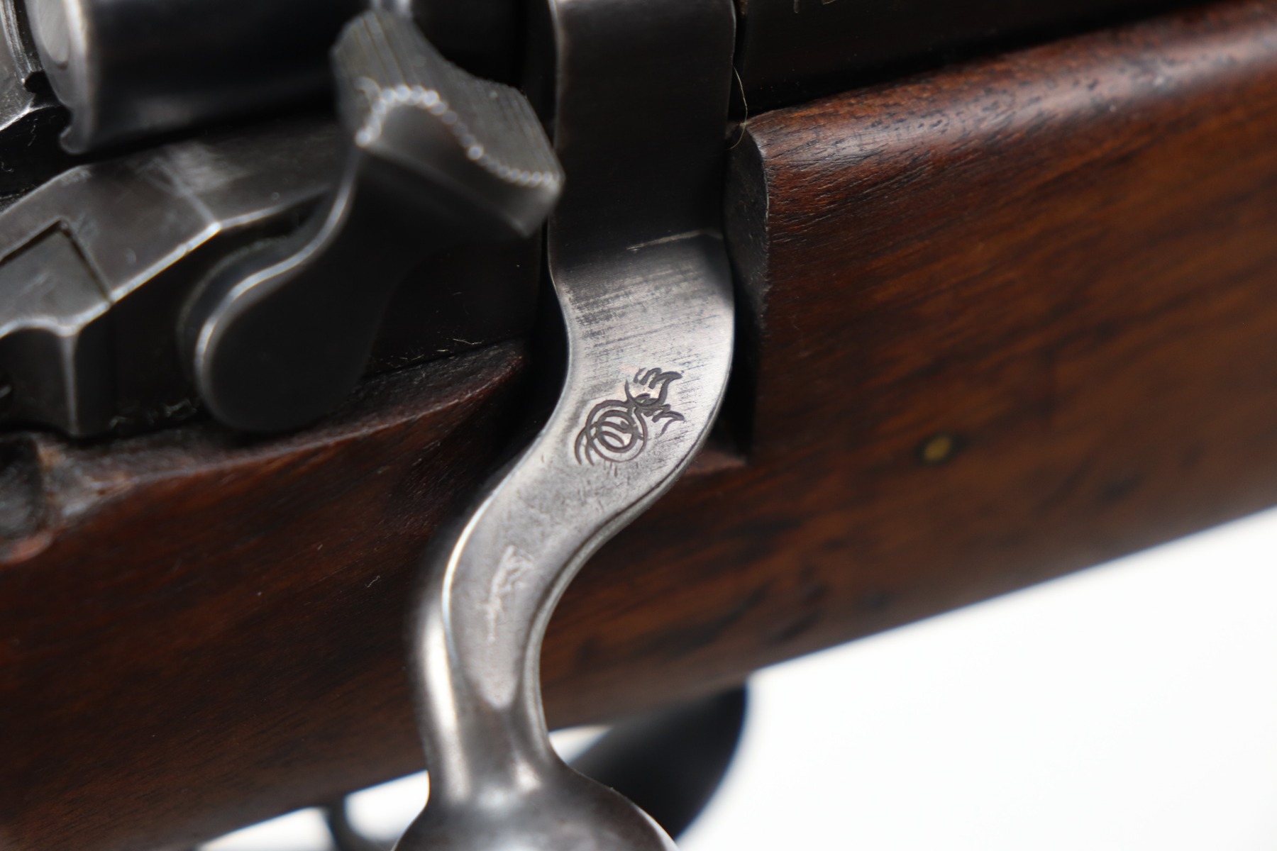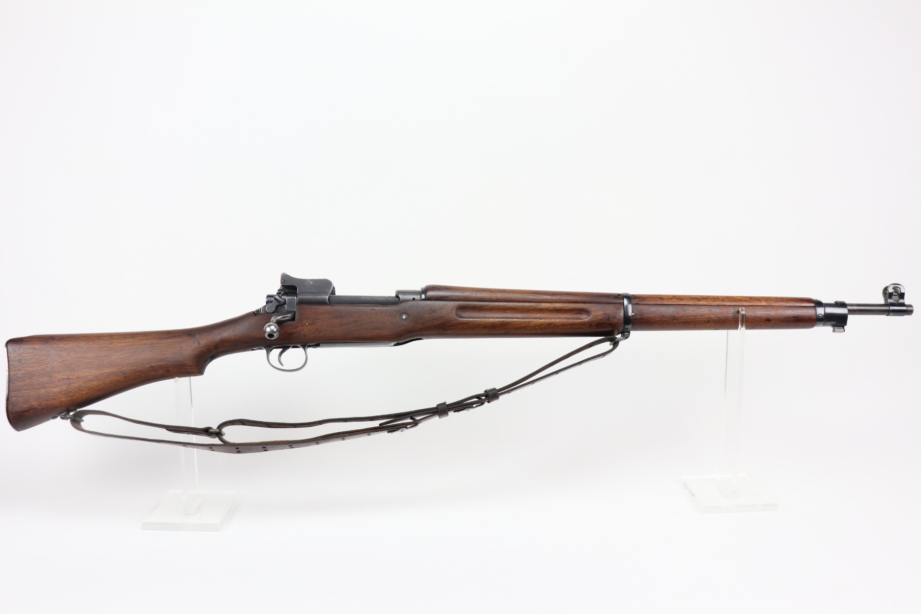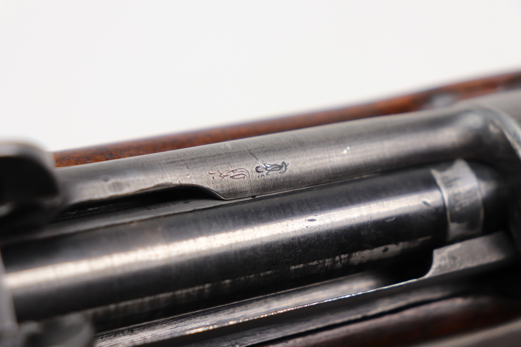 2/22/21 – This is an excellent example of a Winchester Model 1917 issued to the US military in September of 1918. The receiver and barrel have the proper flaming bomb military proofs. We were told the bolt was made by Eddystone. There is a name scratched into the right side of the receiver. Overall, the gun is in excellent condition, but there is minor thinning on the barrel and receiver and spotty discoloration on the barrel bands and floor plate. The stock is very nice but seems to have been lightly sanded at some point. The gun comes with an original sling. The bore is near-mint.