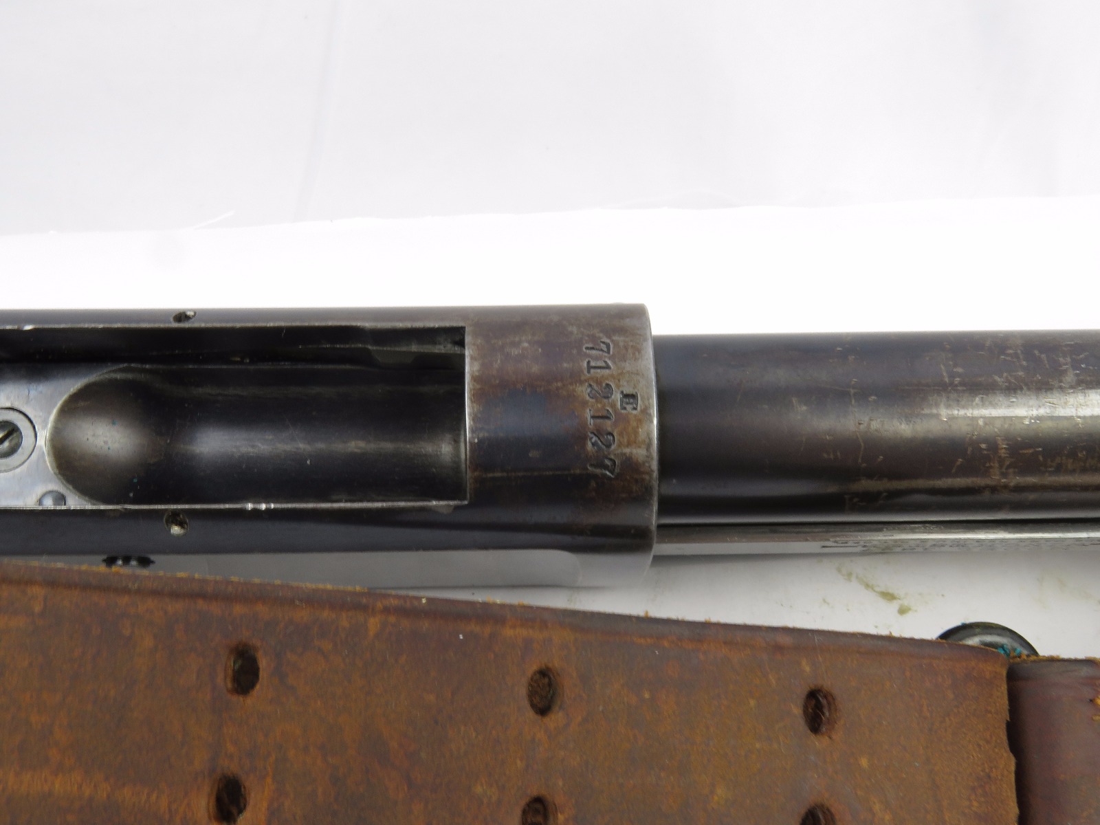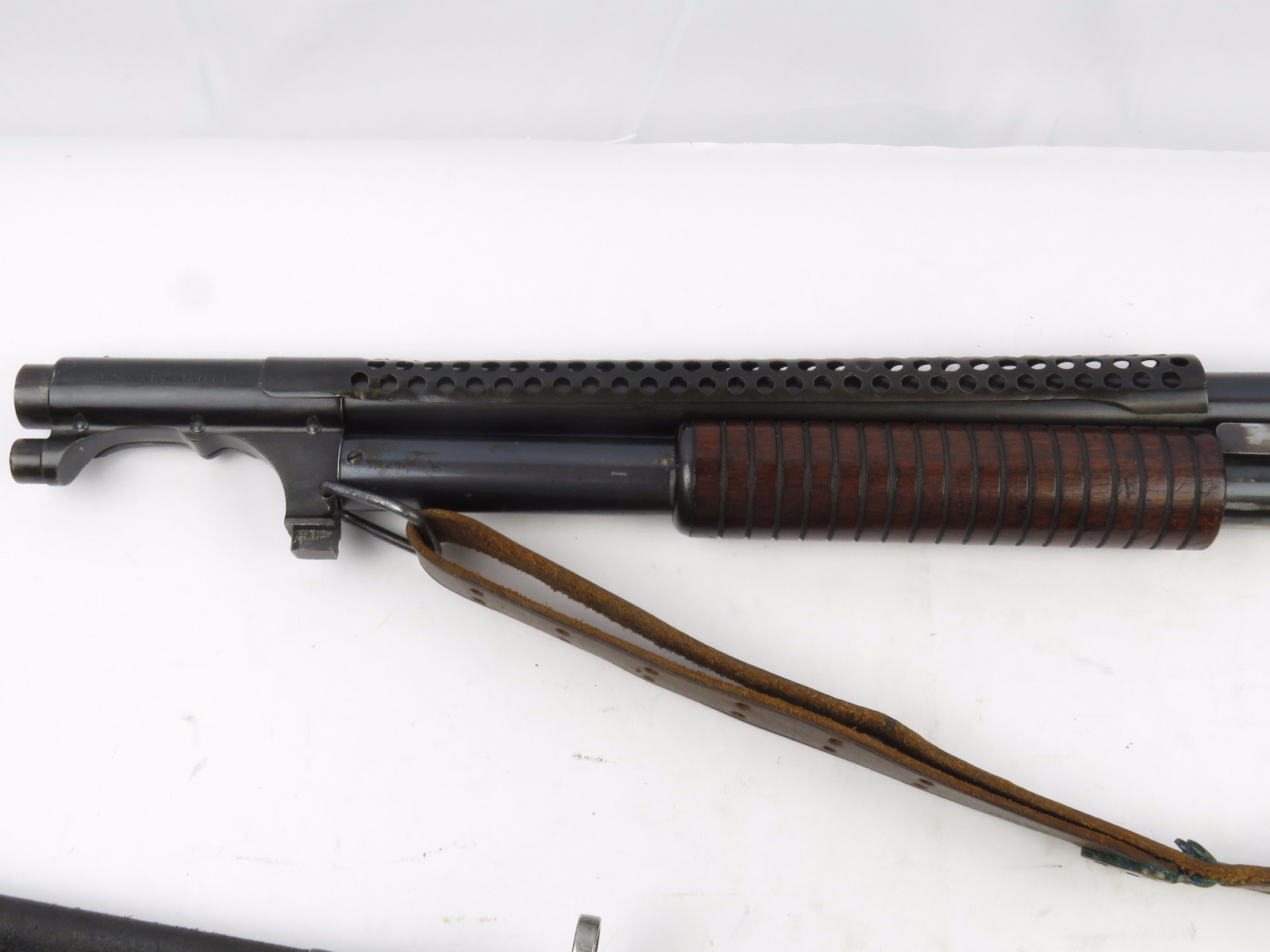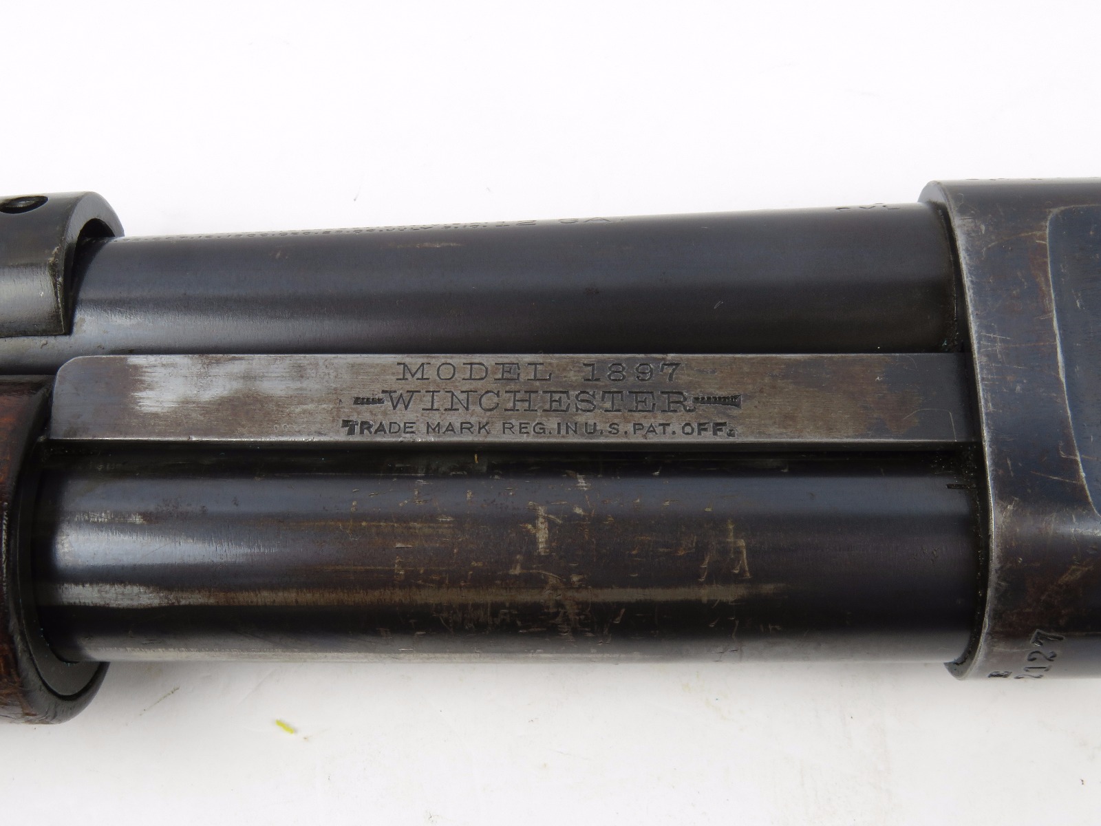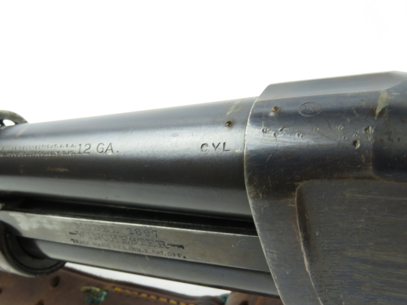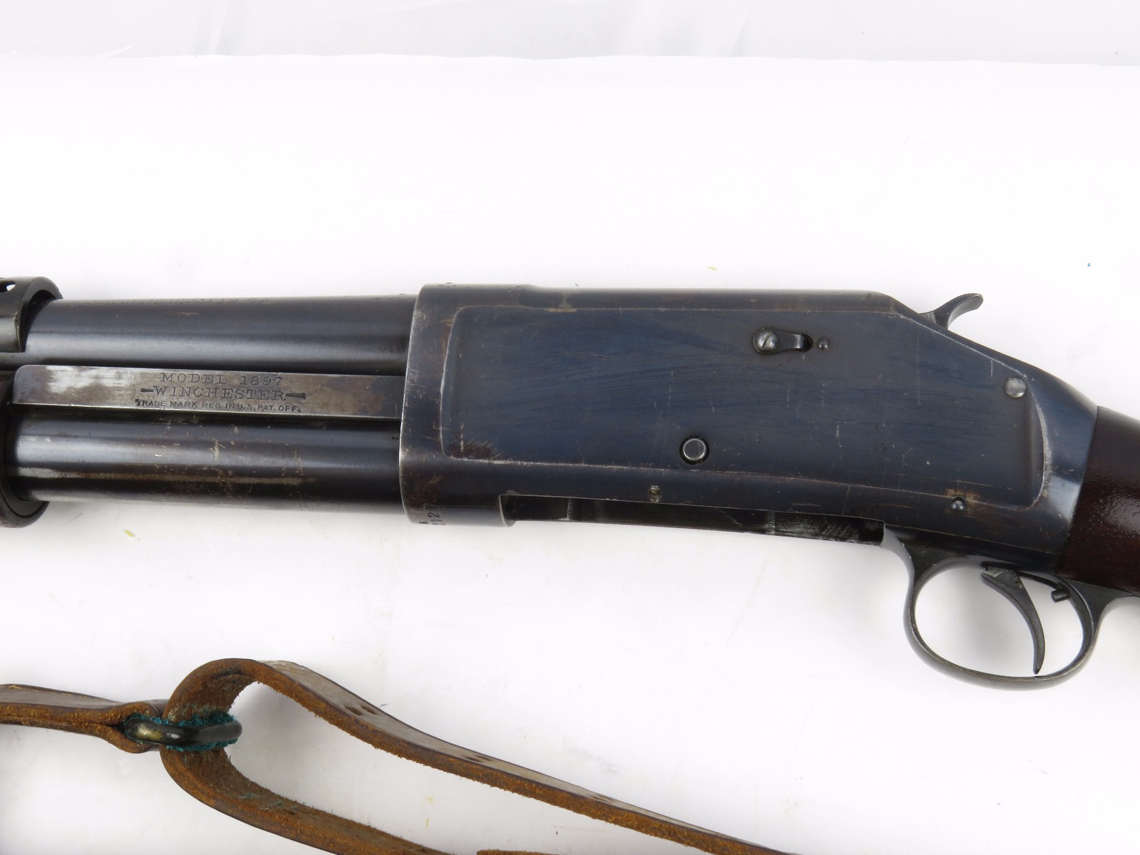9/23/17 – This is an original WW1 era production Winchester model 97 trench shotgun. This shotgun is all original configuration except for the sling, which is WW2 BOYT (1942 production). The bayonet is correct with a stretched leather scabbard and 1917 dated blade. The shotgun stock is high comb and in great condition. There are a few very minor nicks in the wood near the butt end, but this is common. One side of the stock seems to have a faded unit number that was once painted onto the wood. The wood hasn’t been refinished or sanded. The metal parts are all original and excellent. There is no rust or pitting, but some normal patina and light dicoloration around the receiver and ejection port. The biggest flaw is on the top of the receiver where there is a brown area of finish loss. This is nothing too major though, not rust or pitting. The heat shield is correct configuration and excellent condition. Overall a VERY nice WW1 era (early) Winchester model 1897 shotgun.