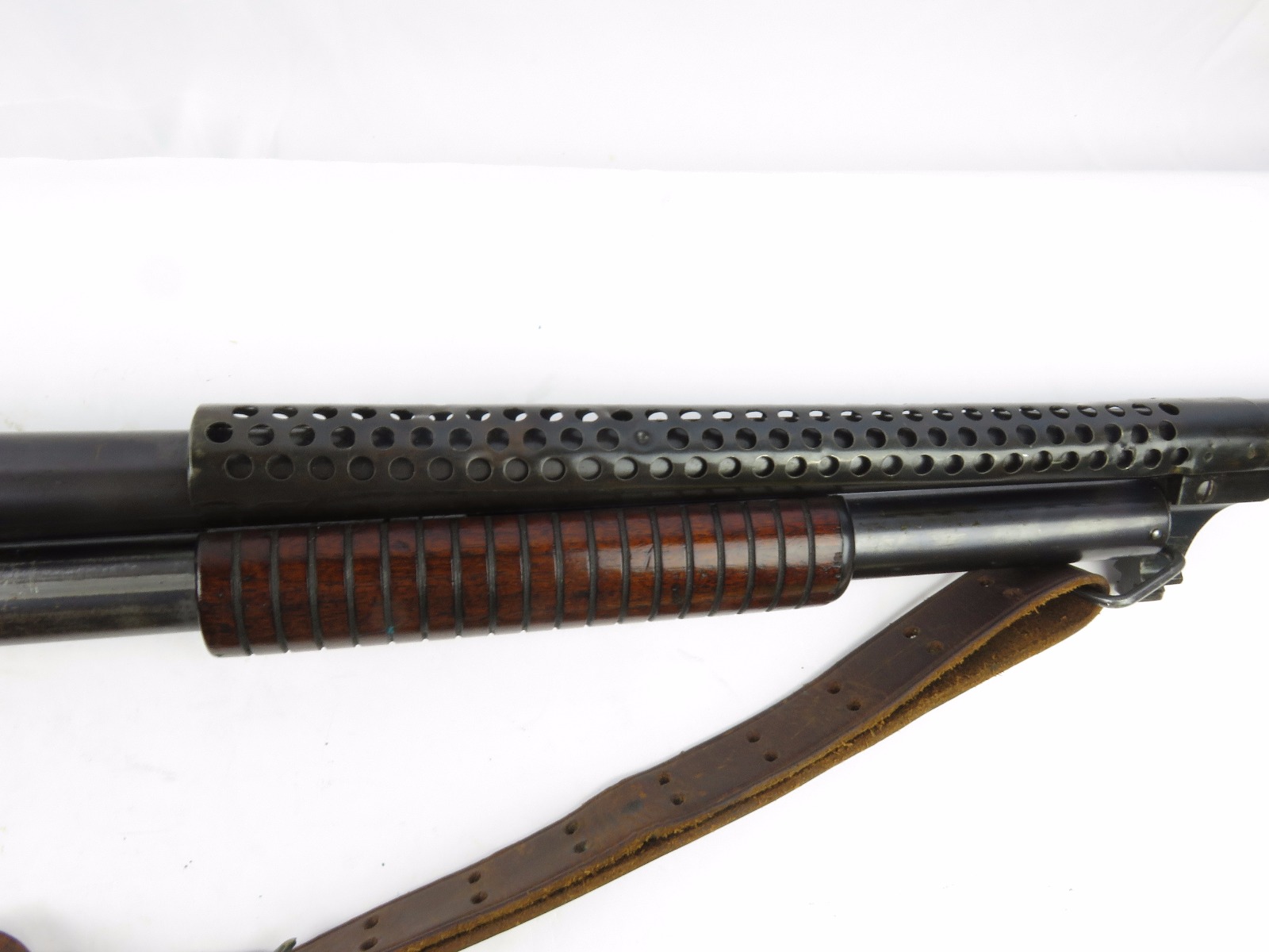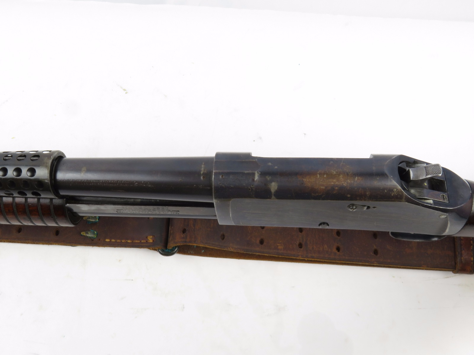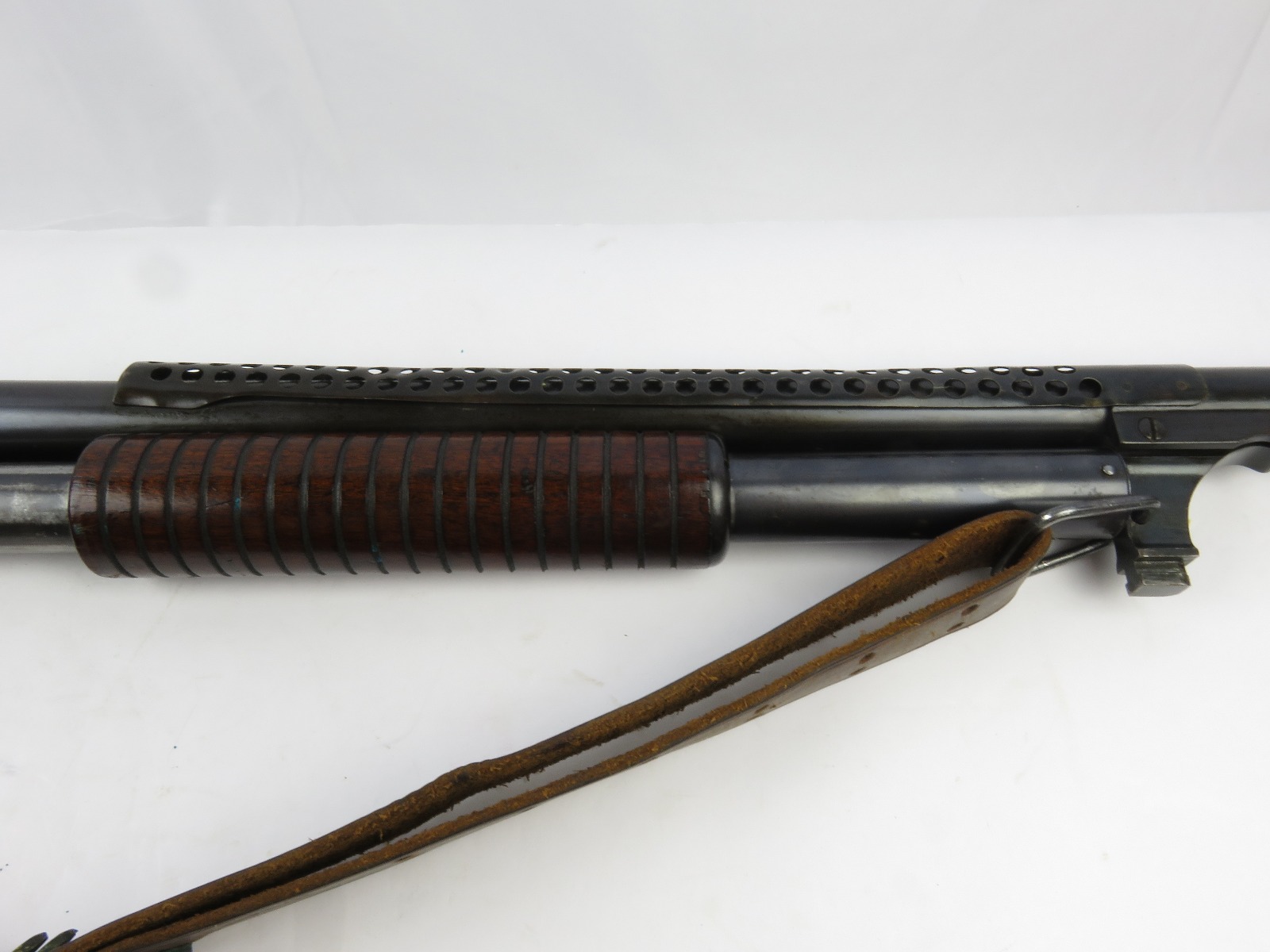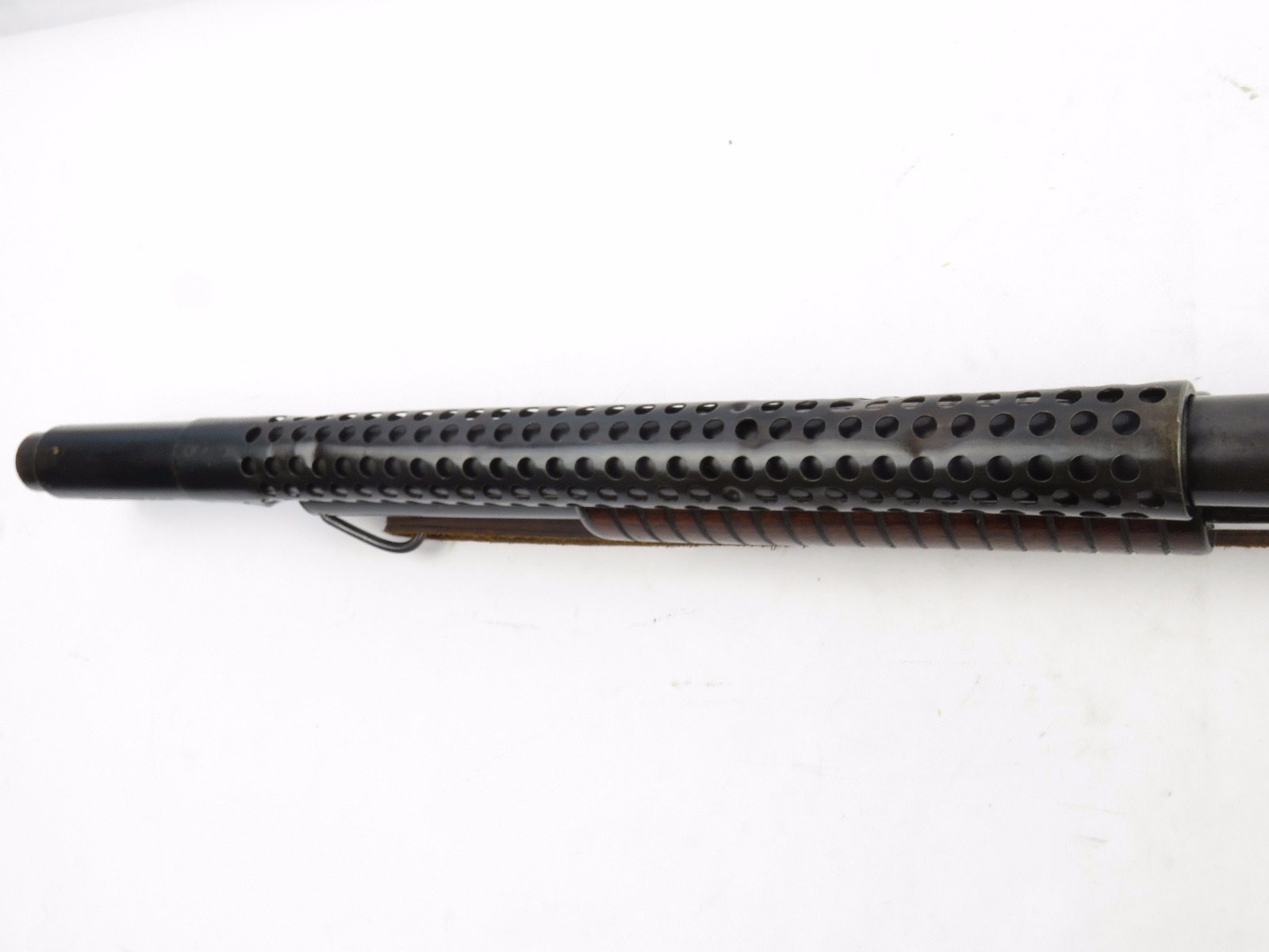 9/23/17 – This is an original WW1 era production Winchester model 97 trench shotgun. This shotgun is all original configuration except for the sling, which is WW2 BOYT (1942 production). The bayonet is correct with a stretched leather scabbard and 1917 dated blade. The shotgun stock is high comb and in great condition. There are a few very minor nicks in the wood near the butt end, but this is common. One side of the stock seems to have a faded unit number that was once painted onto the wood. The wood hasn’t been refinished or sanded. The metal parts are all original and excellent. There is no rust or pitting, but some normal patina and light dicoloration around the receiver and ejection port. The biggest flaw is on the top of the receiver where there is a brown area of finish loss. This is nothing too major though, not rust or pitting. The heat shield is correct configuration and excellent condition. Overall a VERY nice WW1 era (early) Winchester model 1897 shotgun.