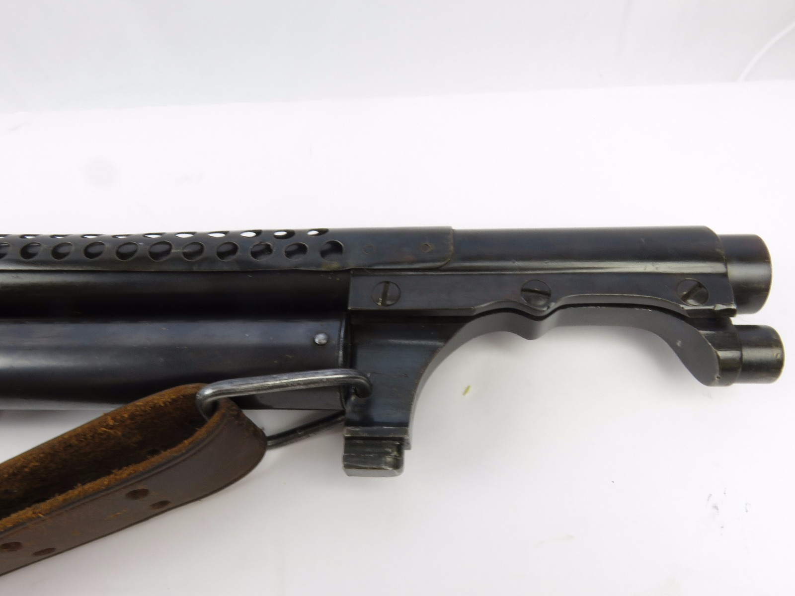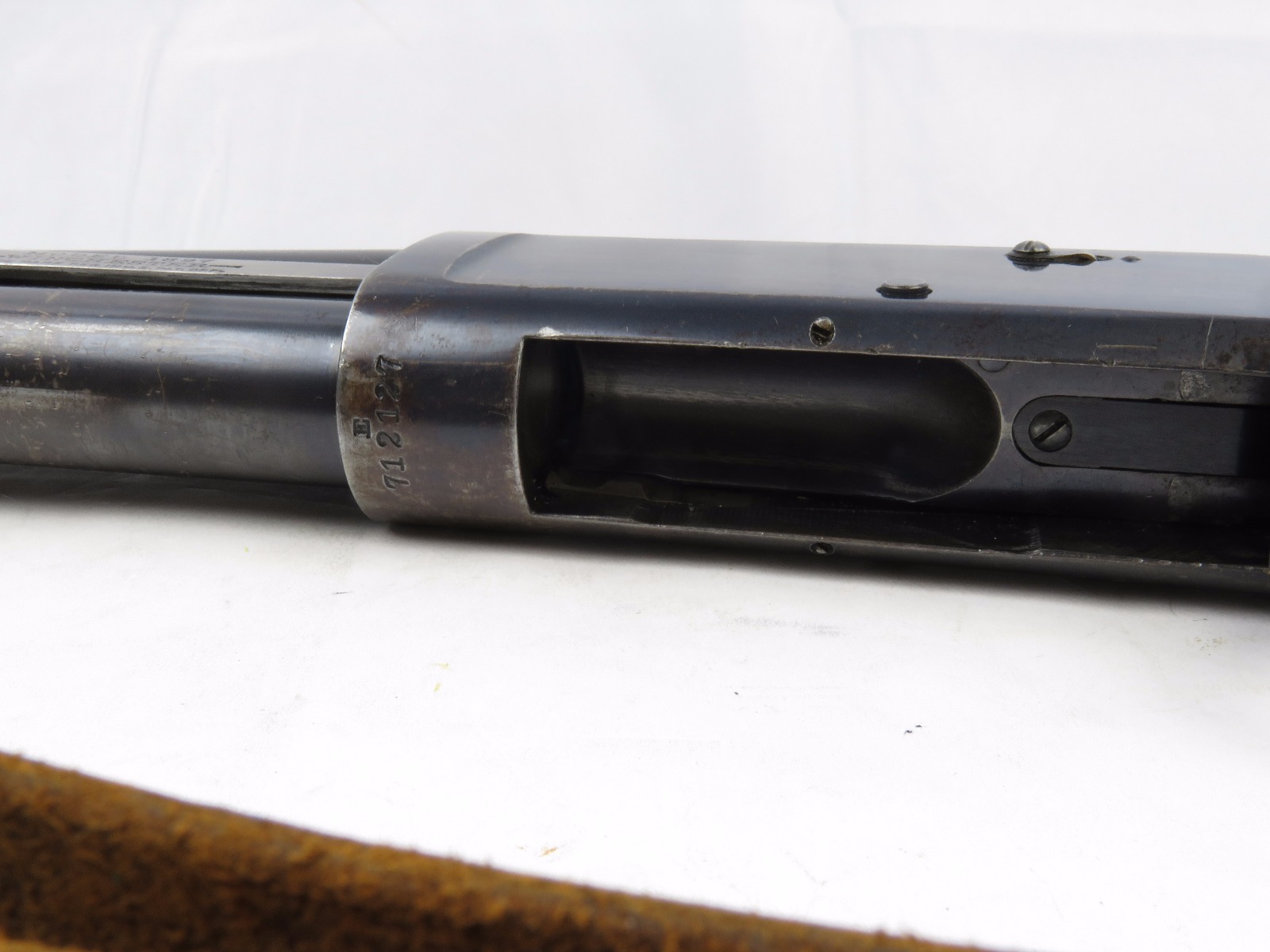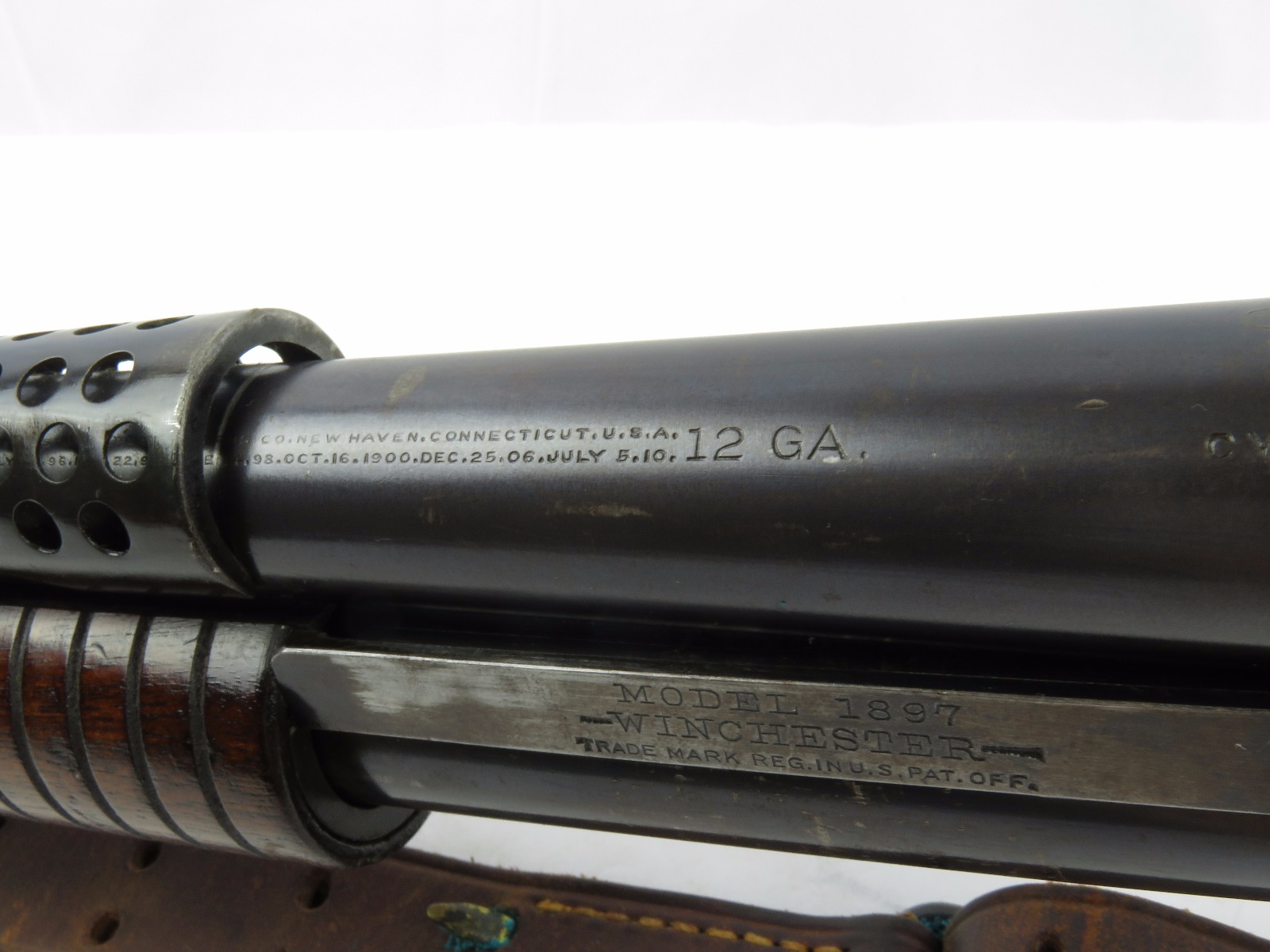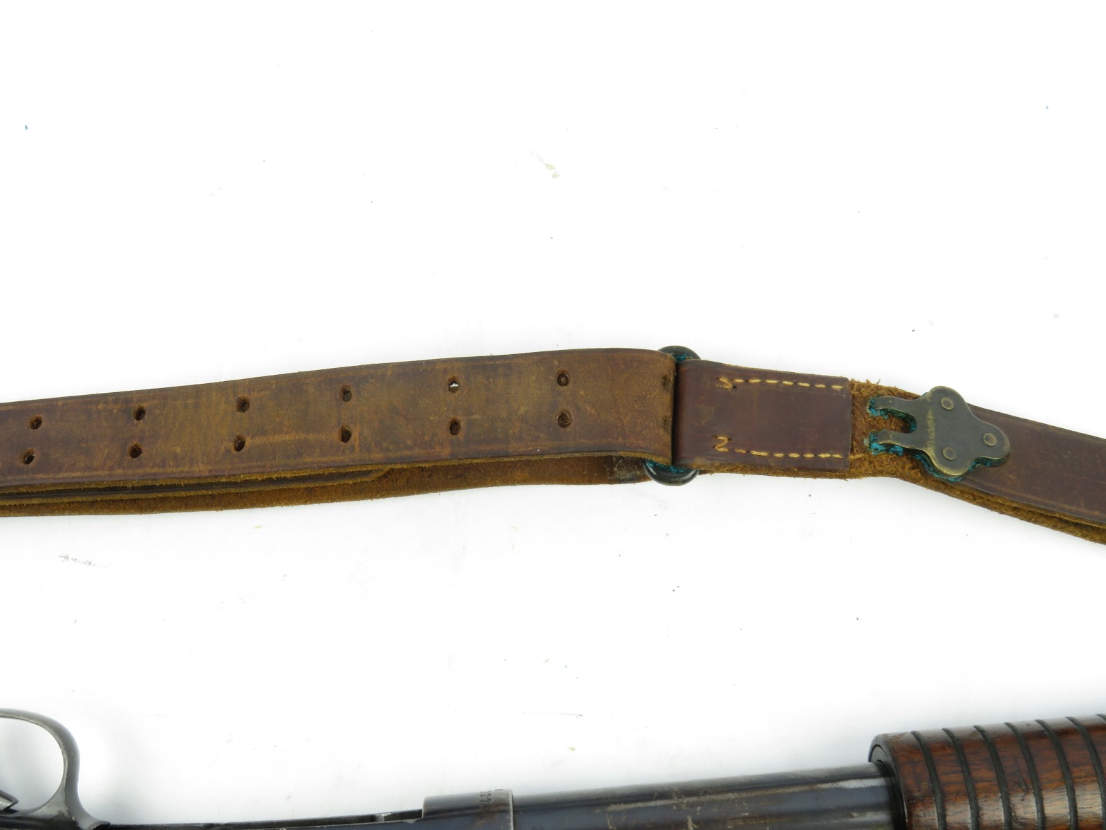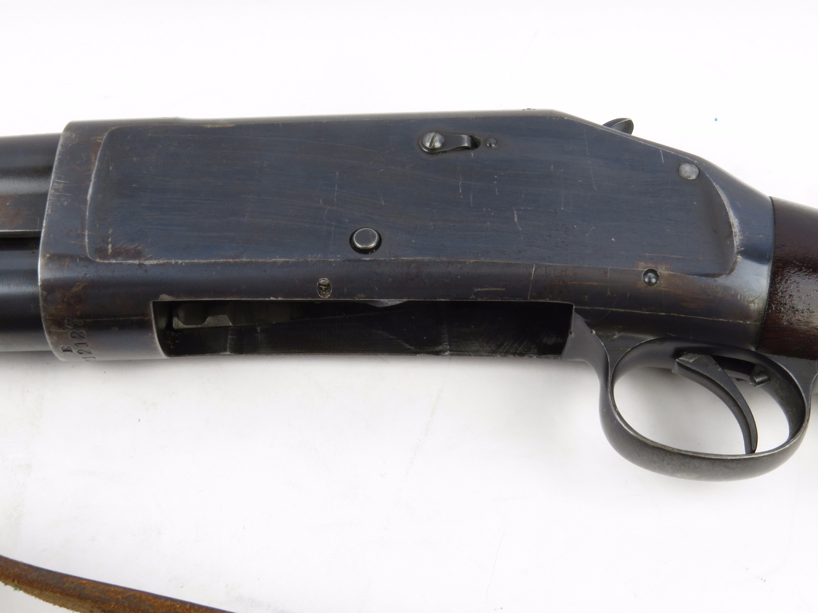 9/23/17 – This is an original WW1 era production Winchester model 97 trench shotgun. This shotgun is all original configuration except for the sling, which is WW2 BOYT (1942 production). The bayonet is correct with a stretched leather scabbard and 1917 dated blade. The shotgun stock is high comb and in great condition. There are a few very minor nicks in the wood near the butt end, but this is common. One side of the stock seems to have a faded unit number that was once painted onto the wood. The wood hasn’t been refinished or sanded. The metal parts are all original and excellent. There is no rust or pitting, but some normal patina and light dicoloration around the receiver and ejection port. The biggest flaw is on the top of the receiver where there is a brown area of finish loss. This is nothing too major though, not rust or pitting. The heat shield is correct configuration and excellent condition. Overall a VERY nice WW1 era (early) Winchester model 1897 shotgun.