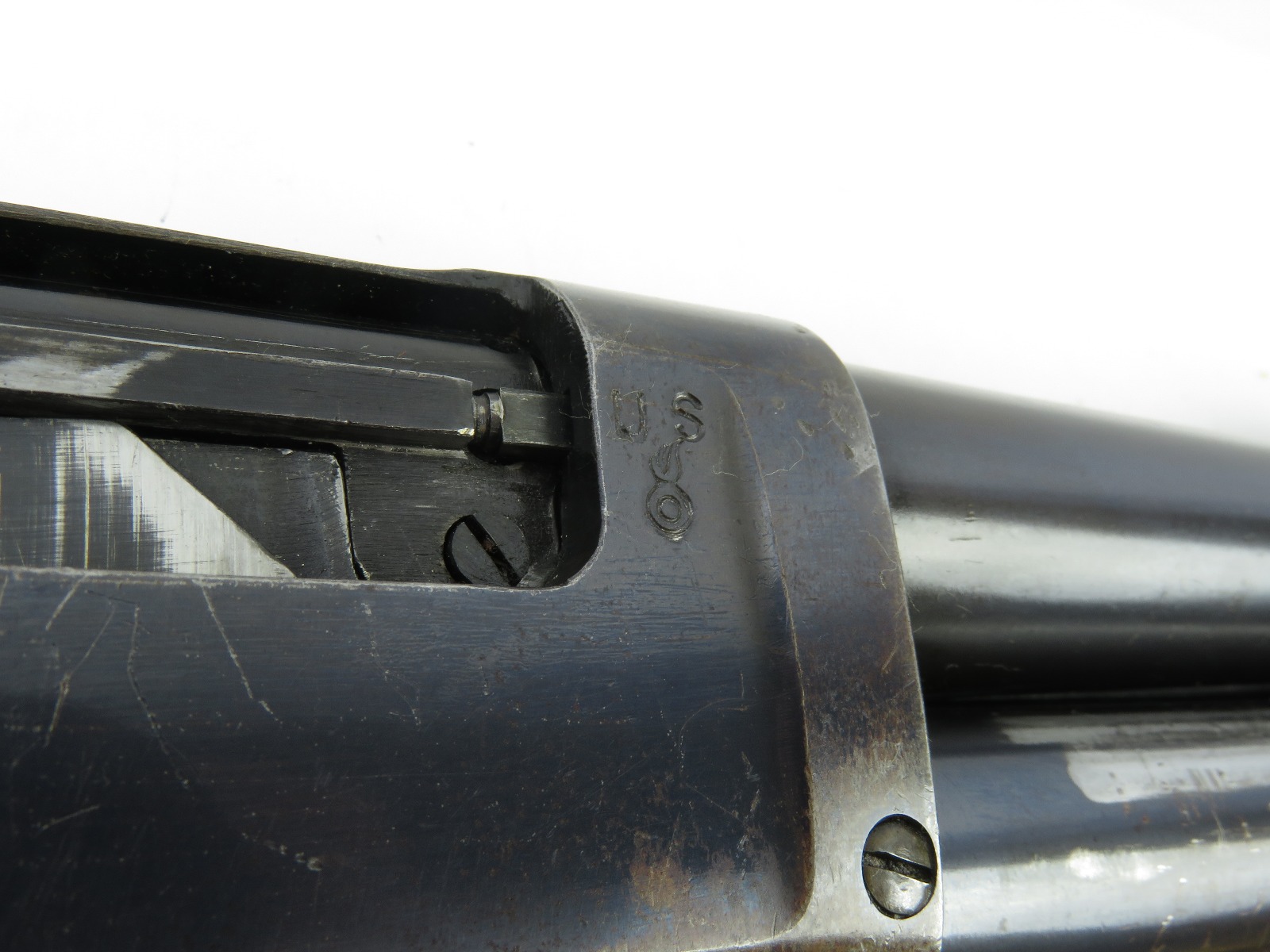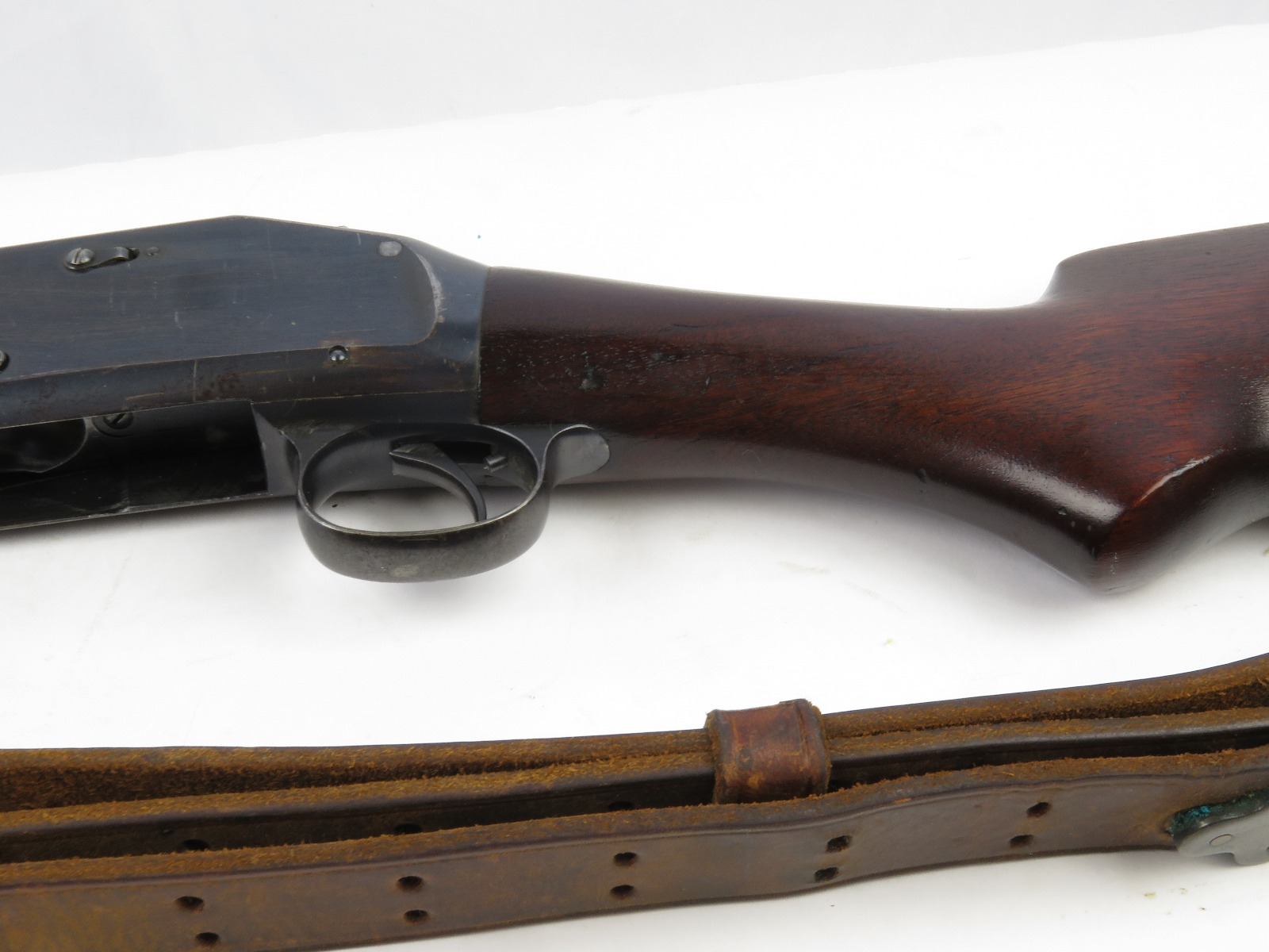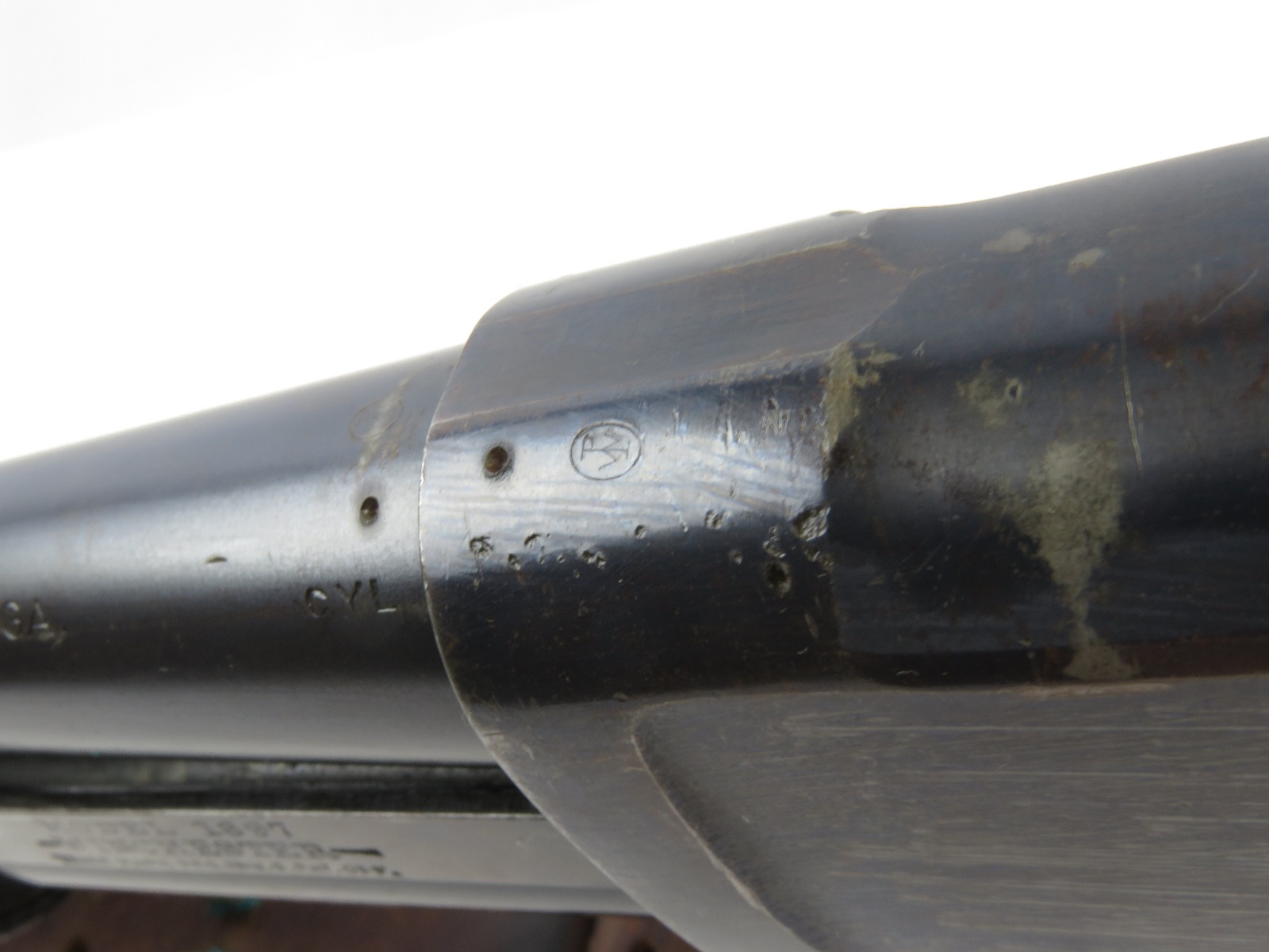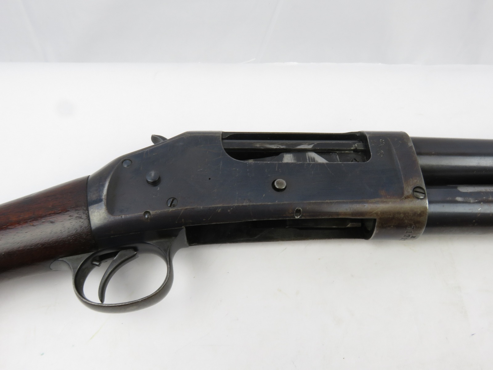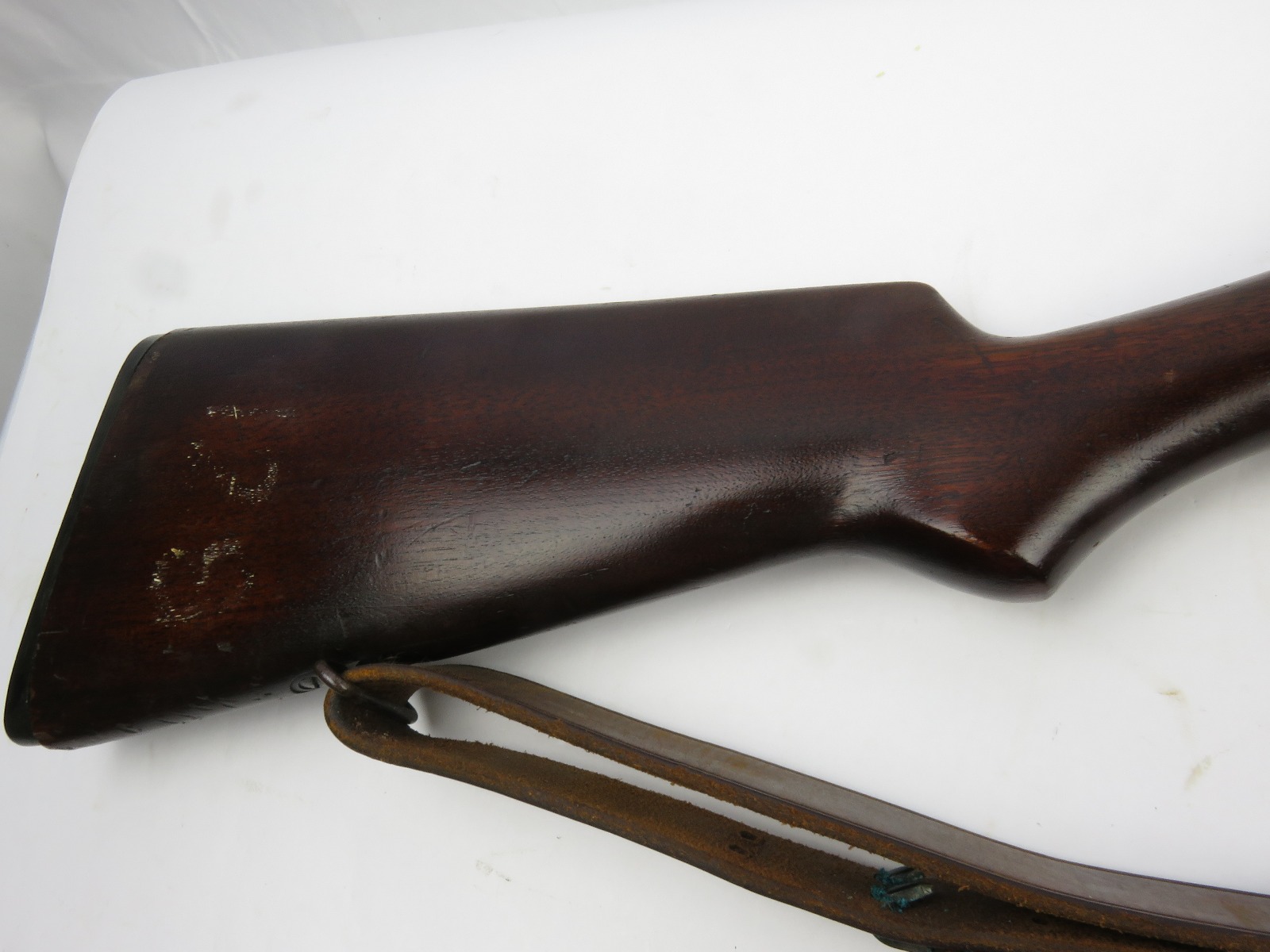 9/23/17 – This is an original WW1 era production Winchester model 97 trench shotgun. This shotgun is all original configuration except for the sling, which is WW2 BOYT (1942 production). The bayonet is correct with a stretched leather scabbard and 1917 dated blade. The shotgun stock is high comb and in great condition. There are a few very minor nicks in the wood near the butt end, but this is common. One side of the stock seems to have a faded unit number that was once painted onto the wood. The wood hasn’t been refinished or sanded. The metal parts are all original and excellent. There is no rust or pitting, but some normal patina and light dicoloration around the receiver and ejection port. The biggest flaw is on the top of the receiver where there is a brown area of finish loss. This is nothing too major though, not rust or pitting. The heat shield is correct configuration and excellent condition. Overall a VERY nice WW1 era (early) Winchester model 1897 shotgun.