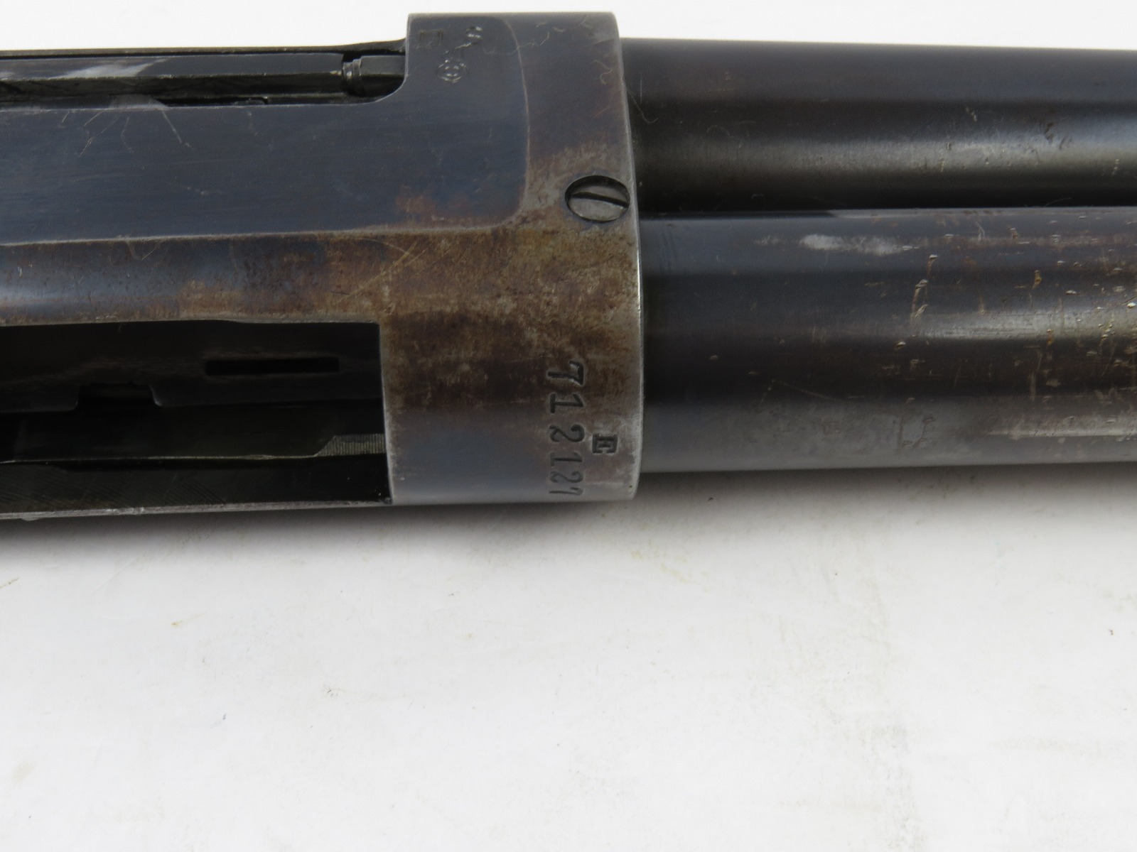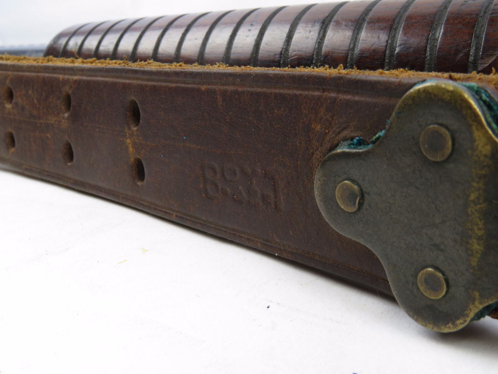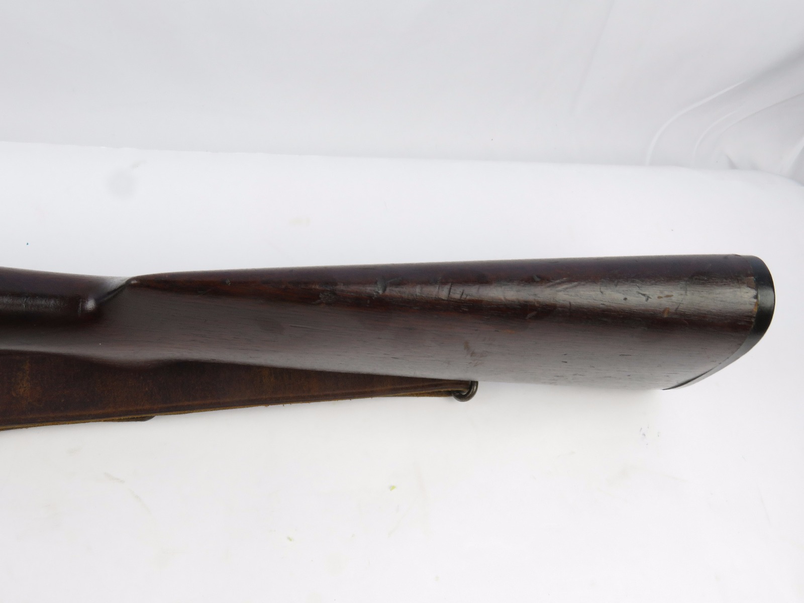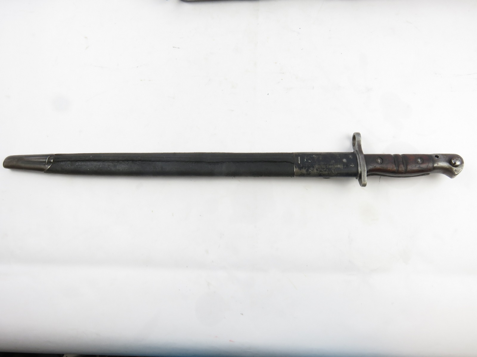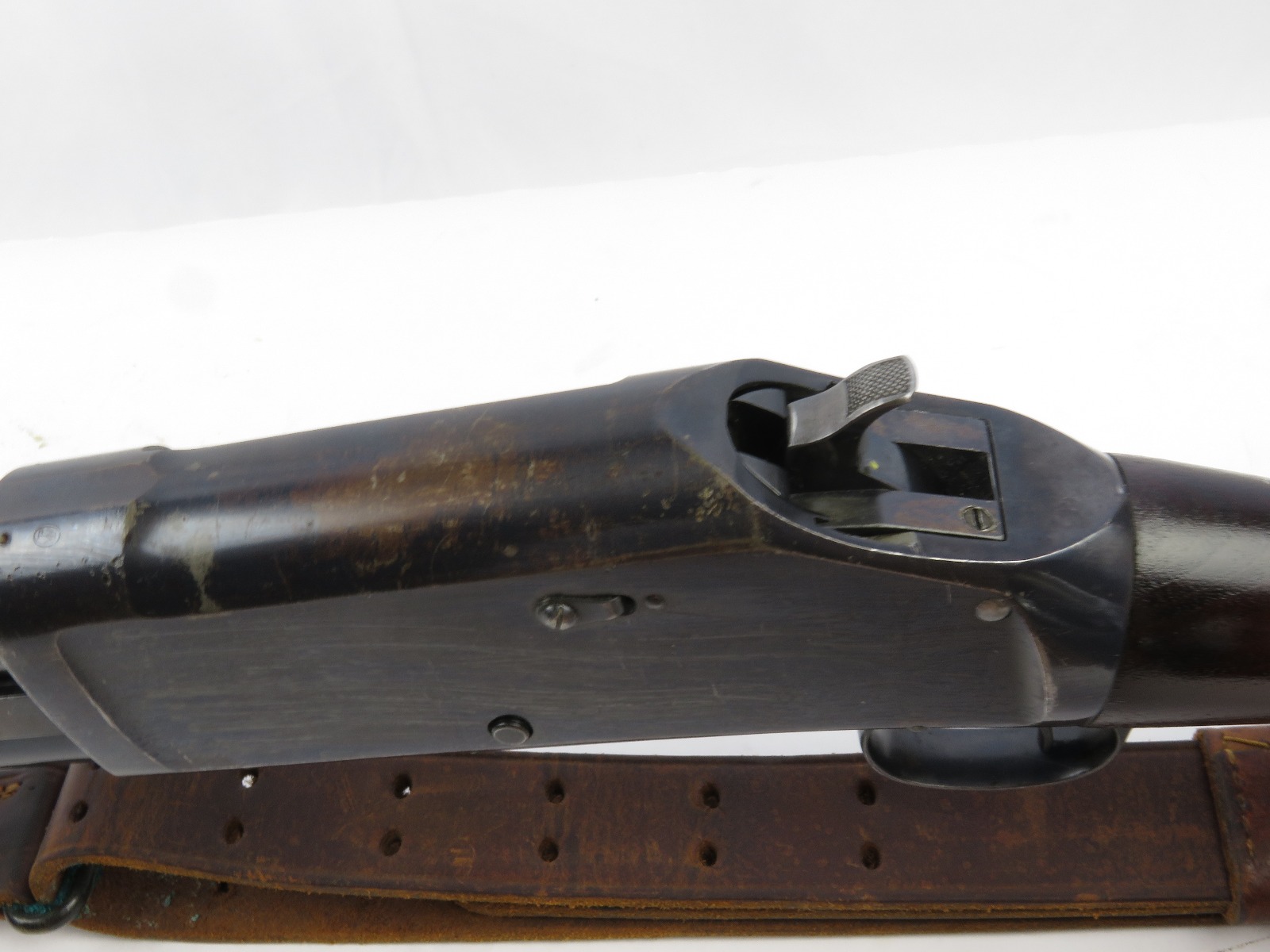 9/23/17 – This is an original WW1 era production Winchester model 97 trench shotgun. This shotgun is all original configuration except for the sling, which is WW2 BOYT (1942 production). The bayonet is correct with a stretched leather scabbard and 1917 dated blade. The shotgun stock is high comb and in great condition. There are a few very minor nicks in the wood near the butt end, but this is common. One side of the stock seems to have a faded unit number that was once painted onto the wood. The wood hasn’t been refinished or sanded. The metal parts are all original and excellent. There is no rust or pitting, but some normal patina and light dicoloration around the receiver and ejection port. The biggest flaw is on the top of the receiver where there is a brown area of finish loss. This is nothing too major though, not rust or pitting. The heat shield is correct configuration and excellent condition. Overall a VERY nice WW1 era (early) Winchester model 1897 shotgun.