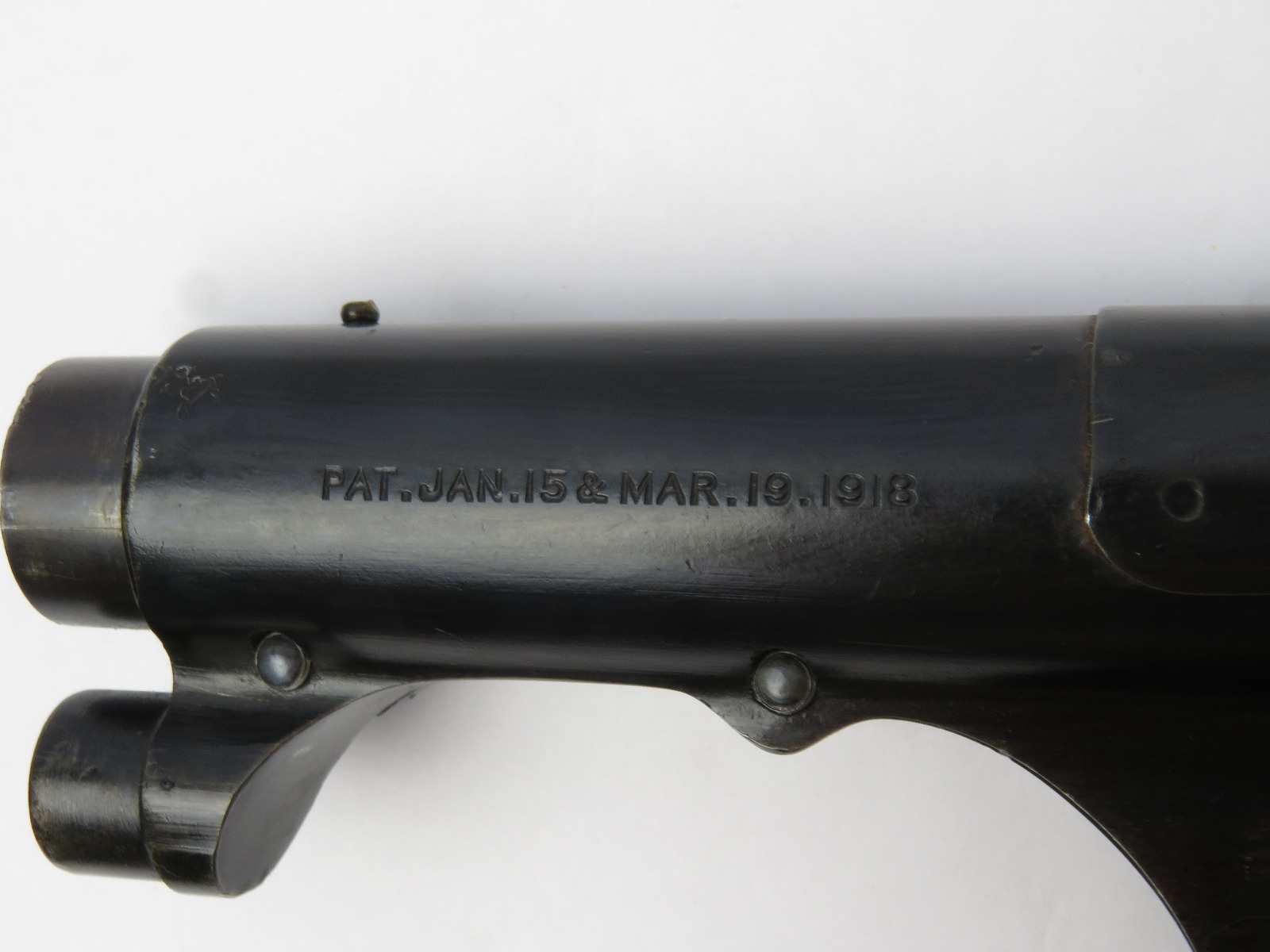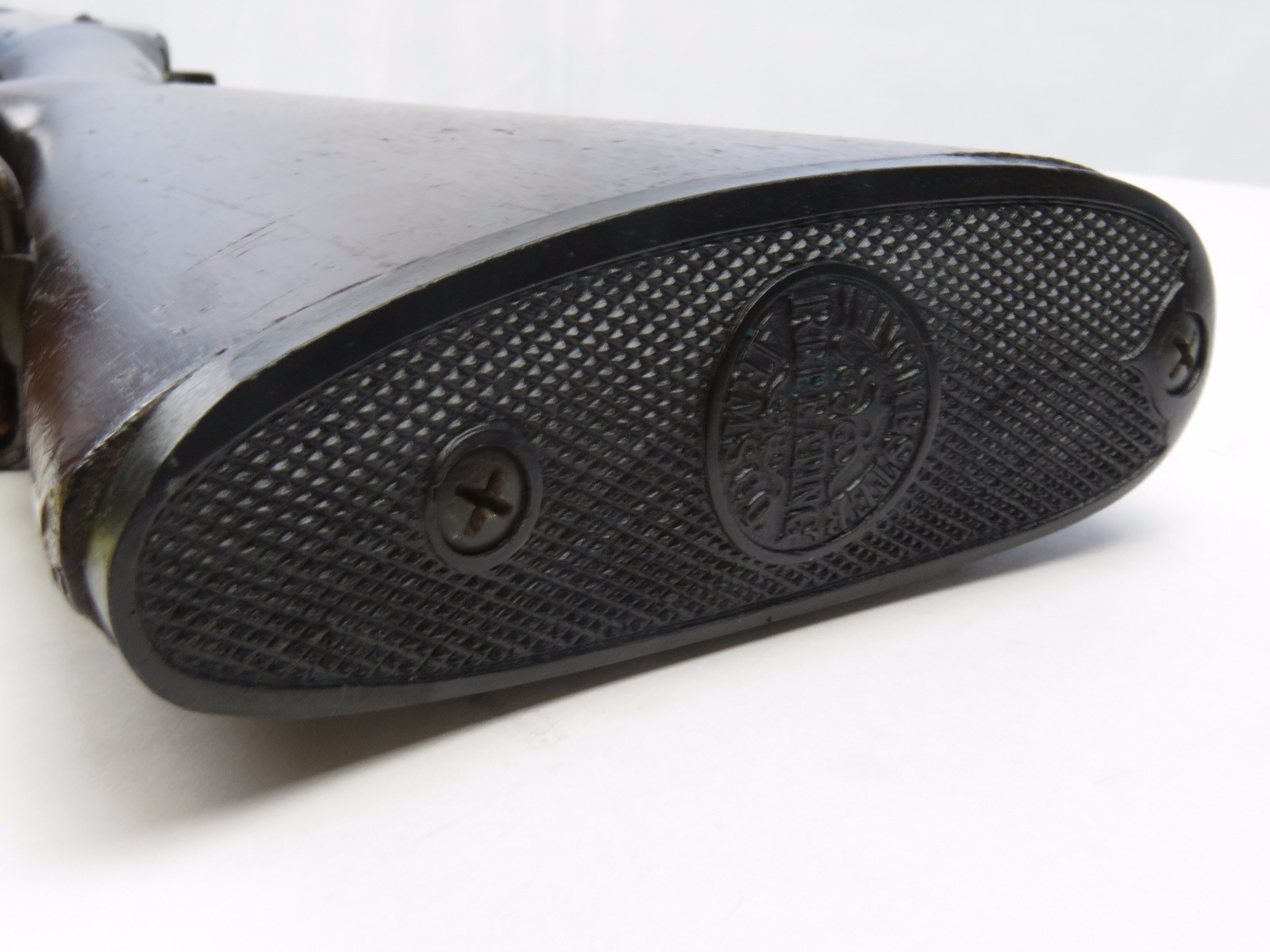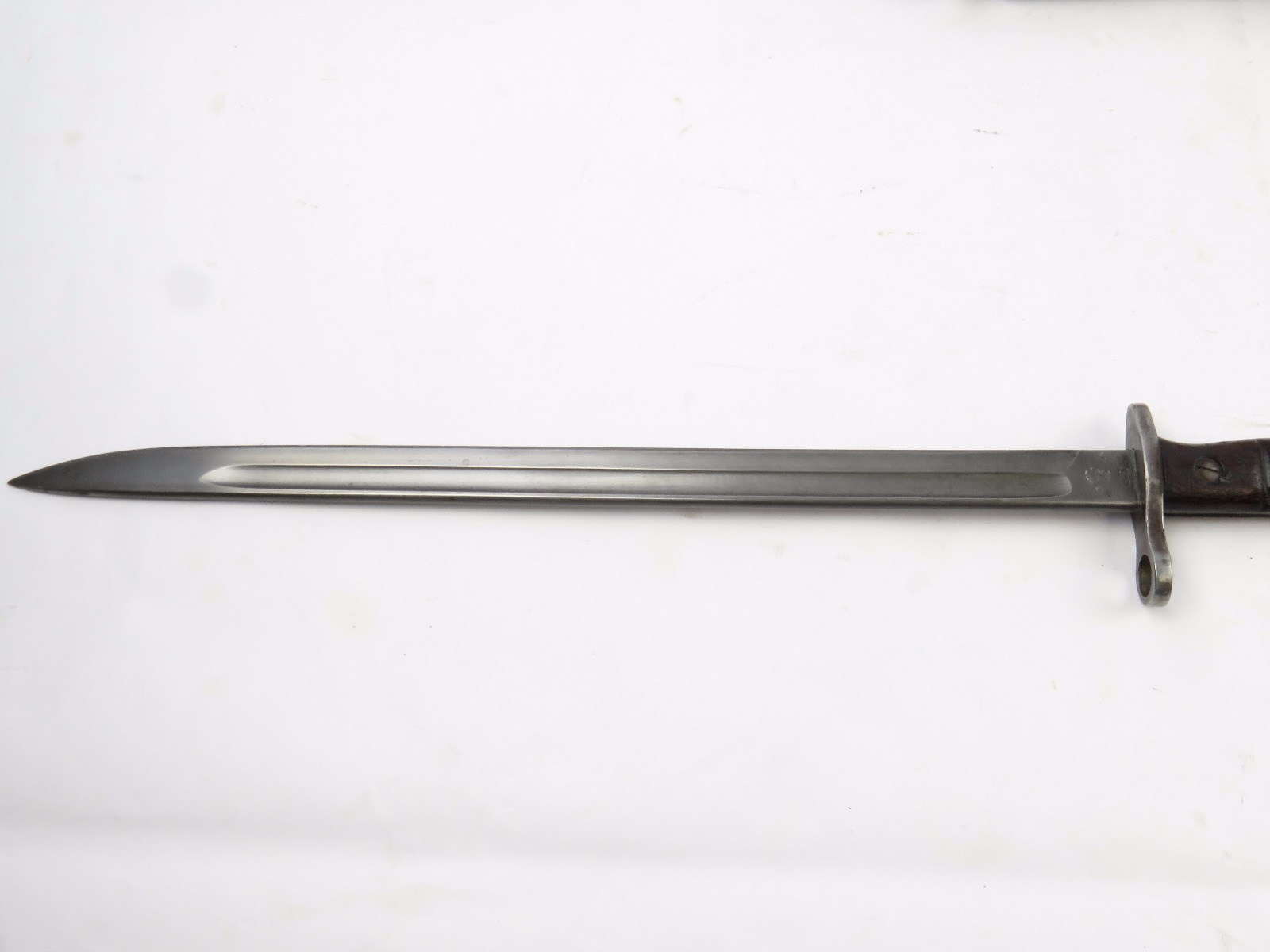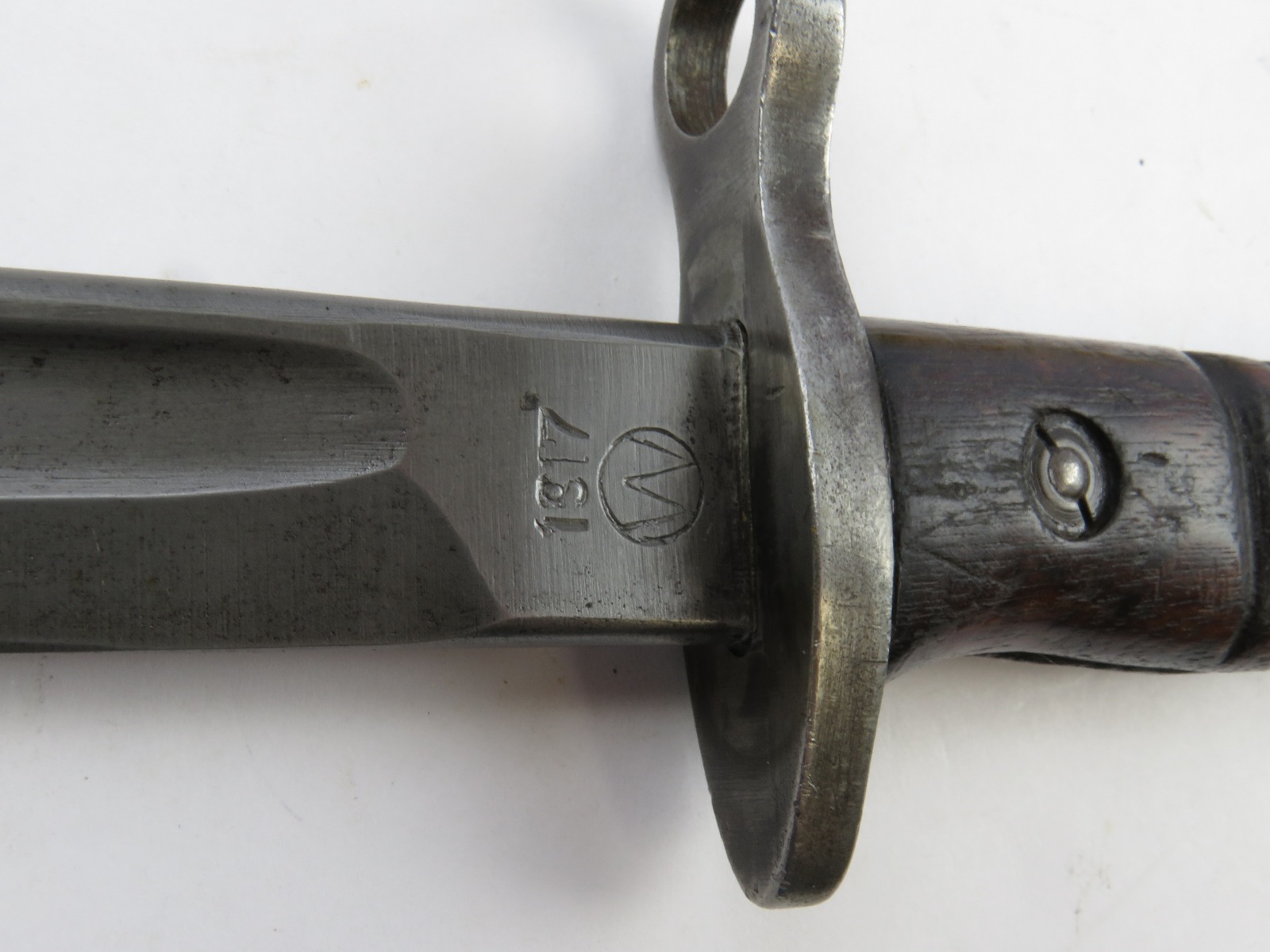 9/23/17 – This is an original WW1 era production Winchester model 97 trench shotgun. This shotgun is all original configuration except for the sling, which is WW2 BOYT (1942 production). The bayonet is correct with a stretched leather scabbard and 1917 dated blade. The shotgun stock is high comb and in great condition. There are a few very minor nicks in the wood near the butt end, but this is common. One side of the stock seems to have a faded unit number that was once painted onto the wood. The wood hasn’t been refinished or sanded. The metal parts are all original and excellent. There is no rust or pitting, but some normal patina and light dicoloration around the receiver and ejection port. The biggest flaw is on the top of the receiver where there is a brown area of finish loss. This is nothing too major though, not rust or pitting. The heat shield is correct configuration and excellent condition. Overall a VERY nice WW1 era (early) Winchester model 1897 shotgun.