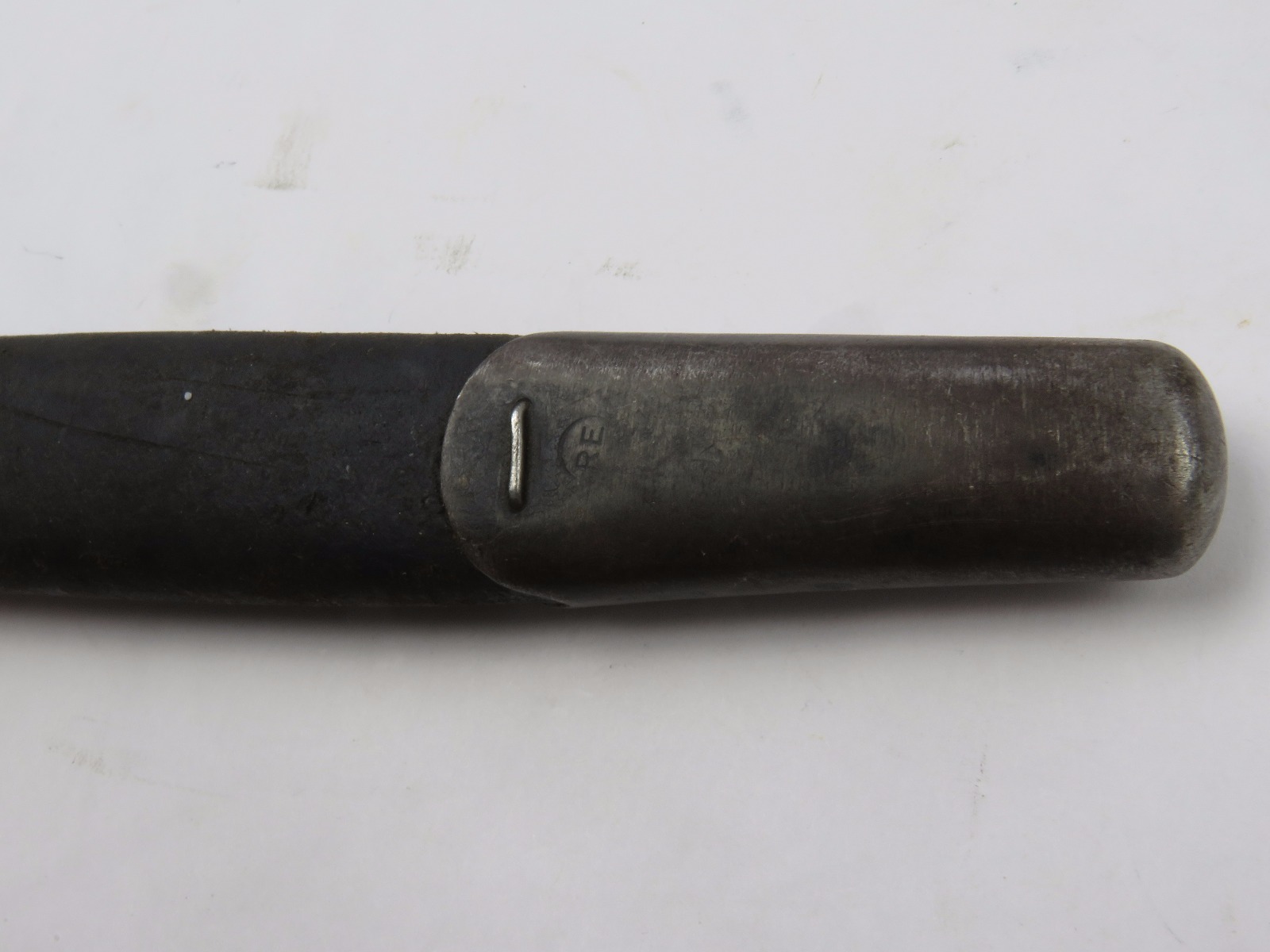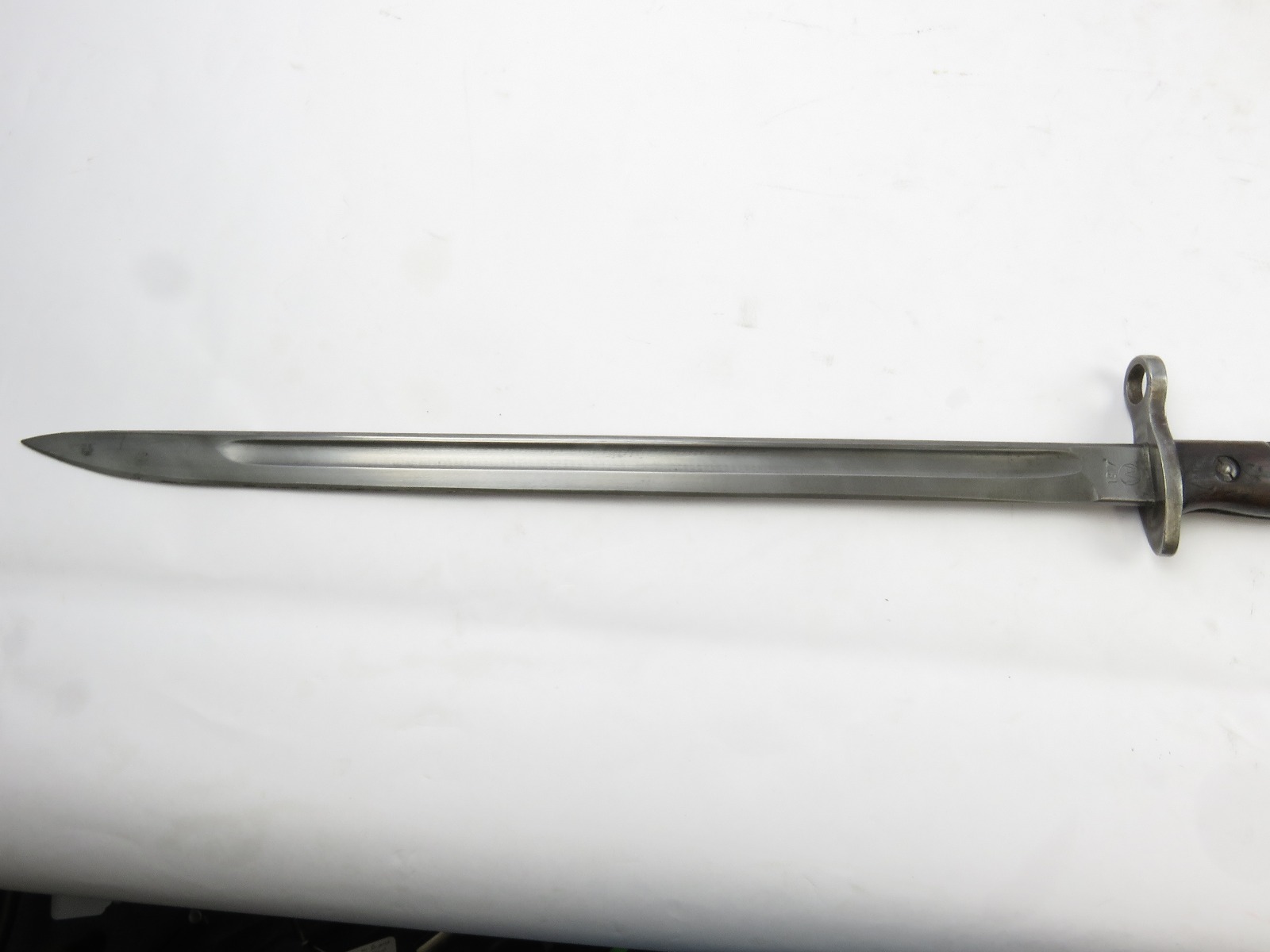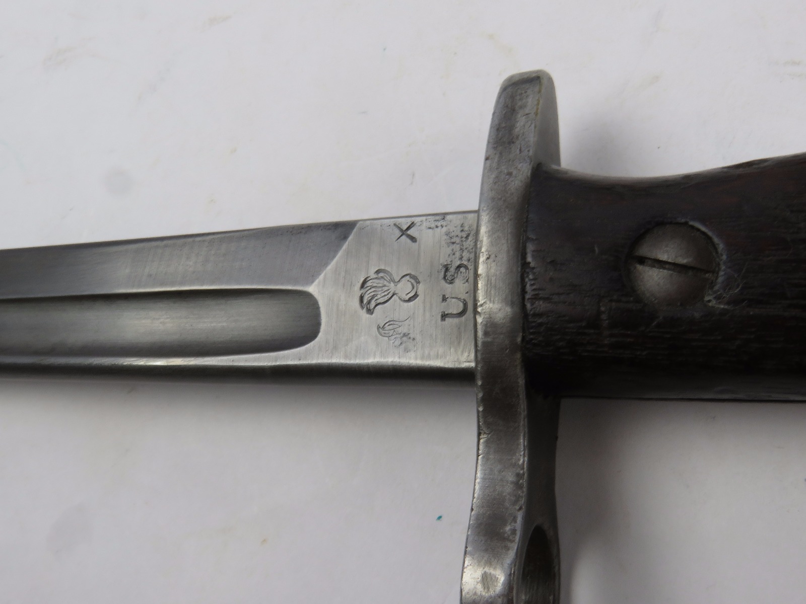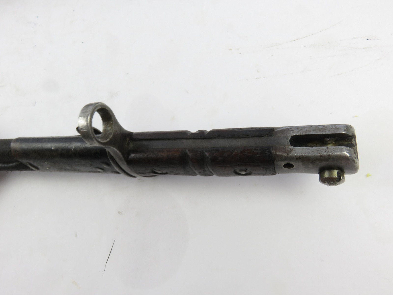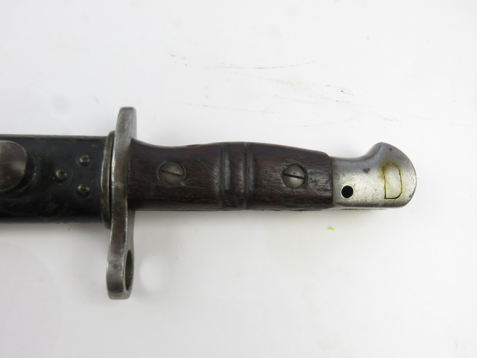 9/23/17 – This is an original WW1 era production Winchester model 97 trench shotgun. This shotgun is all original configuration except for the sling, which is WW2 BOYT (1942 production). The bayonet is correct with a stretched leather scabbard and 1917 dated blade. The shotgun stock is high comb and in great condition. There are a few very minor nicks in the wood near the butt end, but this is common. One side of the stock seems to have a faded unit number that was once painted onto the wood. The wood hasn’t been refinished or sanded. The metal parts are all original and excellent. There is no rust or pitting, but some normal patina and light dicoloration around the receiver and ejection port. The biggest flaw is on the top of the receiver where there is a brown area of finish loss. This is nothing too major though, not rust or pitting. The heat shield is correct configuration and excellent condition. Overall a VERY nice WW1 era (early) Winchester model 1897 shotgun.