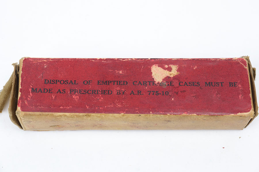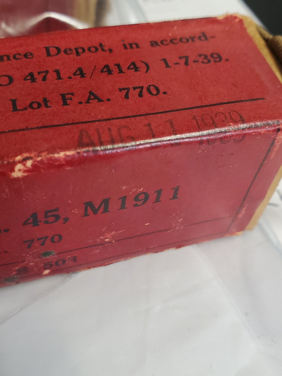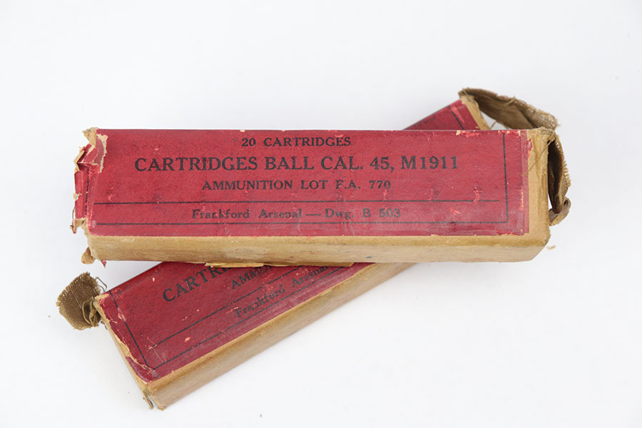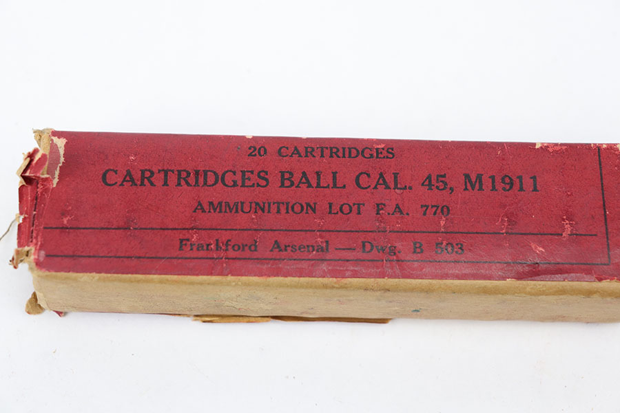 9/17/20 – These are two similar condition, unopened boxes of .45 caliber ammunition for the model 1911A1 pistol. Each box holds 20 rounds and is original. The original labels and boxes are in tact – never opened. Each box is also dated August of 1939.