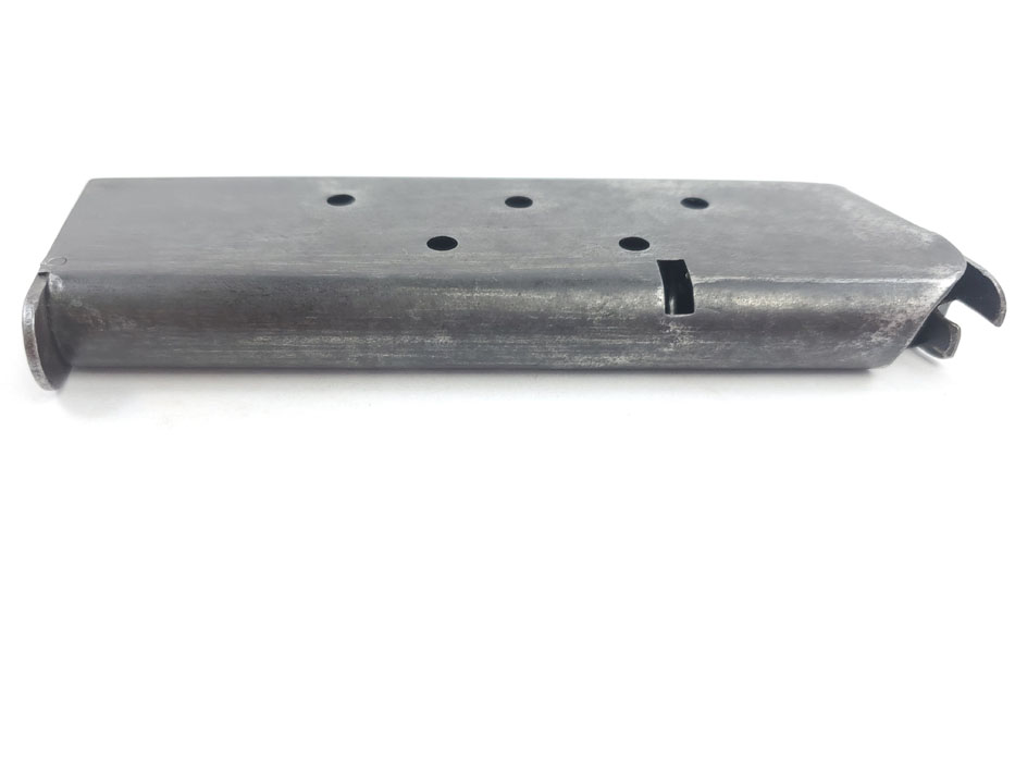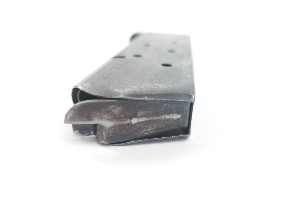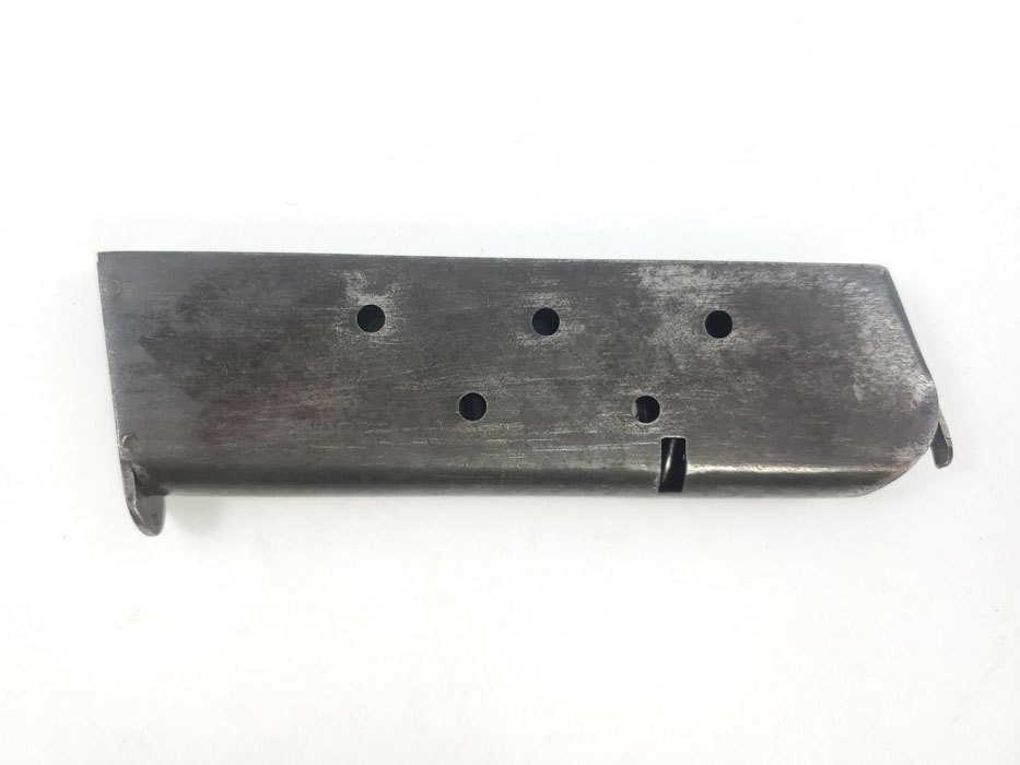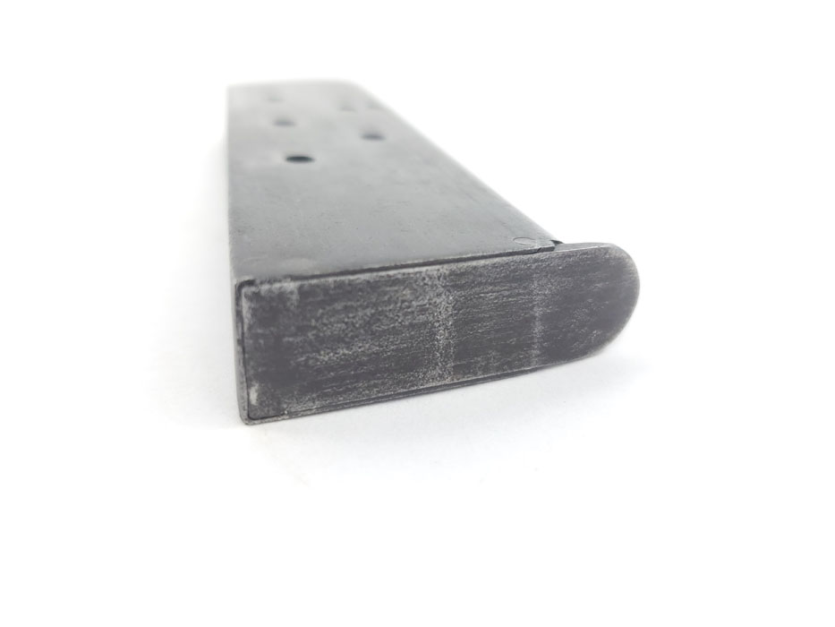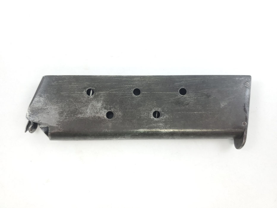 5/5/20 – This is an original WW2 era production 1911A1 magazine. The magazine is pinned at the base, and the lip of the base is “S” stamped. No other markings. There is some light surface wear throughout, but no major rust or pitting. Spring is fully functional.
