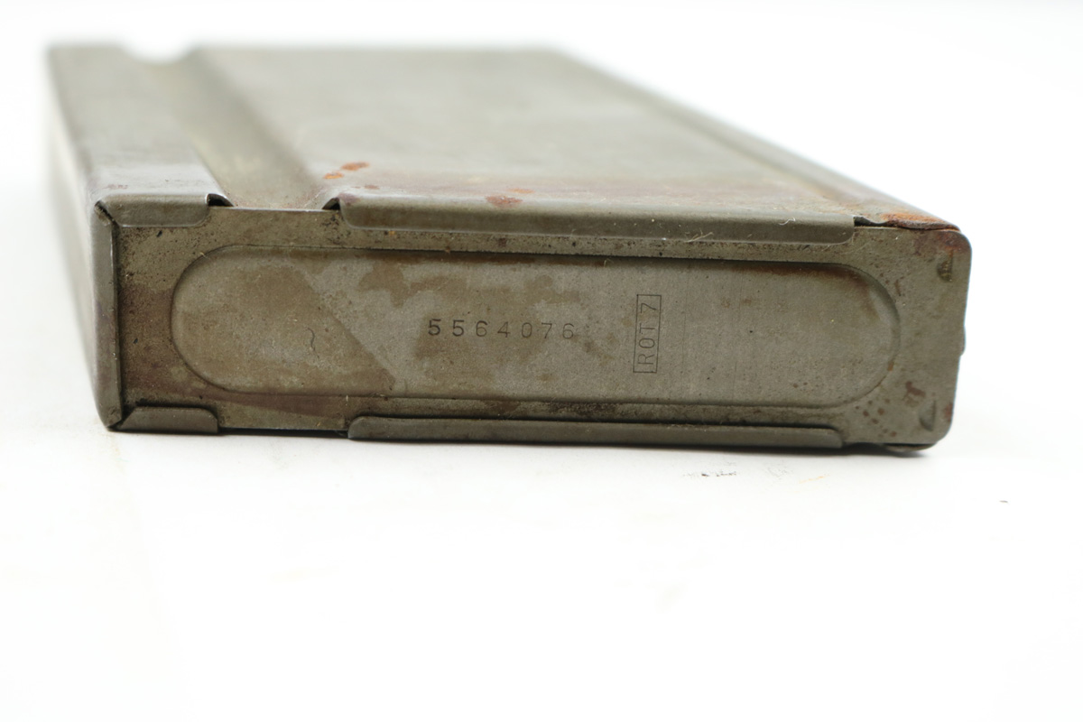 8/1/18 – This is an original WW2 BAR magazine with a parkerized finish. The magazine has a strong fully functional spring, and is serial numbered, and stamped “ROT 7” on the base. There are some dark reddish spots of wear towards the base, and two spots of rust on the corner and left side of the magazine. Guaranteed original and authentic.