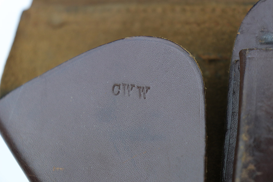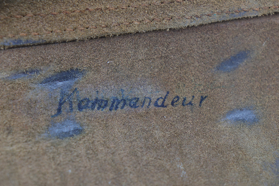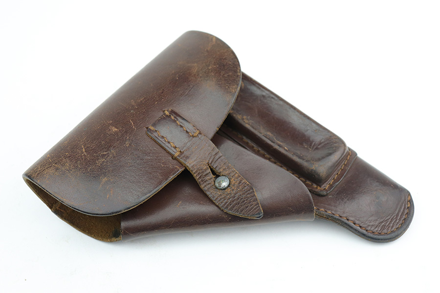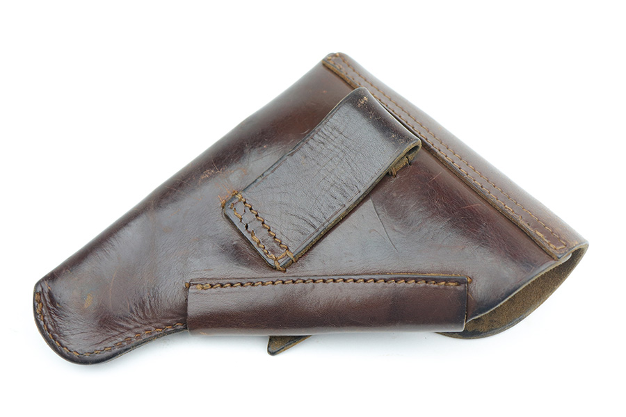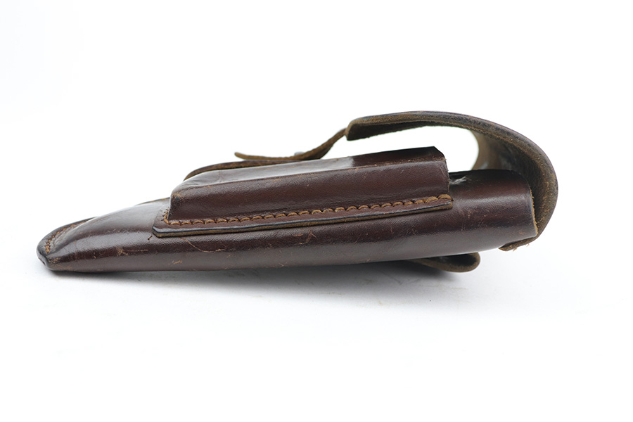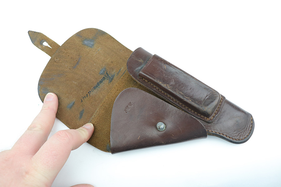 9/27/21 – This is an unmarked WW2 holster for a 7.65mm pistol. Most likely meant for a Walther HSC, it would also fit a Sauer 38h and most other 7.65mm Axis pistols. The leather is in good condition and a majority of the stitching is intact. The closure stud is aluminum suggesting later war production. The closure strap is in good condition. The secondary closure flap bears a post factory stamp “cww” and the interior of the flap shows inked text “Kommandeur”.