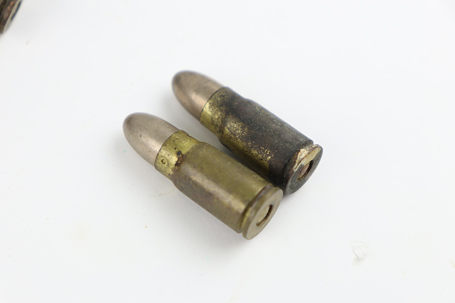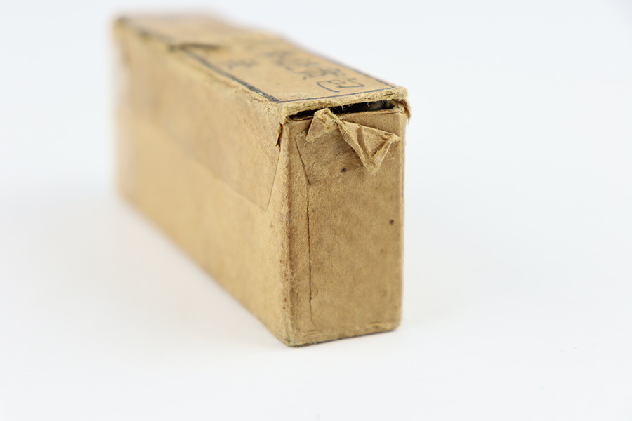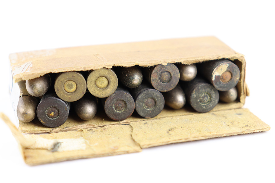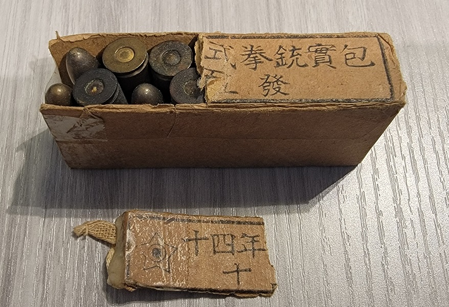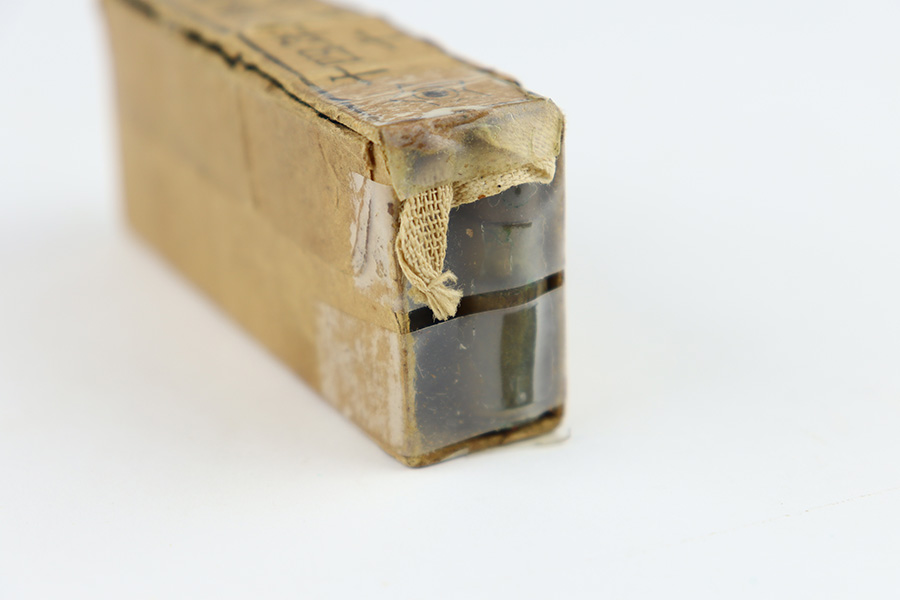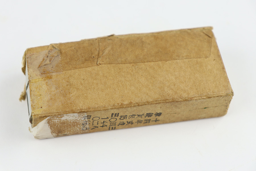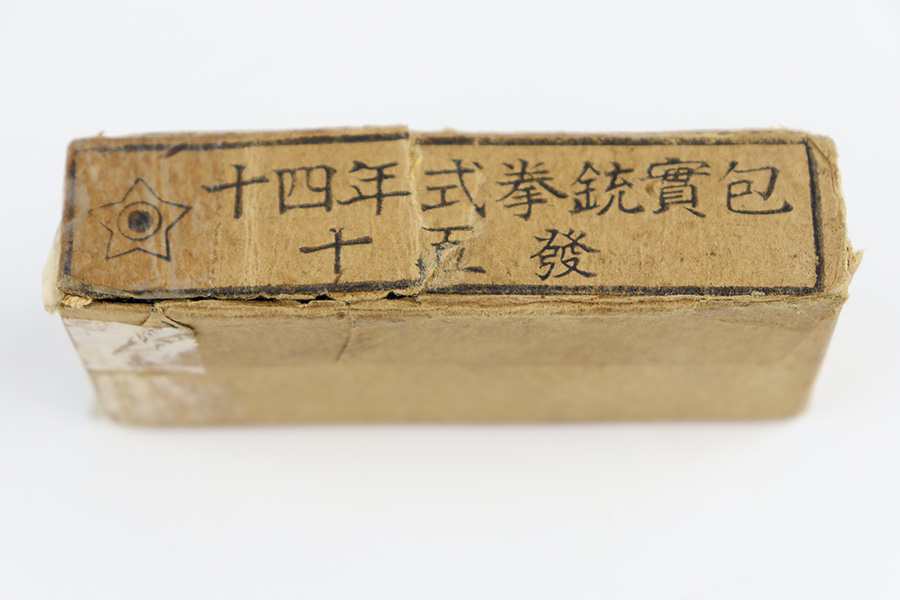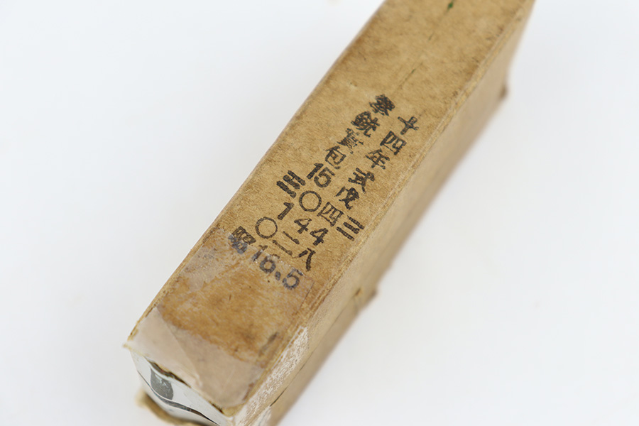 11/2/23 – This is an original box of 8mm Japanese Nambu pistol ammunition. The box is worn and missing one side, which is taped over (as shown). The lid / top of the box is torn and broken as well, with half of the lid detached, yet still legible original label. The underside of the box is dated 1941. There are 15 rounds inside the box, all original with some mild surface wear and light discoloration.