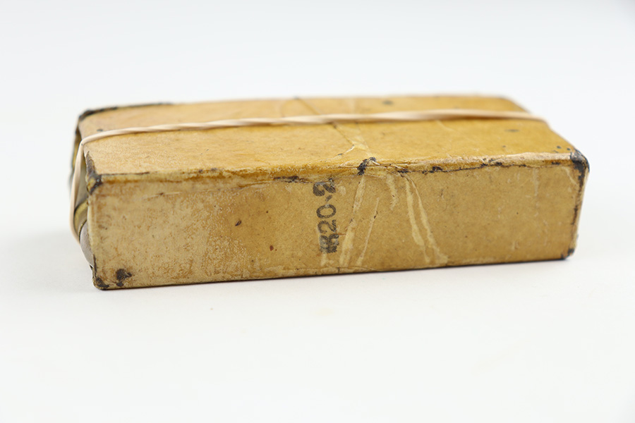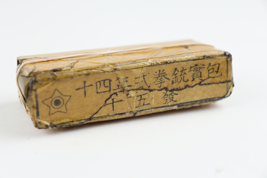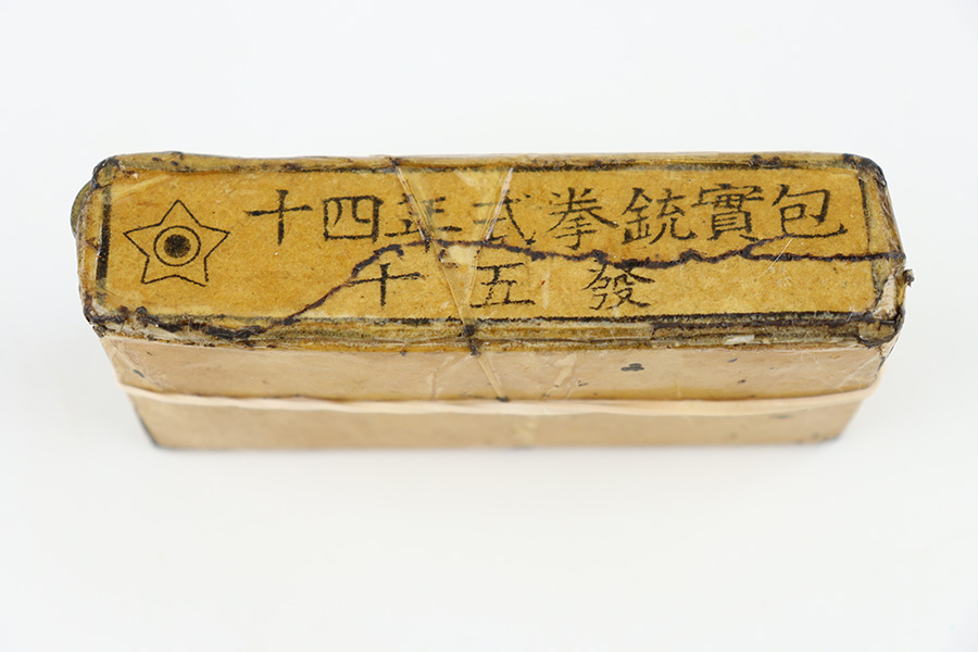11/2/23 – This is an original box of late WW2 production Japanese 8mm Nambu ammo. The box is complete with 15 rounds in great overall condition. The box is worn with tape repairs throughout the top lid and sides. The labels are original and visible, with some cracks showing and natural aging throughout. The underside is dated as shown.
