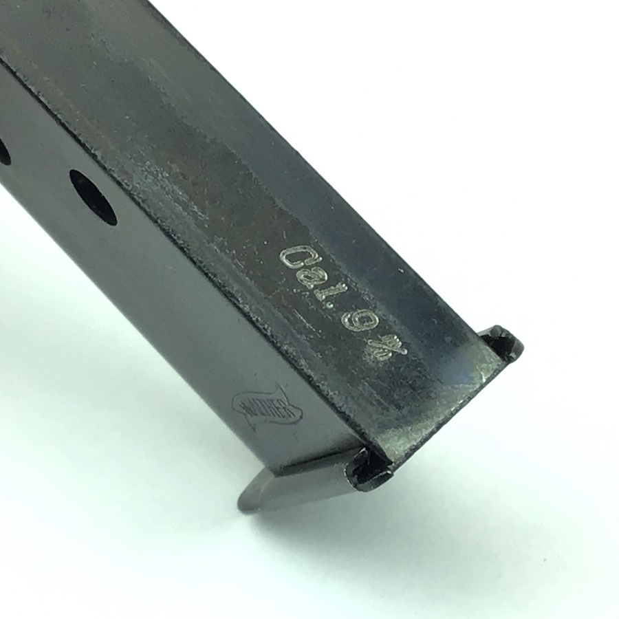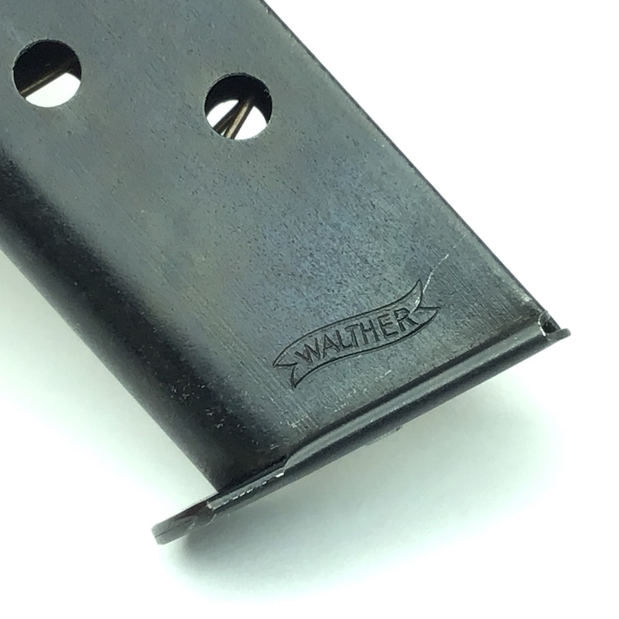 1/20/20 – This is an original, and minty condition Walther PP 9mm magazine. Early style Walther banner on the left side. Factory engraved on the spine with “Cal 9m/m” after the magazine was blued. Appears to be the first variation of magazines or transitional magazine prior to using side stamps.