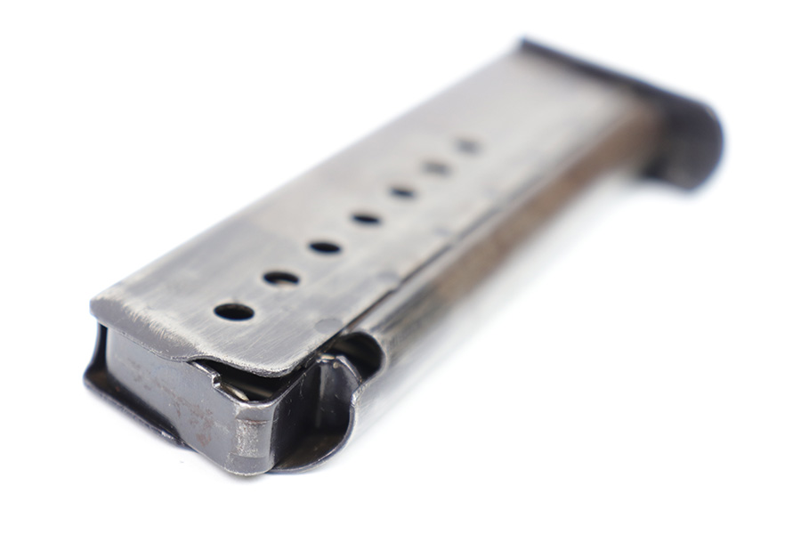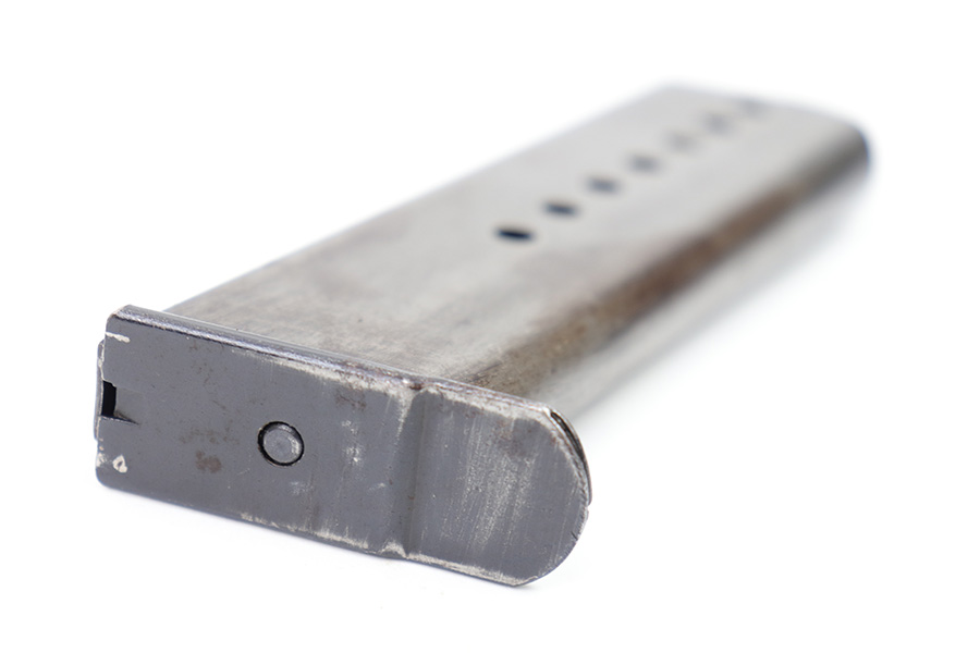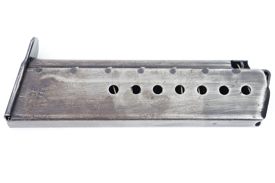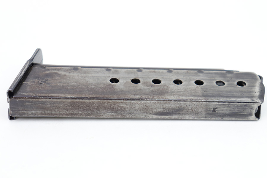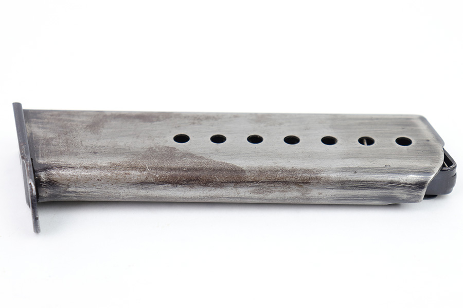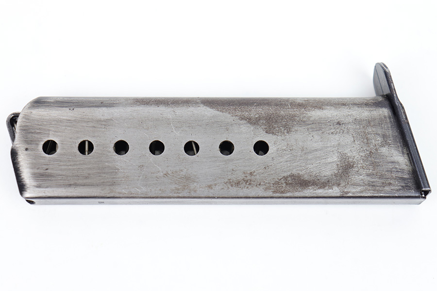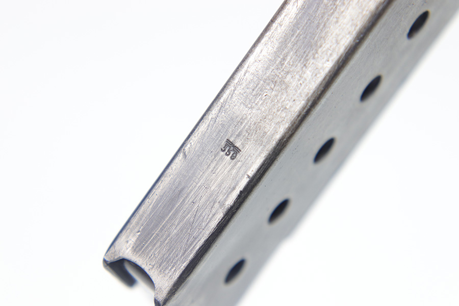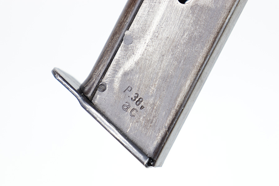 1/19/23 – This is an original, late WW2 production Walther P.38 magazine with an “AC” stamp under the P.38v designation on the side of the tube. The spine of the tube is stamped with an eagle 359 military proof stamp. There are no other markings. Most of the finish is worn off of the tube, but there’s no rust or pitting. The base is in great condition and the spring is fully functional.