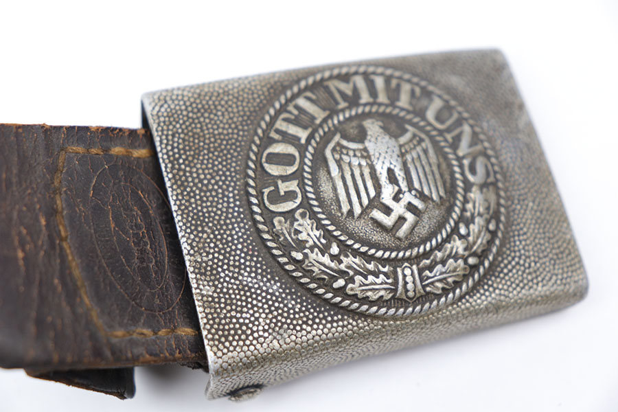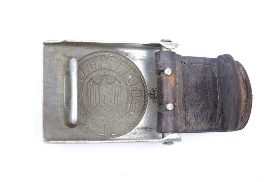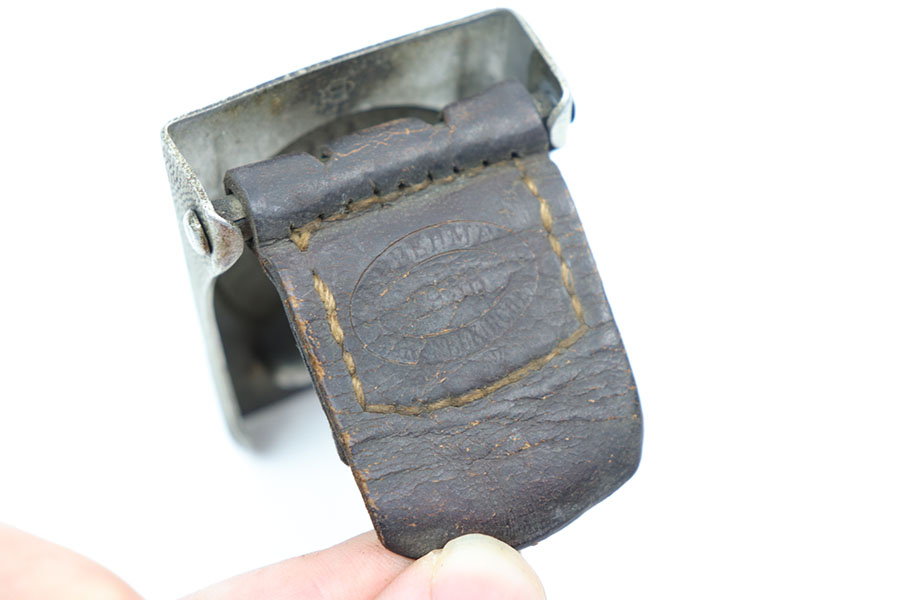 11/2/20 – This is an original WW2 era belt buckle with leather tab. The tab is faintly stamped with a maker stamp and 1938 date. Hard to read but still visible. The leather is also bent / folded in on itself towards the tail. The buckle has patina throughout as shown but no rust or pitting. No major issues, only honest wear.