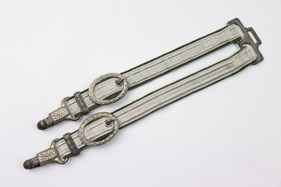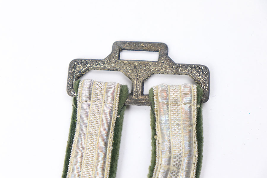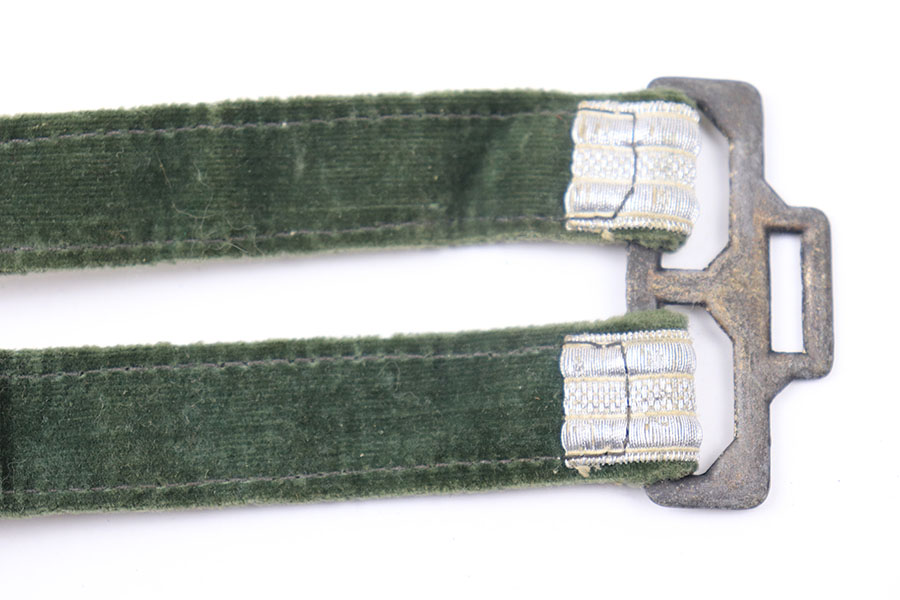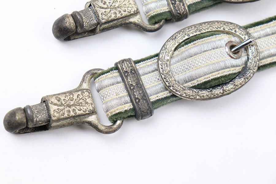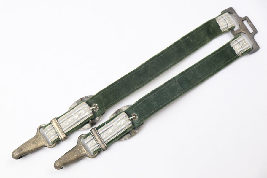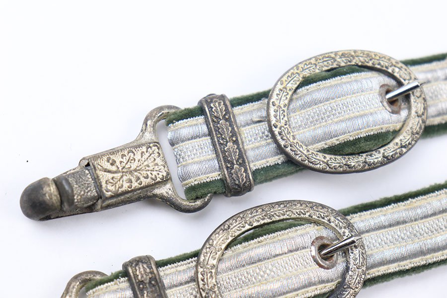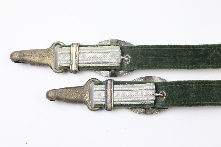 11/1/21 – This is an original WW2 Nazi Army Dagger hanger. The hanger is excellent with mild patina throughout the metal fittings but no rust or pitting. The silver and green materials are clean and excellent. Each hanger clip, as well as the fastening hook, are all DRGM stamped.