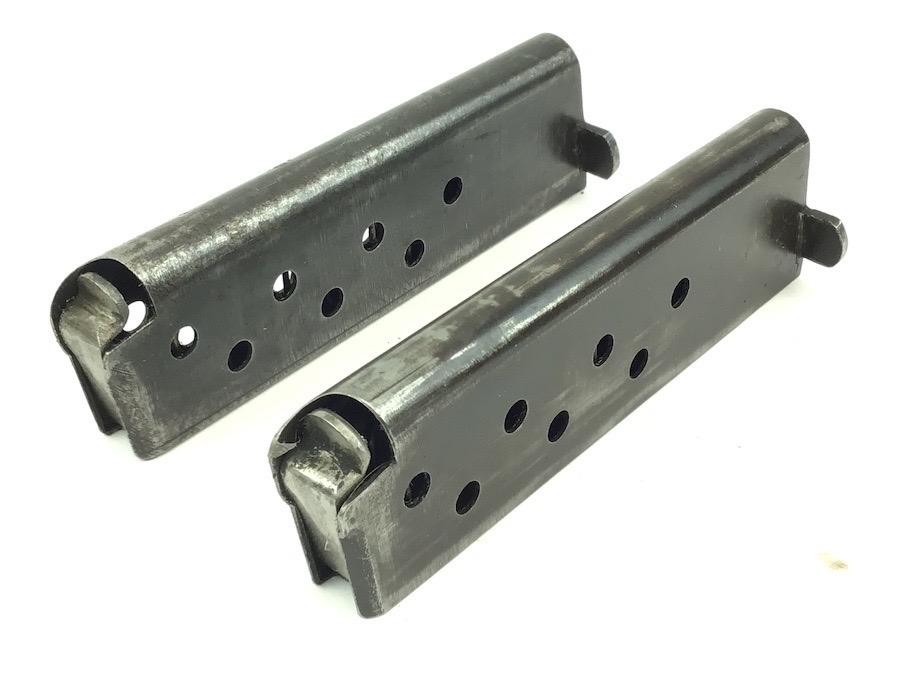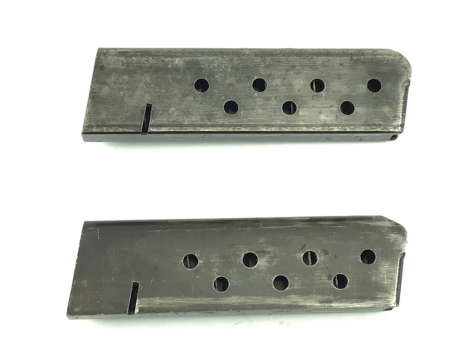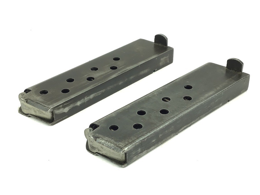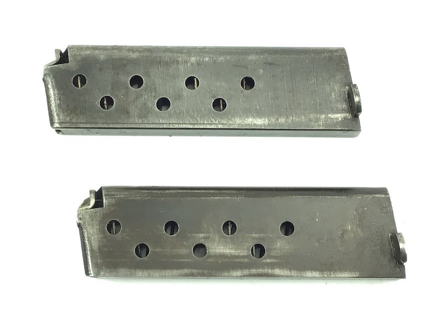 11/16/22 – Price per magazine. Two available. These are original Astra model 600 magazines. The magazines are in great condition with some light bluing loss and minor patina on the frames. There are no serious rust or pitting – only normal wear and aging. The bases are Astra maker stamped. There are no other markings. The springs are strong and fully functional.