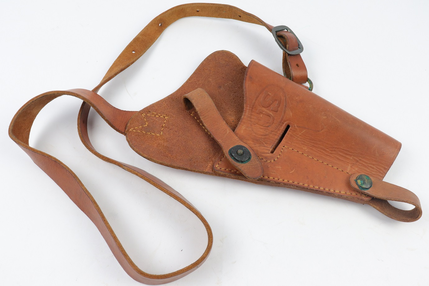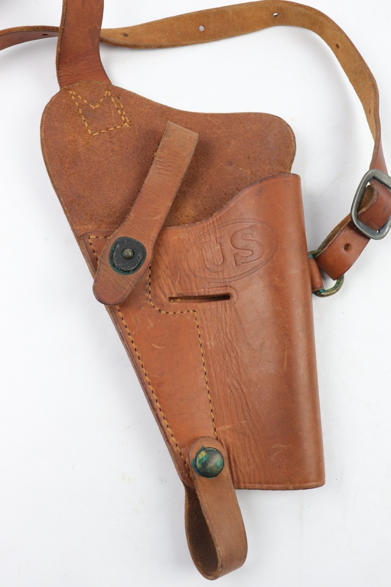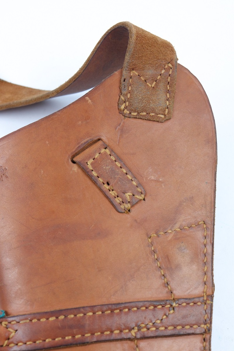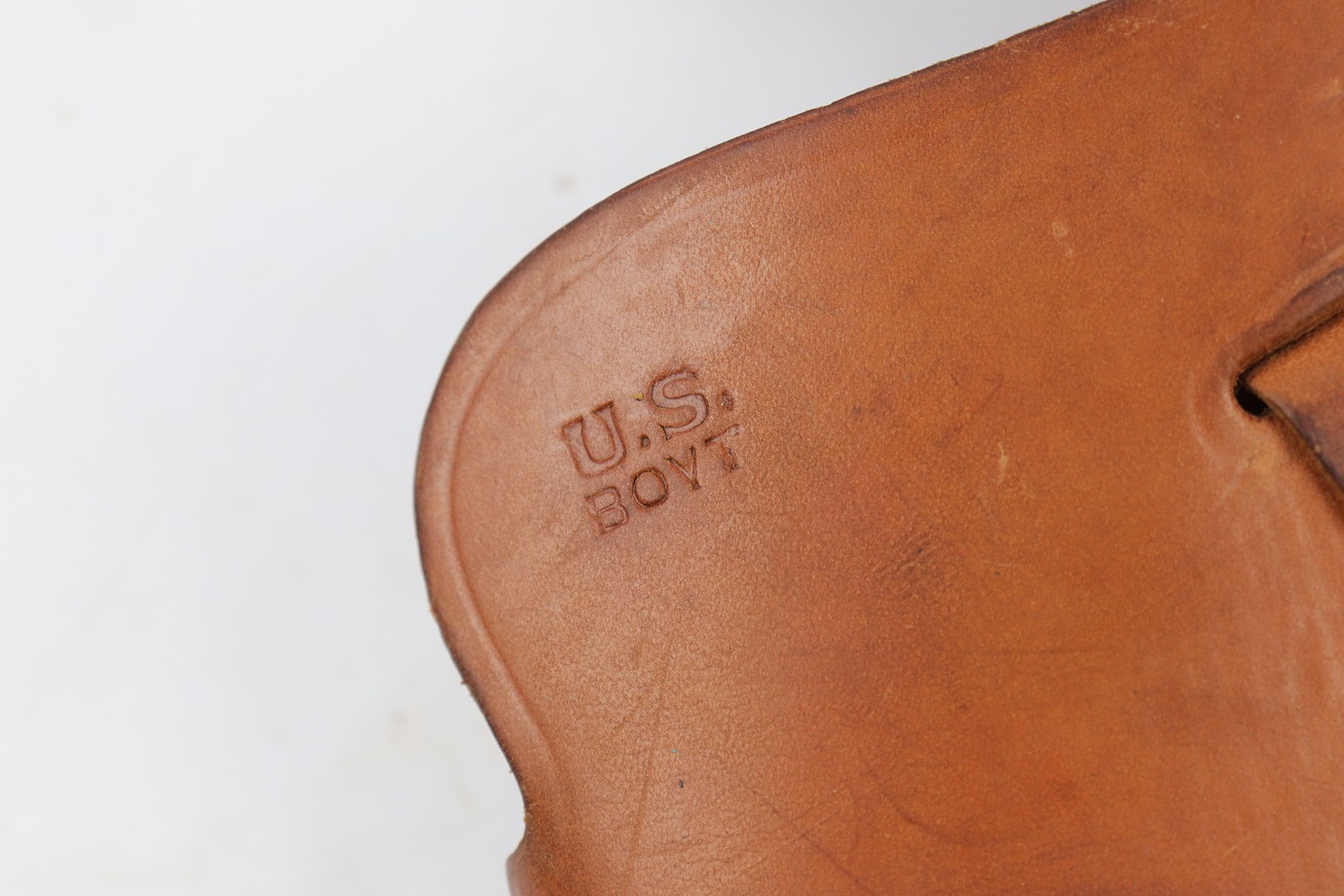4/12/18 – This is an original late WW2 production 1911A1 shoulder holster. The back of the holster is marked “U.S. BOYT” . The leather is very nice and clean overall with minimal pliability. The stitching is all original, in tact, and excellent.