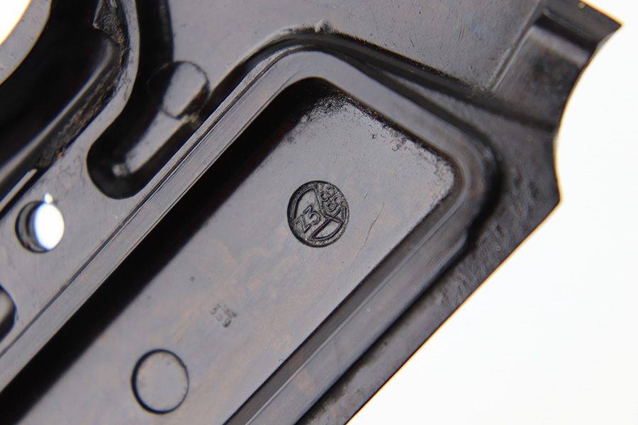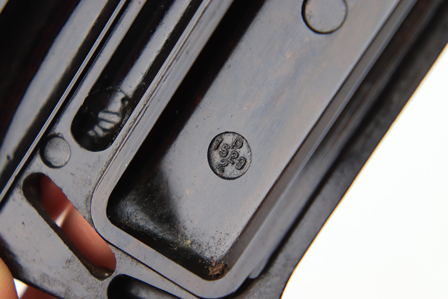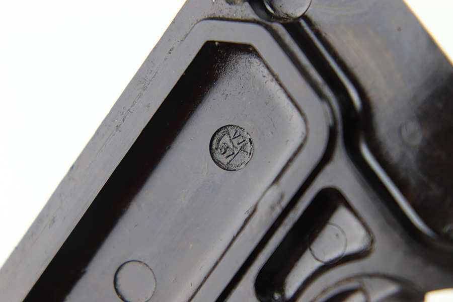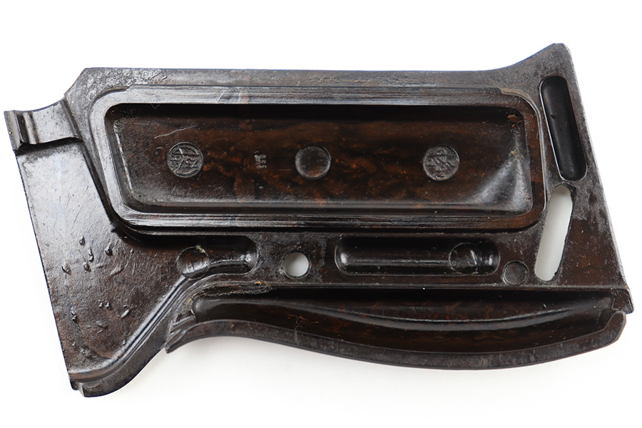 8/18/23 – This is an original pair of WW2 era production dark brown bakelite P.38 grips. The grips have some light surface scuffing and scratches throughout the exterior of each panel. The right panel has a concentration of scratches around the top of the grip. No cracks or chips, and no screw included.