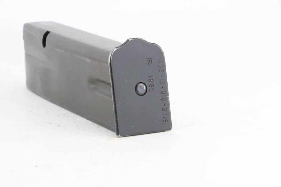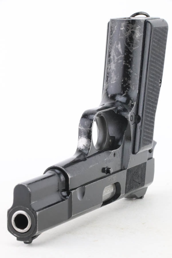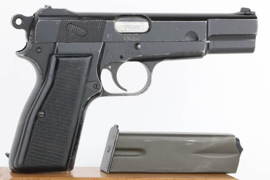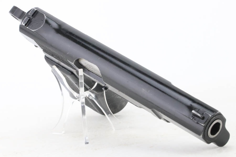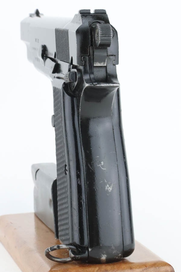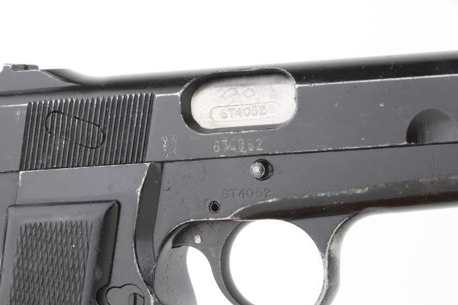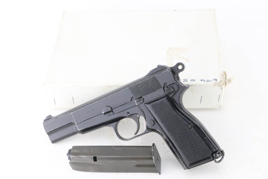 11/4/24 – This is an Inglis High Power Mk I* issued to the Canadian military during WW2. All matching with the proper military proofs. There are “FTR 63” markings on the slide and frame, indicating this gun went through a factory repair in 1963. The gun’s black enamel finish rates roughly 80% with general high edge wear with areas of chipping in the finish throughout, most obvious on the front strap and underside of the trigger guard. Fitted with period-correct black bakelite grips and comes with one magazine (dated 1968 on the bottom). The bore has good rifling, but there is light pin-pricking throughout. It comes with a matching-numbered Navy Arms import box. Oddly enough, we don’t see an import mark on the gun.