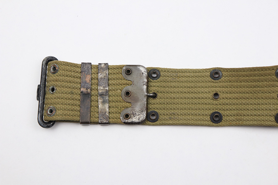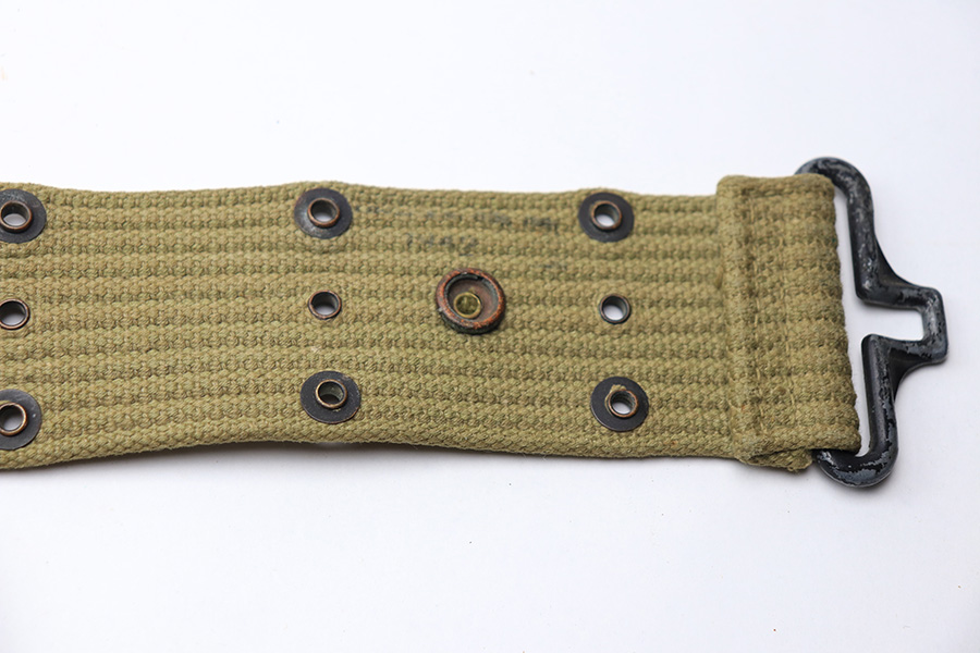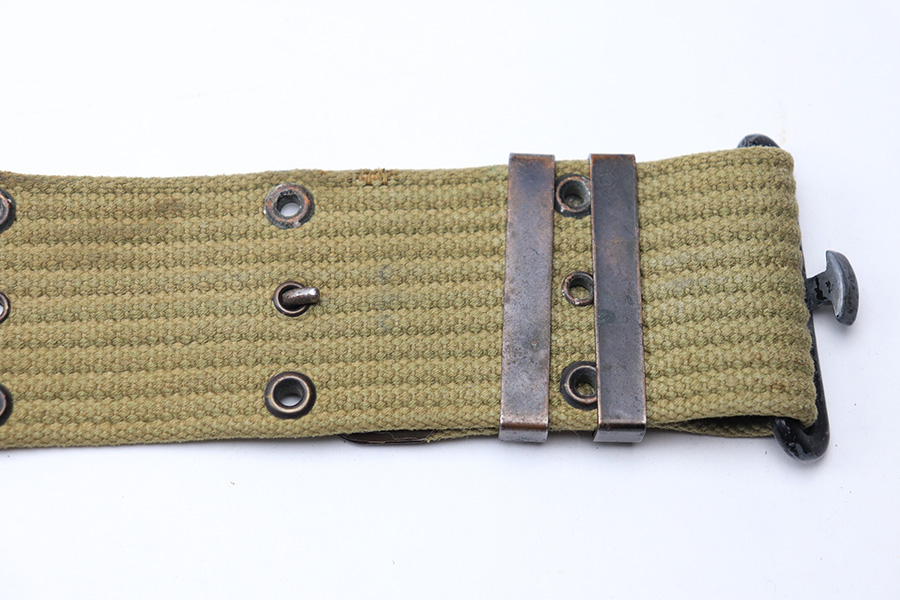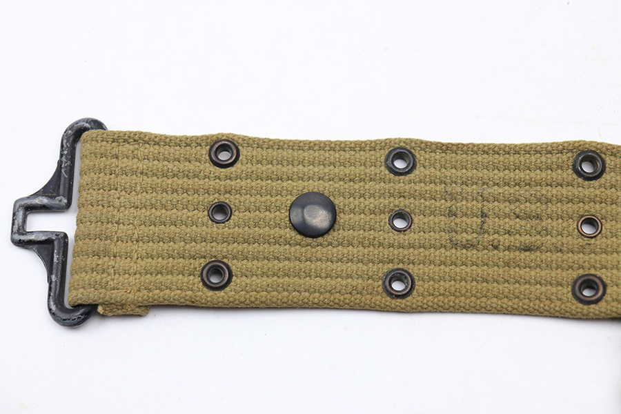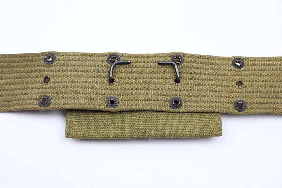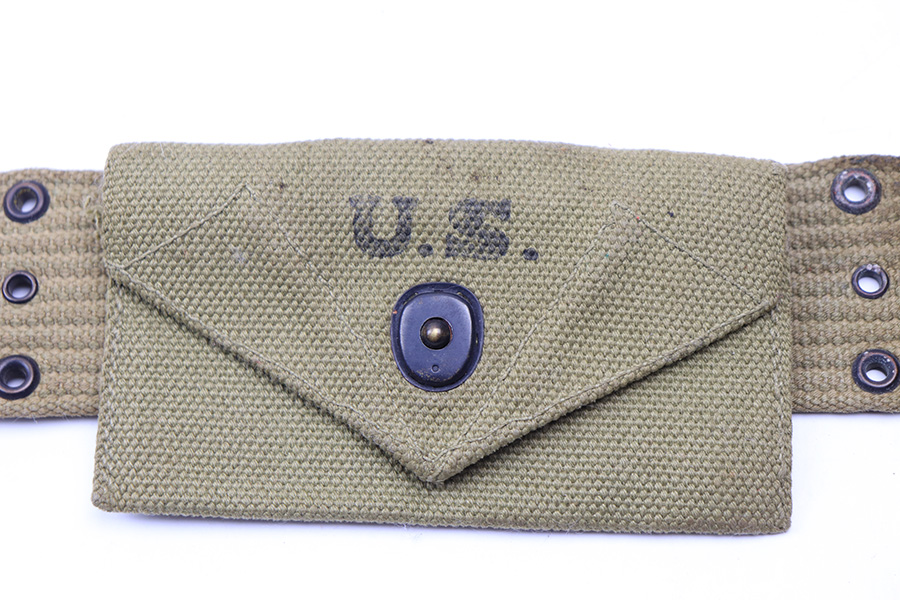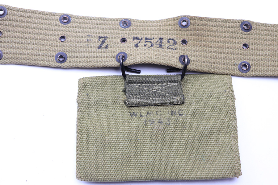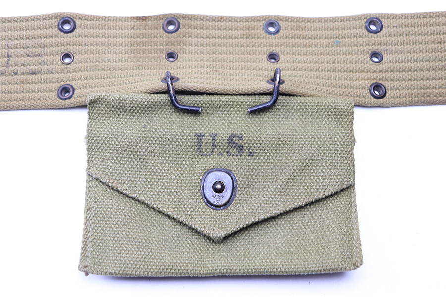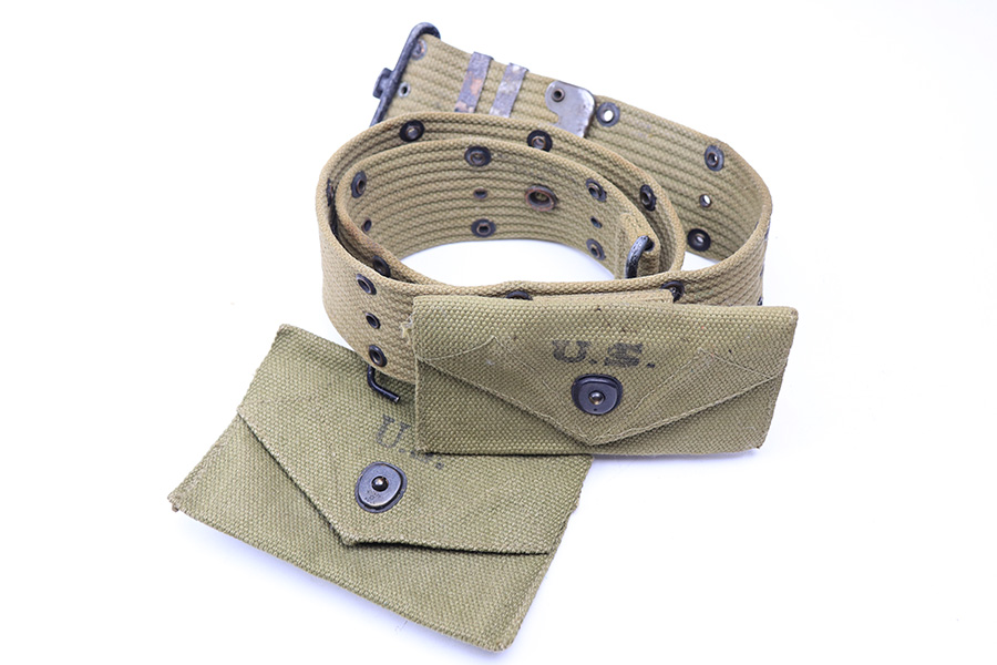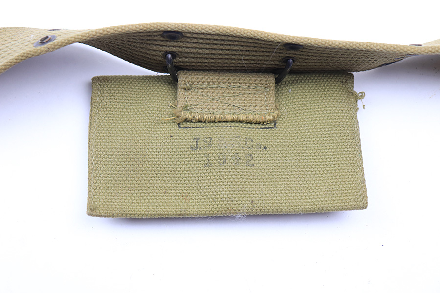 3/2/22 – This is an original WW2 era US canvas belt with two attached canvas pouches for ammo / supplies. The pouches are ink stamped U.S. on the front, and dated 1941 and 1942 in ink on the back. All pieces are in tact and in great overall condition.