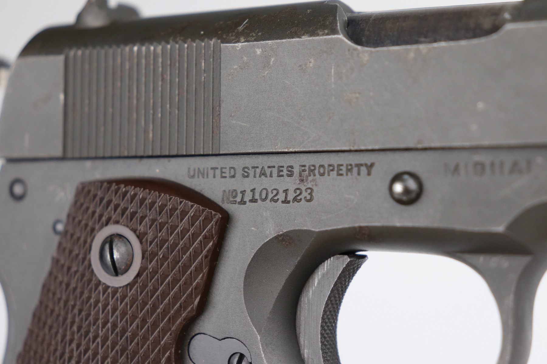 8/24/20 – This is an original WW2 Colt 1911A1 issued to the US military in 1943. The left side of the frame has the inspectors initials “G.H.D.” and a “P” proof. The right side of the frame is marked with a military cross-canon cartouche. The condition of the gun is difficult to rate, because it there isn’t much actual finish loss, but there are several areas of notable freckling on the gun. It is most noticeable on the right side of the slide and on the front strap. There is also very minor muzzle and high edge wear. The grips are excellent. It comes with a period-correct magazine. Original Colt barrel with small ‘F’ under lug. There’s a bit of frost but bore is shiny and in very good condition overall.
