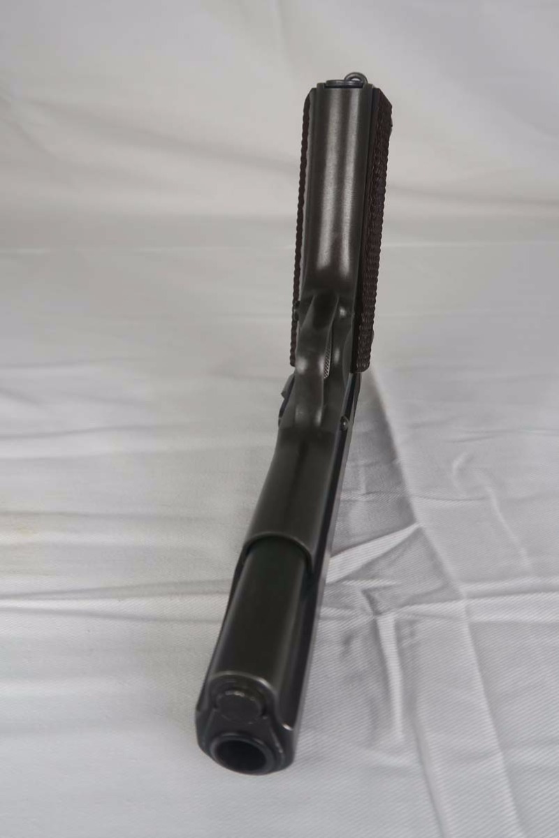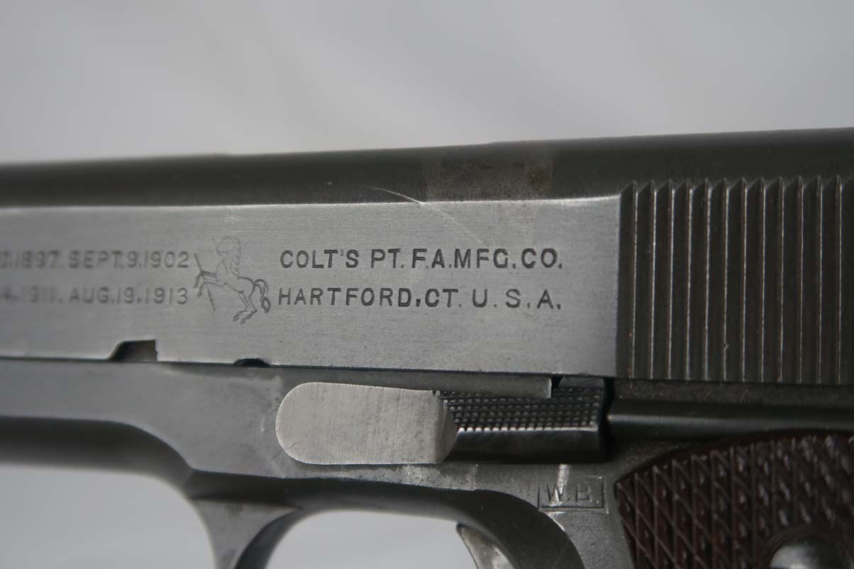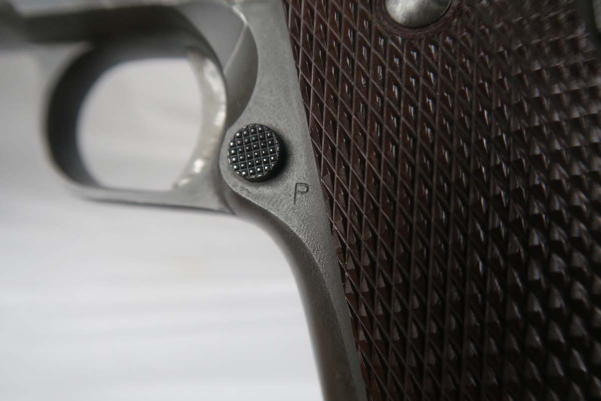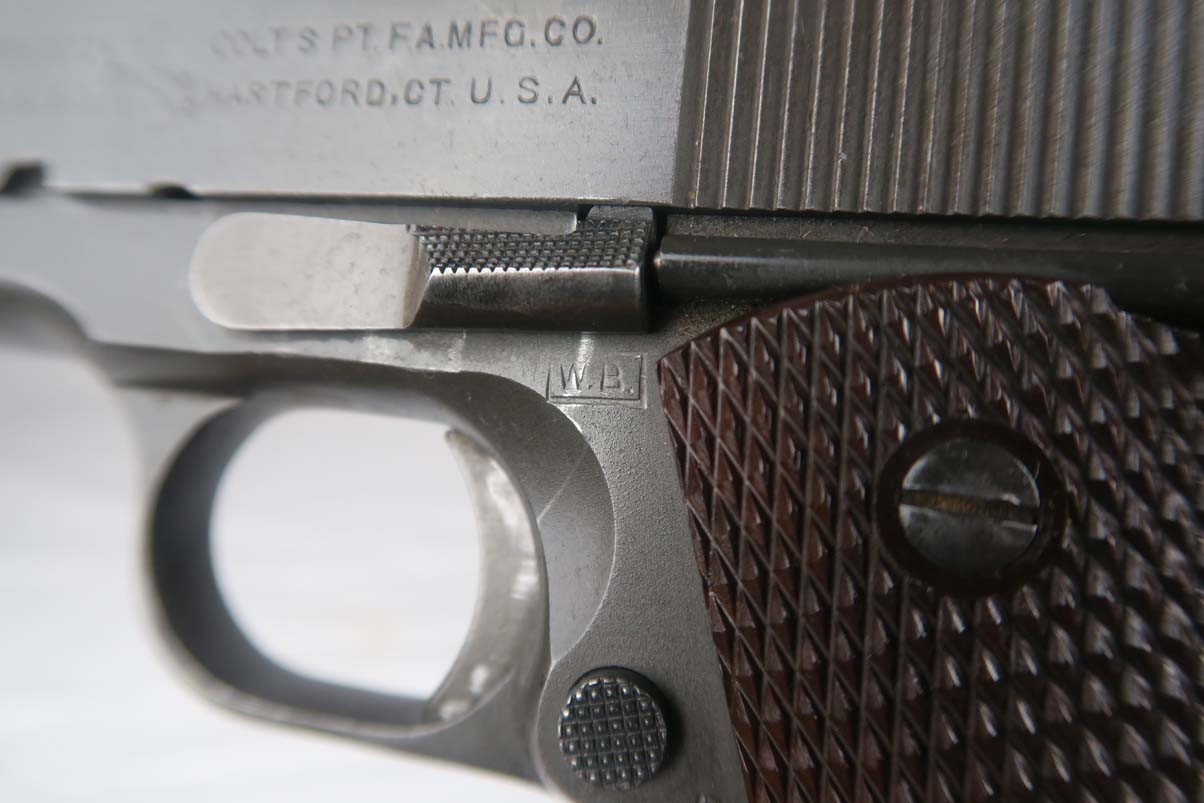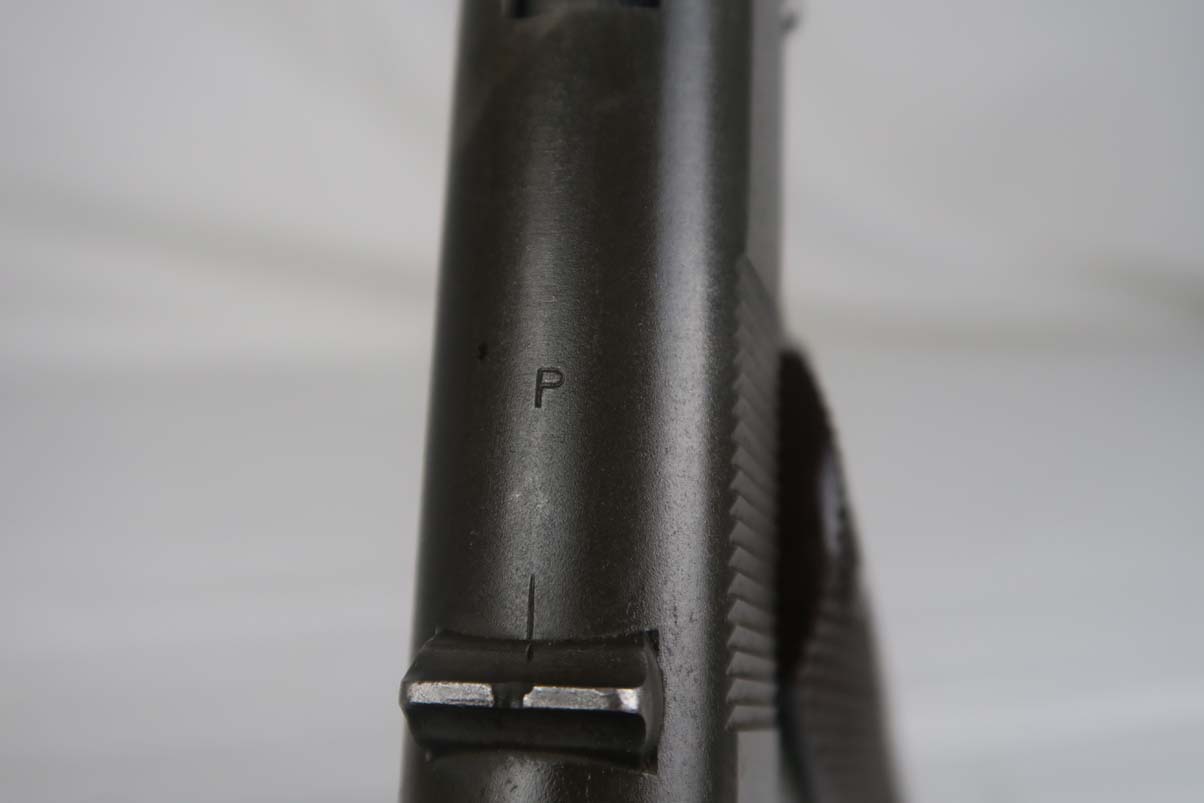 4/5/17 – This is a WW2 era Colt M1911A1, in all original configuration. The serial number dates this pistol to 1942, and is supported by the proper inspectors proof (WB) for this year. The original finish is maybe 93-94%, with only minor edge wear and thinning in general, though there is one noticeable spot of finish loss on the right side of the slide near the ejection port. Proper barrel is Colt .45 auto/P proofed. Bore is a little frosted but has nice grooves and is generally clean. Mag is marked ‘Colt .45 Auto’ on the bottom of base plate.