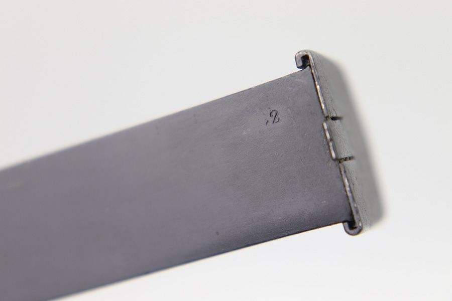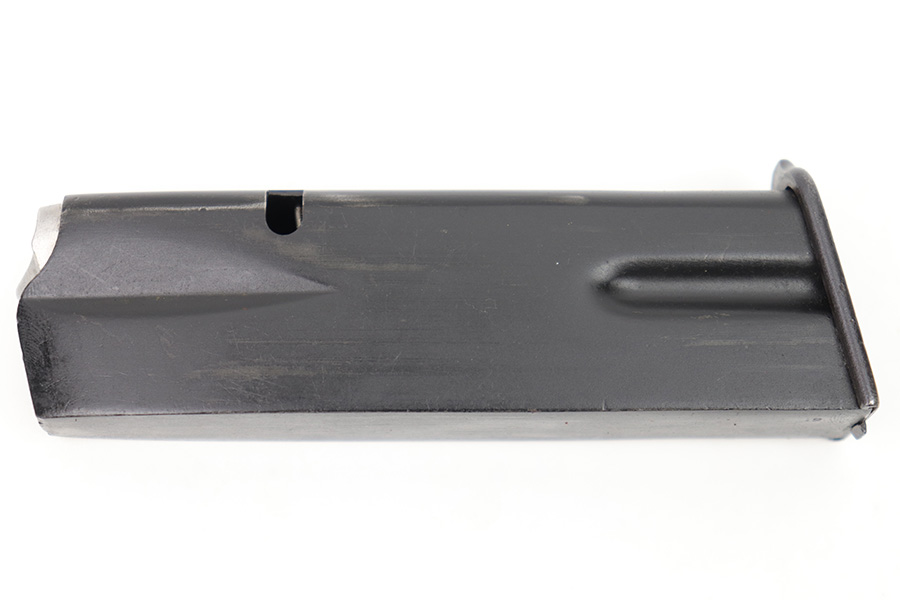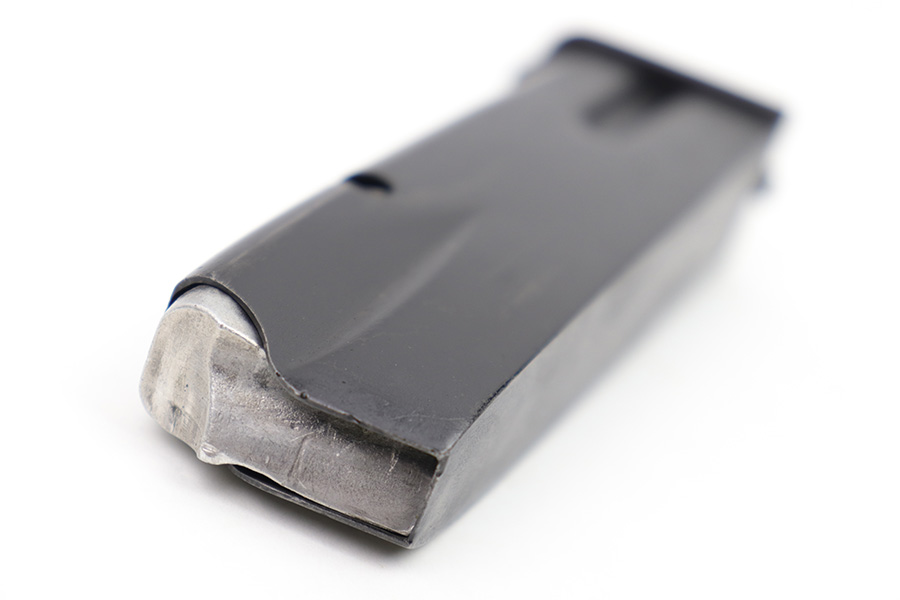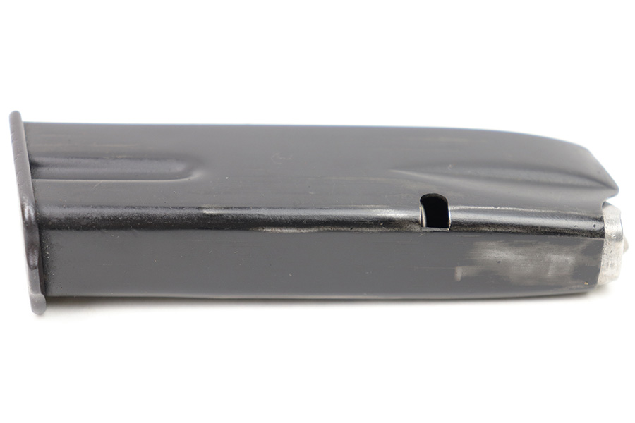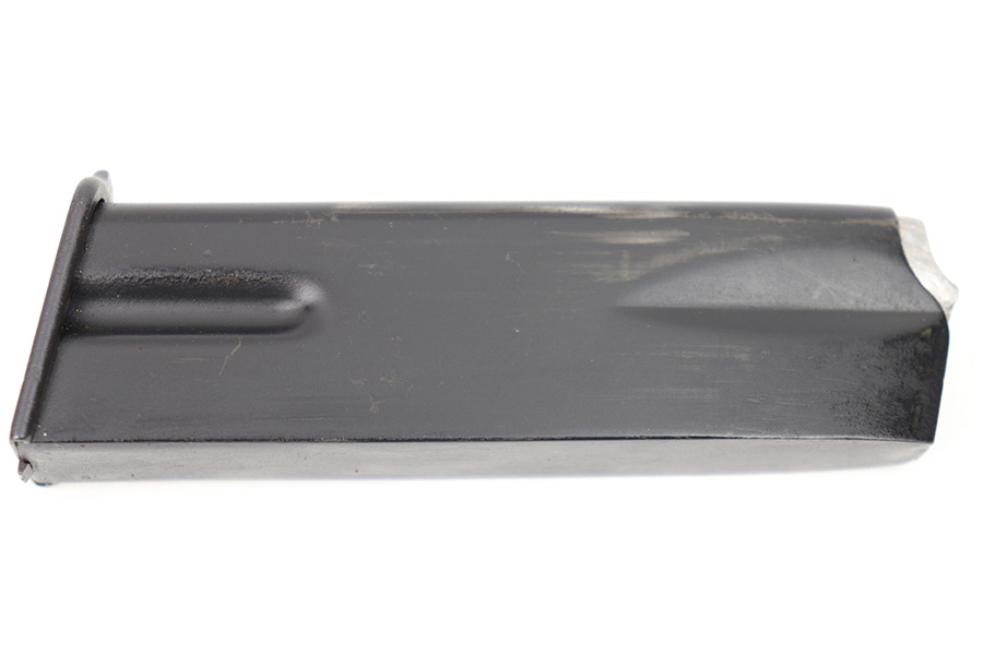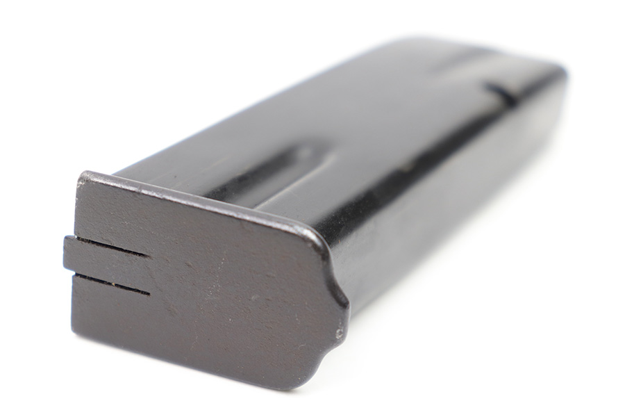 2/7/23 – This is a WW2 era commercial FN Browning Hi Power magazine. The magazine has a dull blued finish throughout and a split-base, which is a style from the WW2 era. The magazine has some mild finish loss but is in great overall condition. The base has some surface patina as shown. The spring is strong and fully functional.