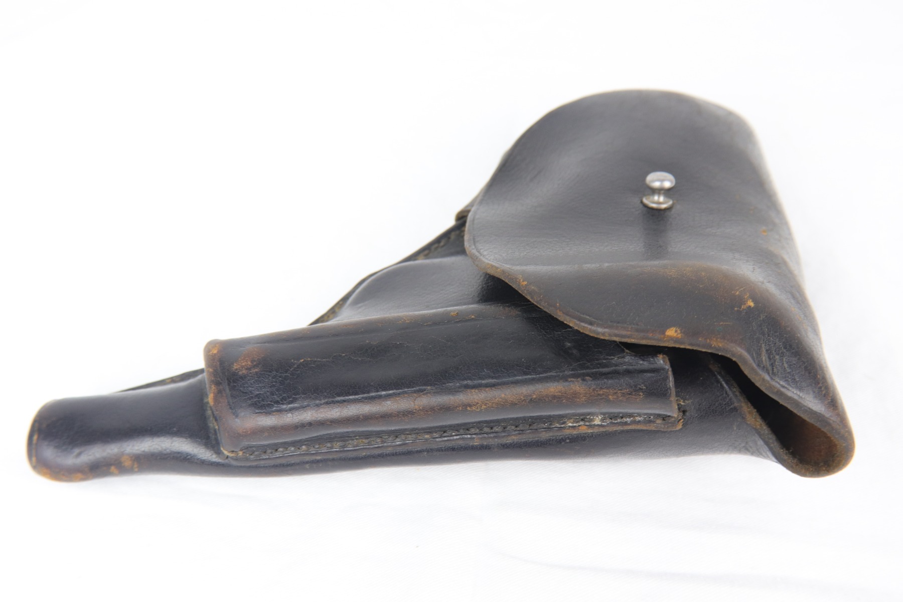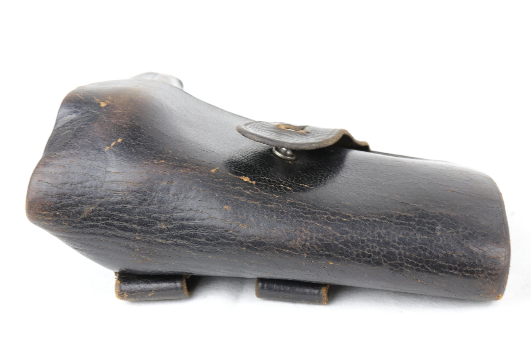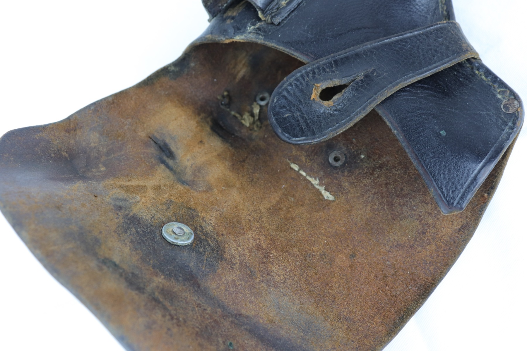 10/23/18 – This is an original pre WW2 (most likely 1920s) commercial Luger holster. The holster is fairly scarce and unusual and in excellent condition for its’ age. The magazine pouch is on the front of the holster instead of the side, as seen on most luger holsters. Also the closure strap goes from the body of leather to the lid, not the other way around. The belt loops on the backside of the holster are reinforced with rivets. This we’re not sure is factory original – could have been later done during or after WW2. Despite this minor “flaw” the holster is very nice with light pliability and a pebble grain – like pattern on the exterior. There’s some surface cracking and normal wear on the exterior. Clean interior leather. Guaranteed all original and authentic.