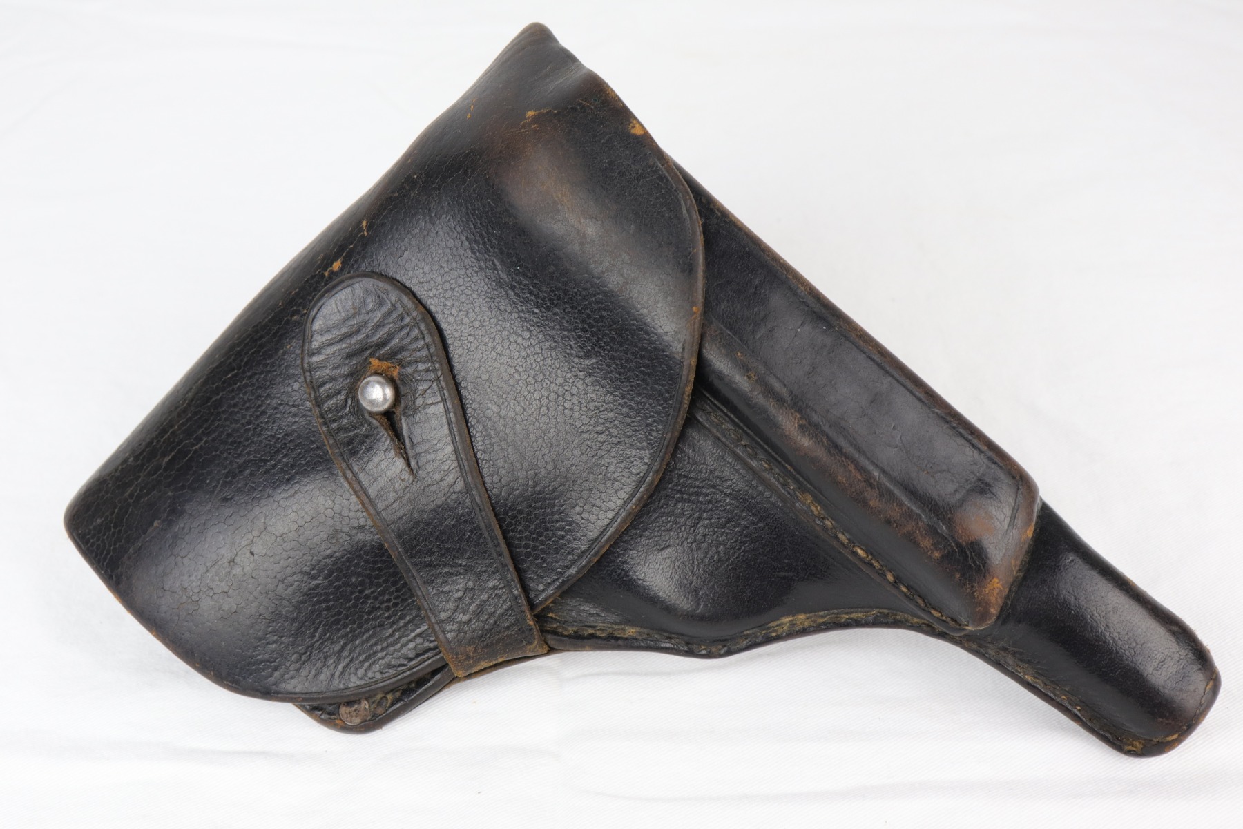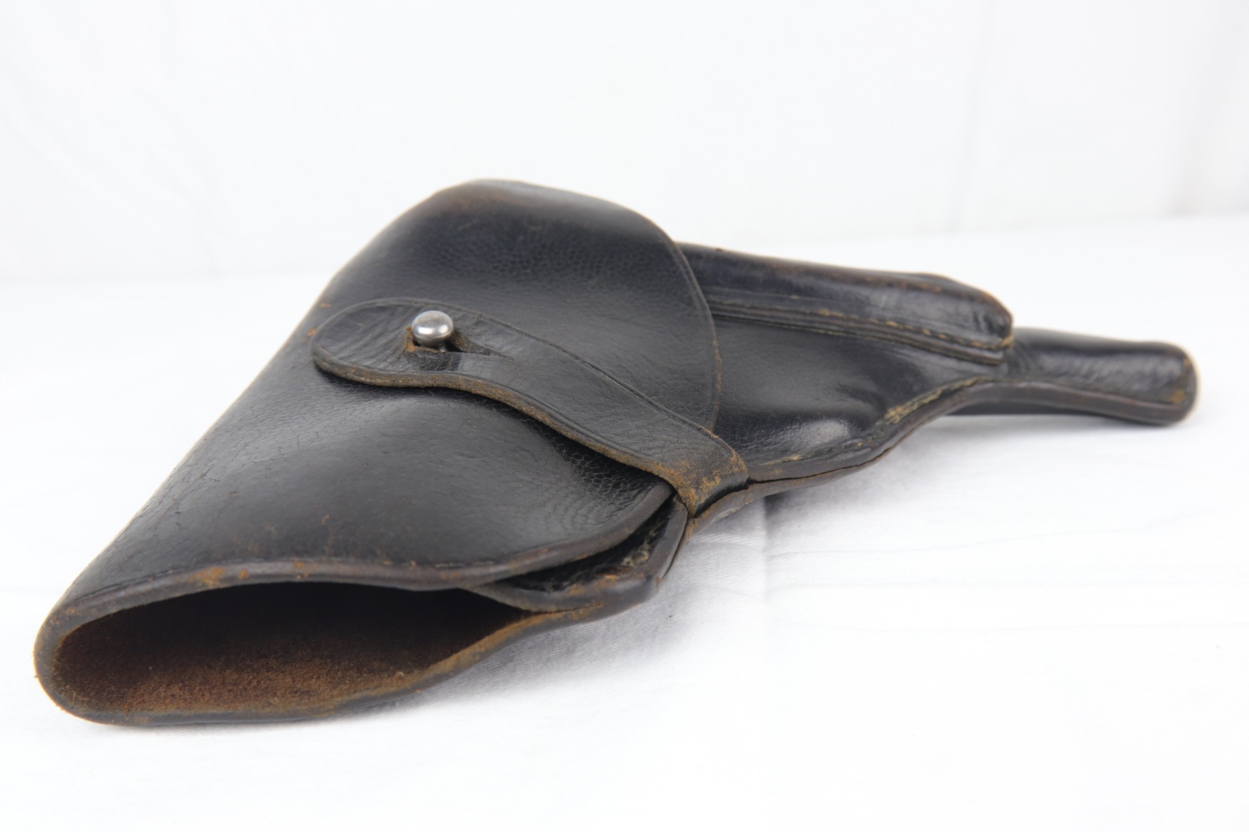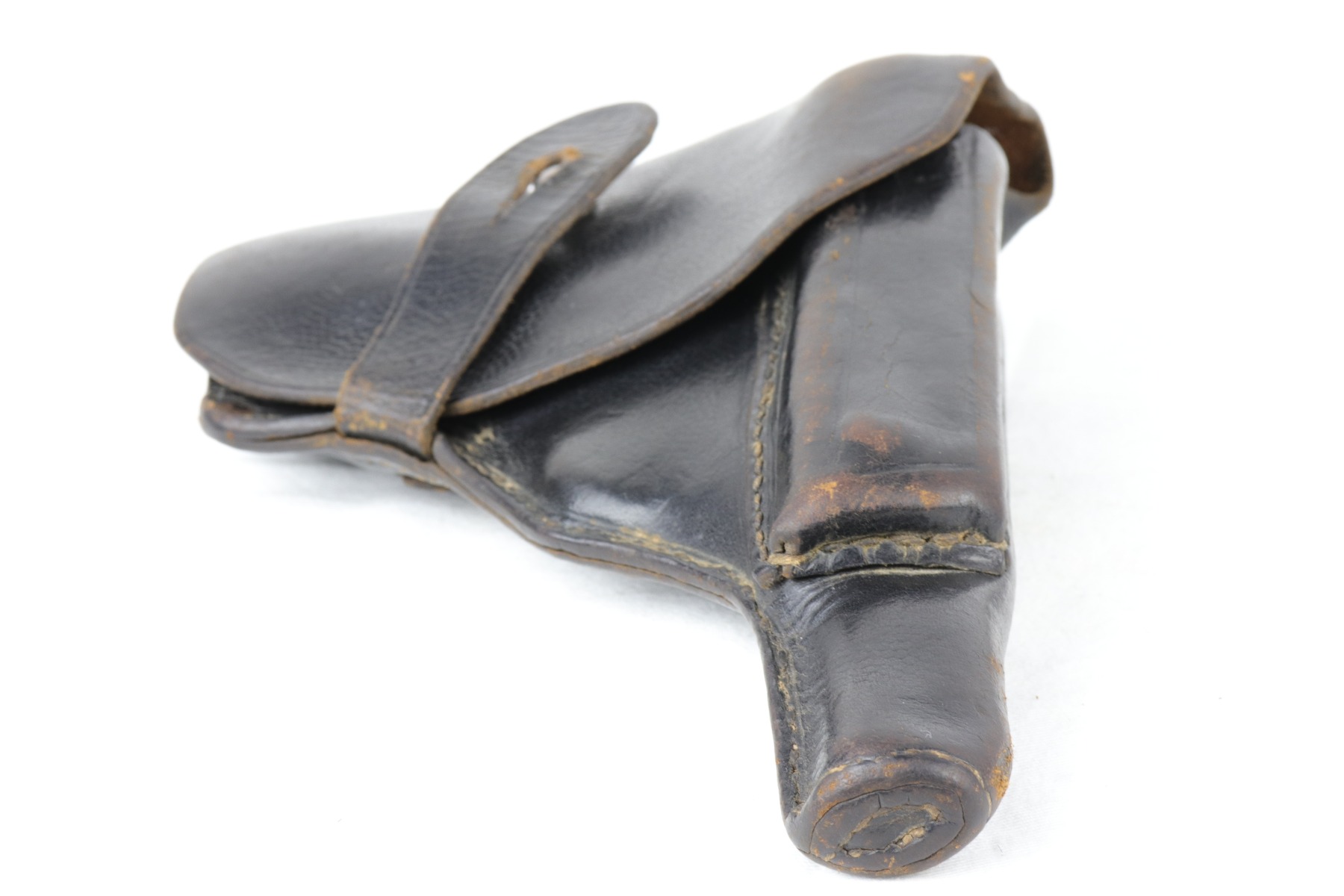 10/23/18 – This is an original pre WW2 (most likely 1920s) commercial Luger holster. The holster is fairly scarce and unusual and in excellent condition for its’ age. The magazine pouch is on the front of the holster instead of the side, as seen on most luger holsters. Also the closure strap goes from the body of leather to the lid, not the other way around. The belt loops on the backside of the holster are reinforced with rivets. This we’re not sure is factory original – could have been later done during or after WW2. Despite this minor “flaw” the holster is very nice with light pliability and a pebble grain – like pattern on the exterior. There’s some surface cracking and normal wear on the exterior. Clean interior leather. Guaranteed all original and authentic.