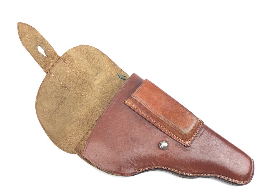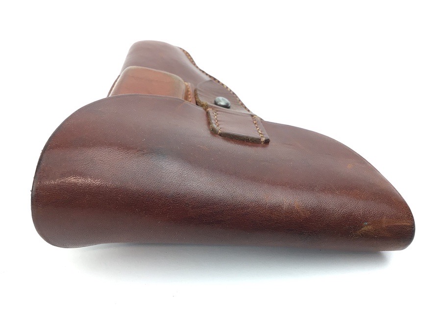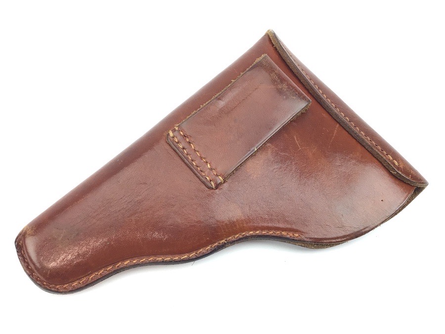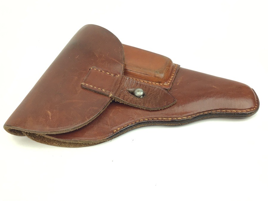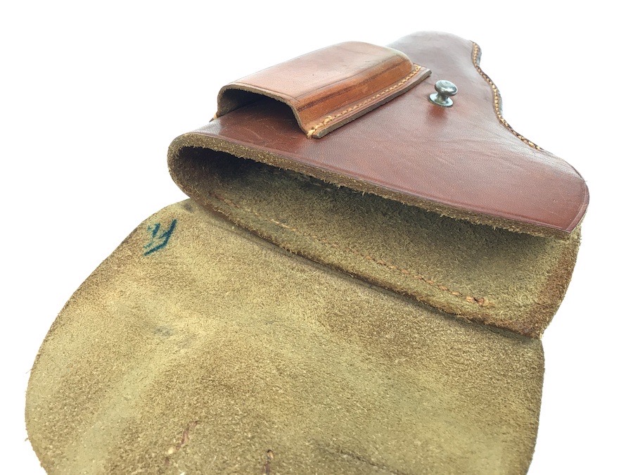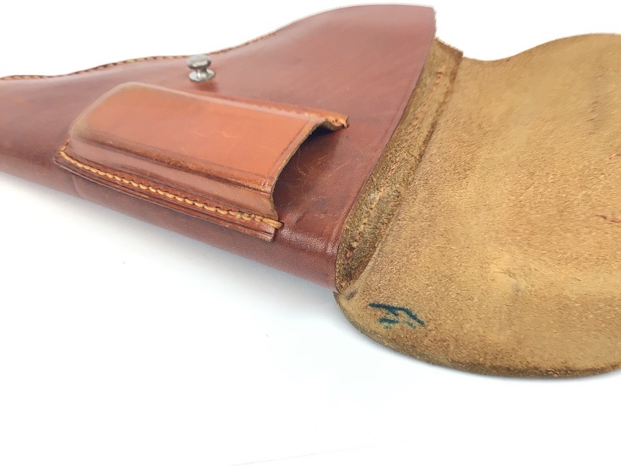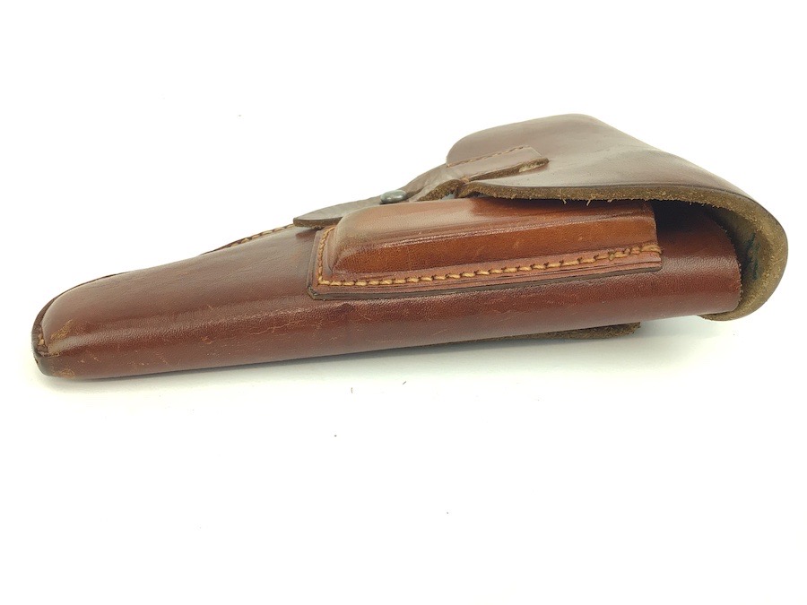 11/22/22 – Excellent condition holster for a 7.65mm handgun. Unmarked leather has minimal use wear with a clean interior. Only a small ink mark under the flap. Can be used for axis pistols such as Walther PPK, Mauser HSc or Sauer 38h. Intact and secure stitching.