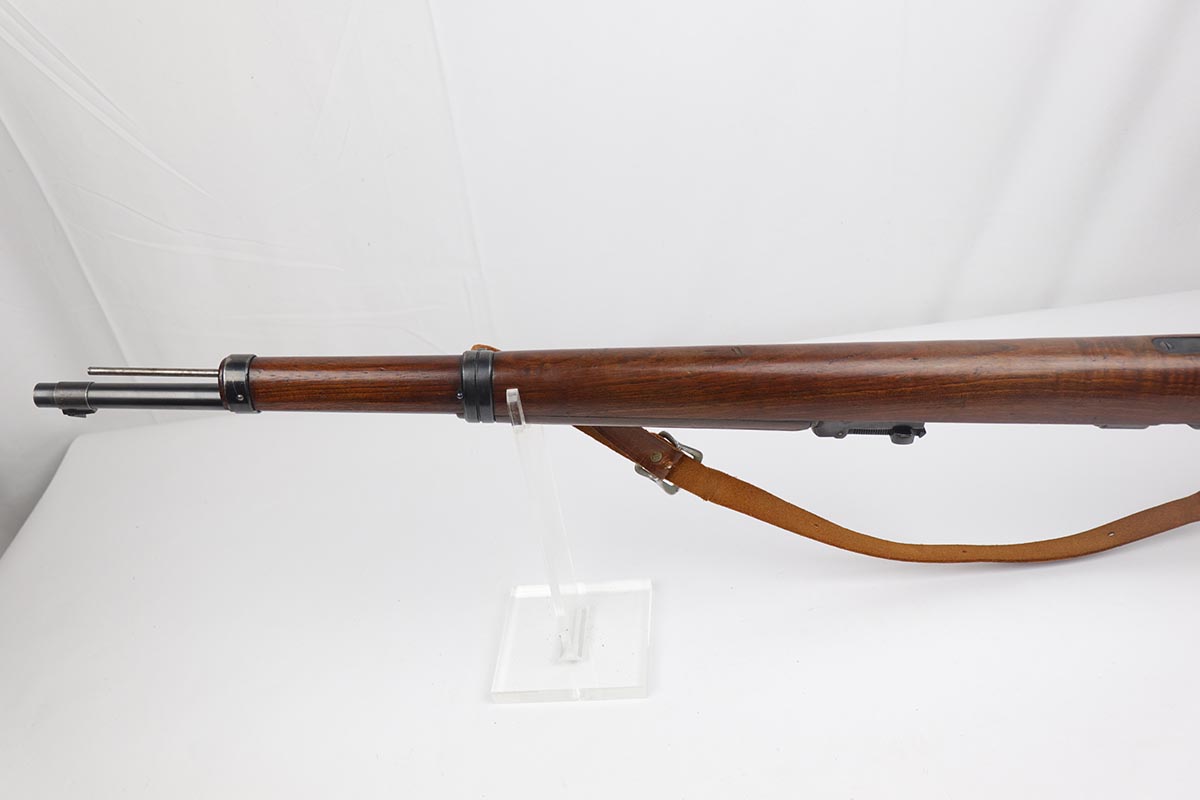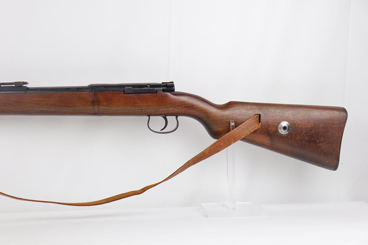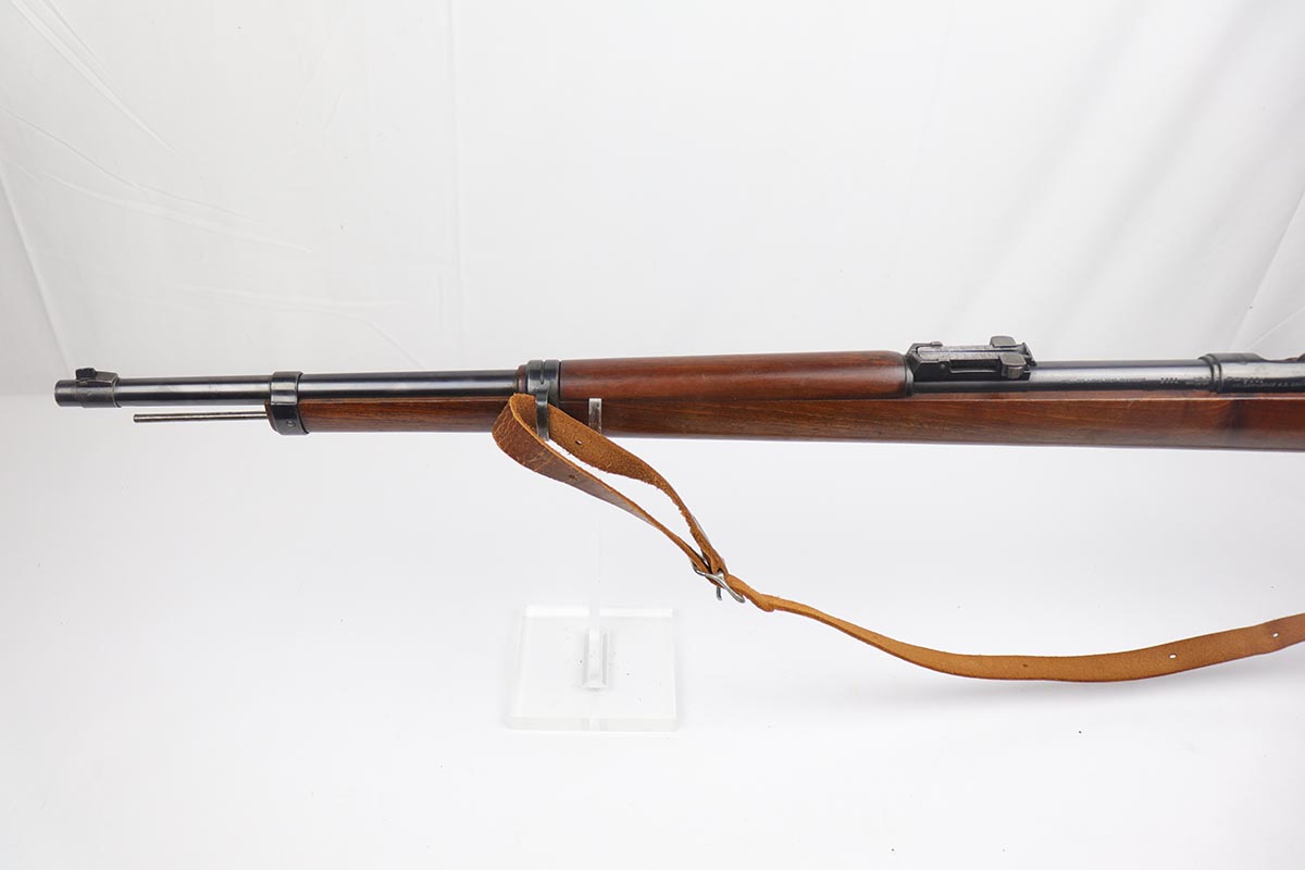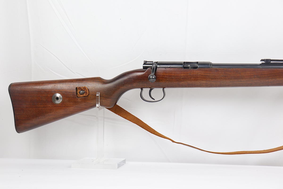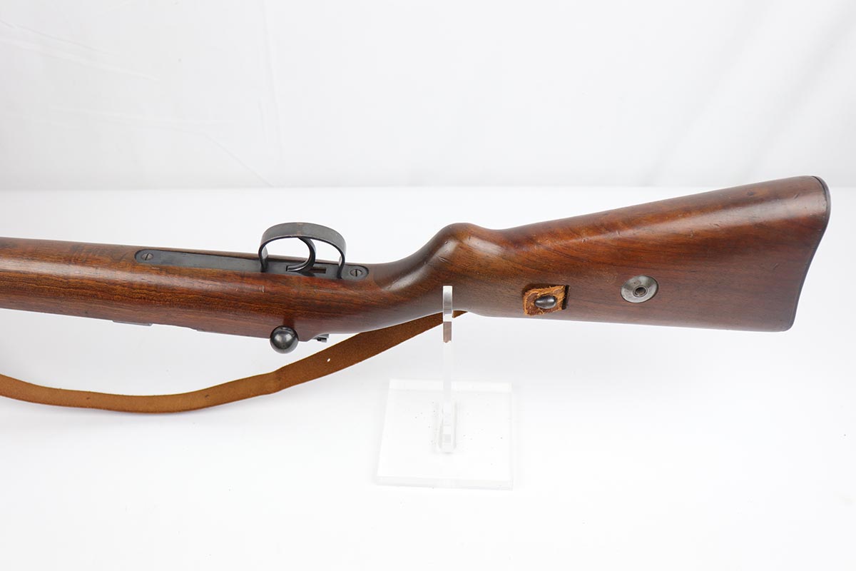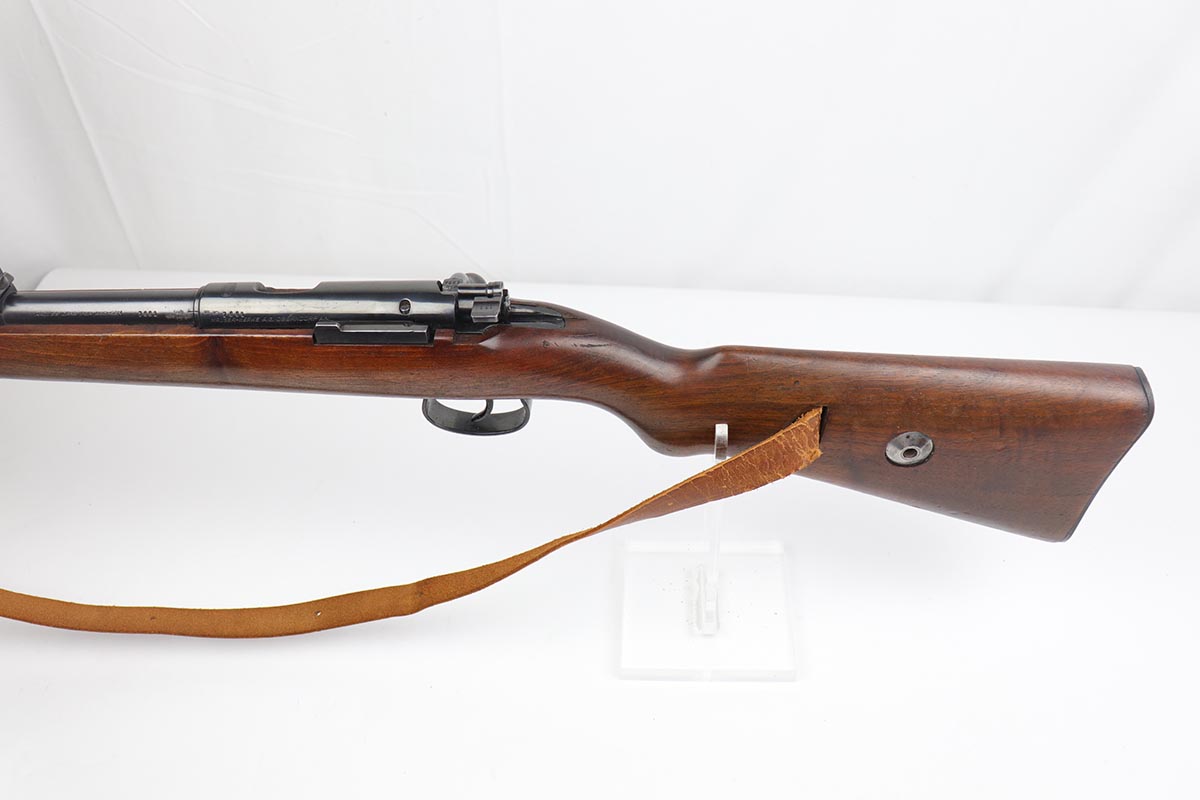 5/3/19 – This is a gorgeous high-polish WW2-era German Commercial Mauser Training Rifle, chambered for .22. The left side of the barrel is marked “Kal. 22 Lang Fur Buchsen”. The left side of the receiver is marked “Mauser-Werke A.G. Oberndorf A.N.”. The receiver is also marked with “Crown B”, “Crown U”, and “Crown G” proofs. All numbered parts are matching. No import marks. The finish is a beautiful high polish and appears to be original. As a whole, we would rate the finish on all the metal parts ~90%. Most of the finish loss is on the butt plate. There is also a little bit of wear on the bottom of the barrel straps and the underside of the trigger guard. If we were to rate the barrel and receiver alone, the finish would be ~98%. Most of the wear is around the muzzle. The wood stock is excellent. There are no major chips or scratches, just light dings and hadling marks throughout. The bore is excellent – shiny with strong rifling, 8.5/10. The action is very smooth and the gun is fully functional. The rifle comes with the original leather strap, although it is starting to crack throughout and has gotten relatively brittle. C&R eligible.