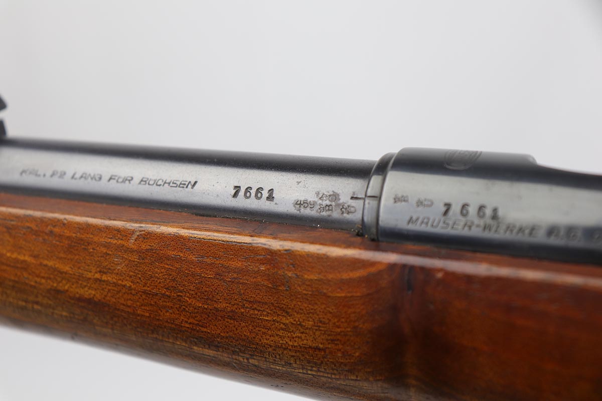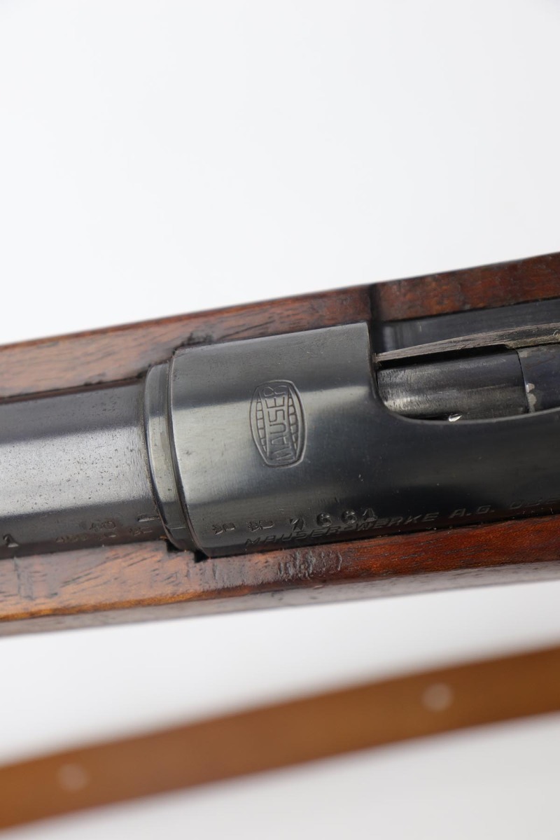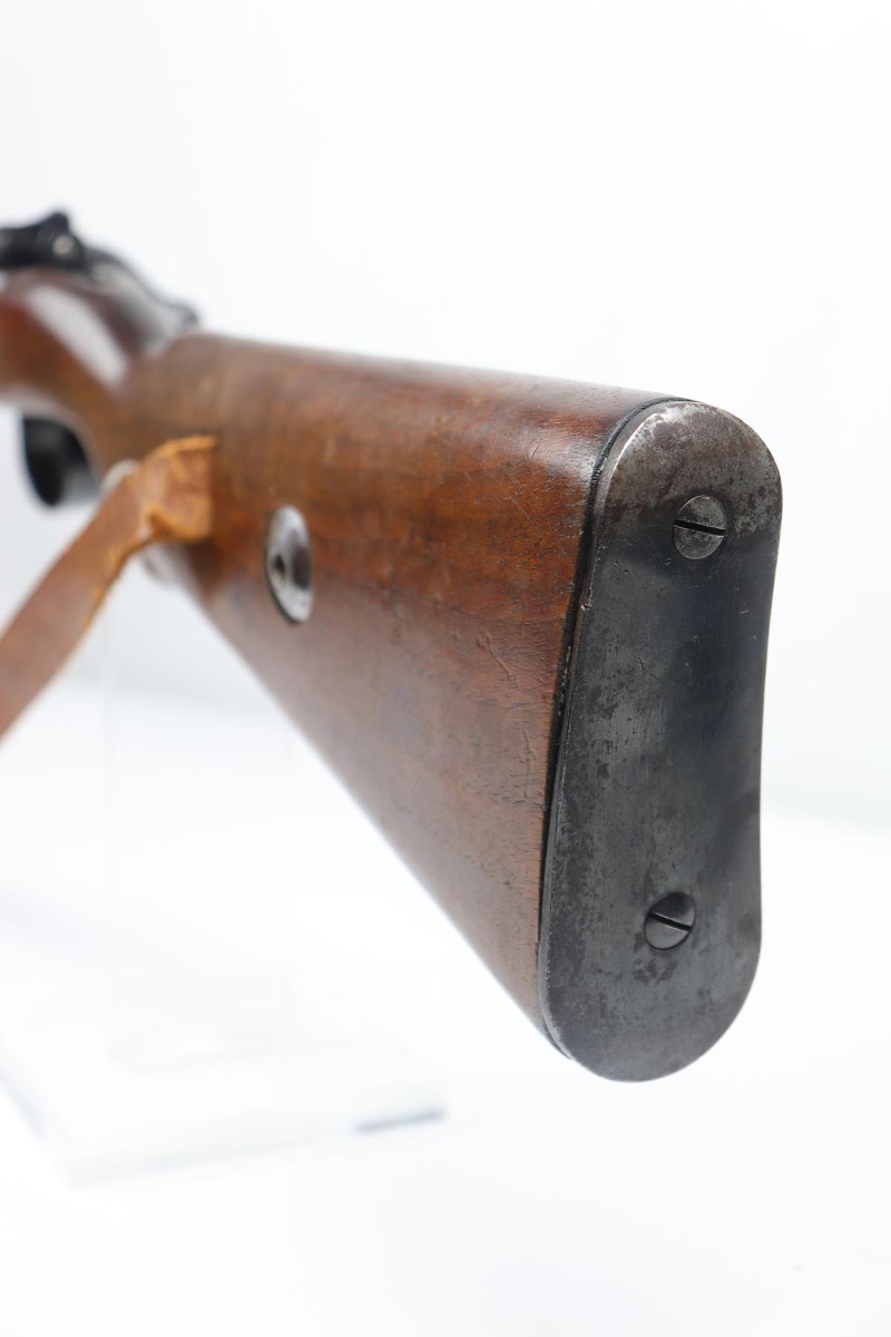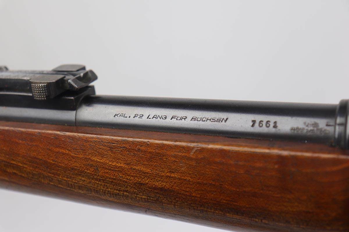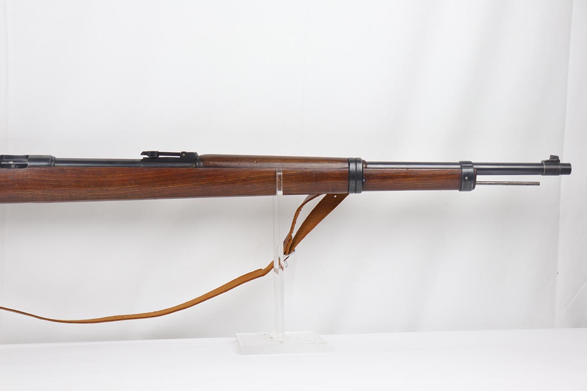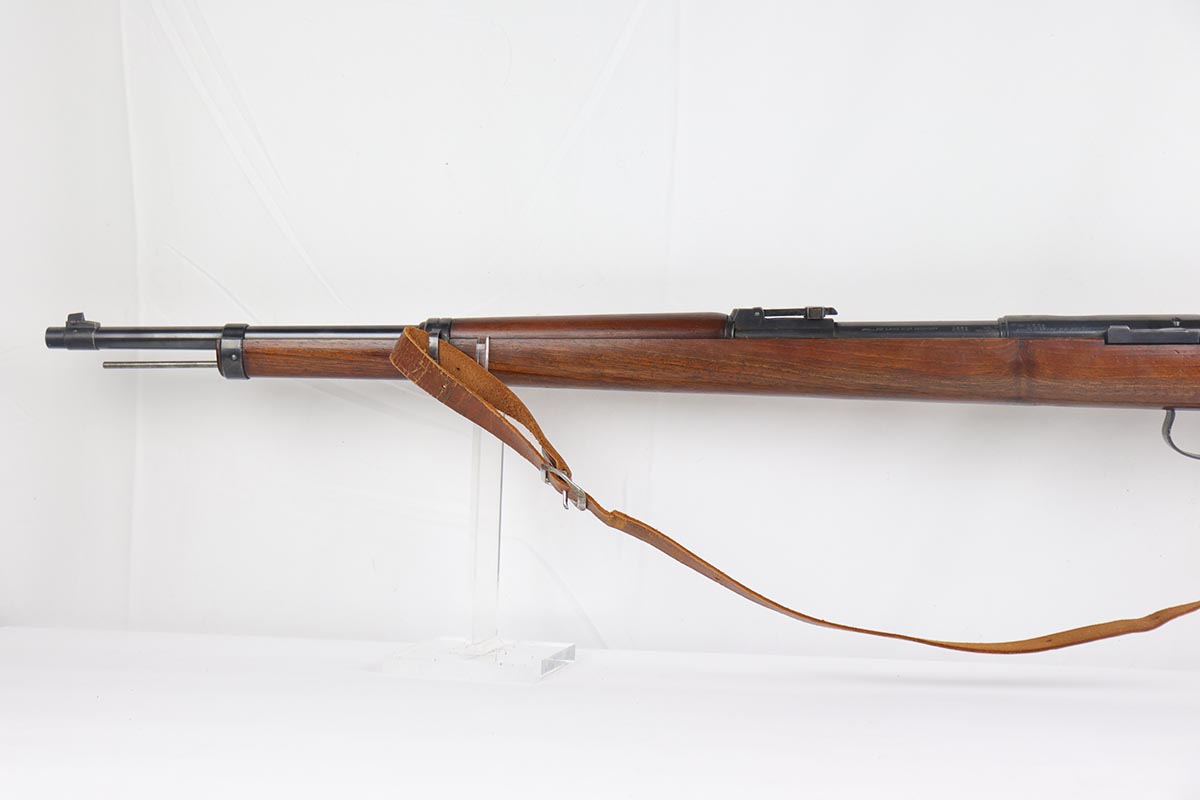 5/3/19 – This is a gorgeous high-polish WW2-era German Commercial Mauser Training Rifle, chambered for .22. The left side of the barrel is marked “Kal. 22 Lang Fur Buchsen”. The left side of the receiver is marked “Mauser-Werke A.G. Oberndorf A.N.”. The receiver is also marked with “Crown B”, “Crown U”, and “Crown G” proofs. All numbered parts are matching. No import marks. The finish is a beautiful high polish and appears to be original. As a whole, we would rate the finish on all the metal parts ~90%. Most of the finish loss is on the butt plate. There is also a little bit of wear on the bottom of the barrel straps and the underside of the trigger guard. If we were to rate the barrel and receiver alone, the finish would be ~98%. Most of the wear is around the muzzle. The wood stock is excellent. There are no major chips or scratches, just light dings and hadling marks throughout. The bore is excellent – shiny with strong rifling, 8.5/10. The action is very smooth and the gun is fully functional. The rifle comes with the original leather strap, although it is starting to crack throughout and has gotten relatively brittle. C&R eligible.