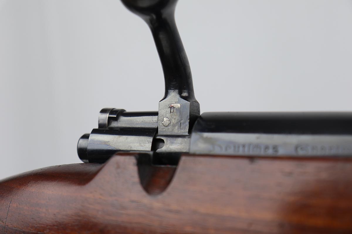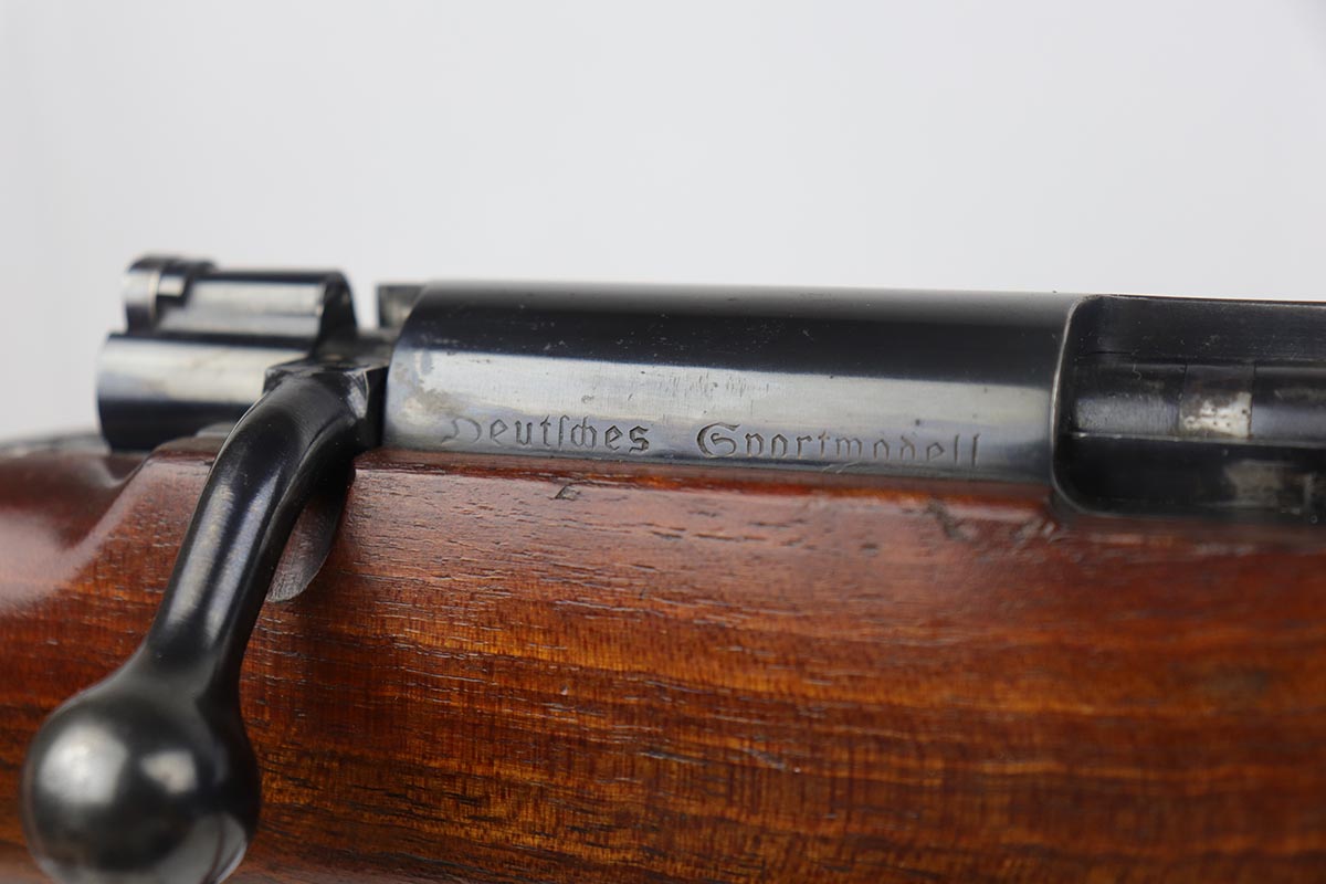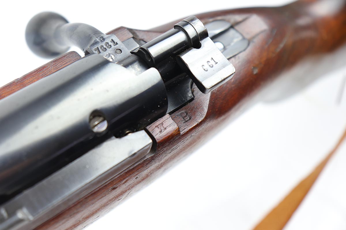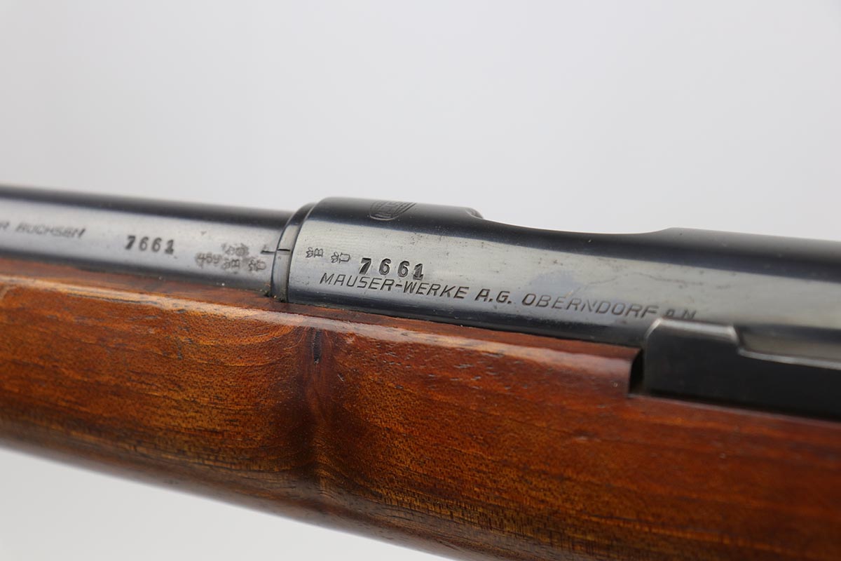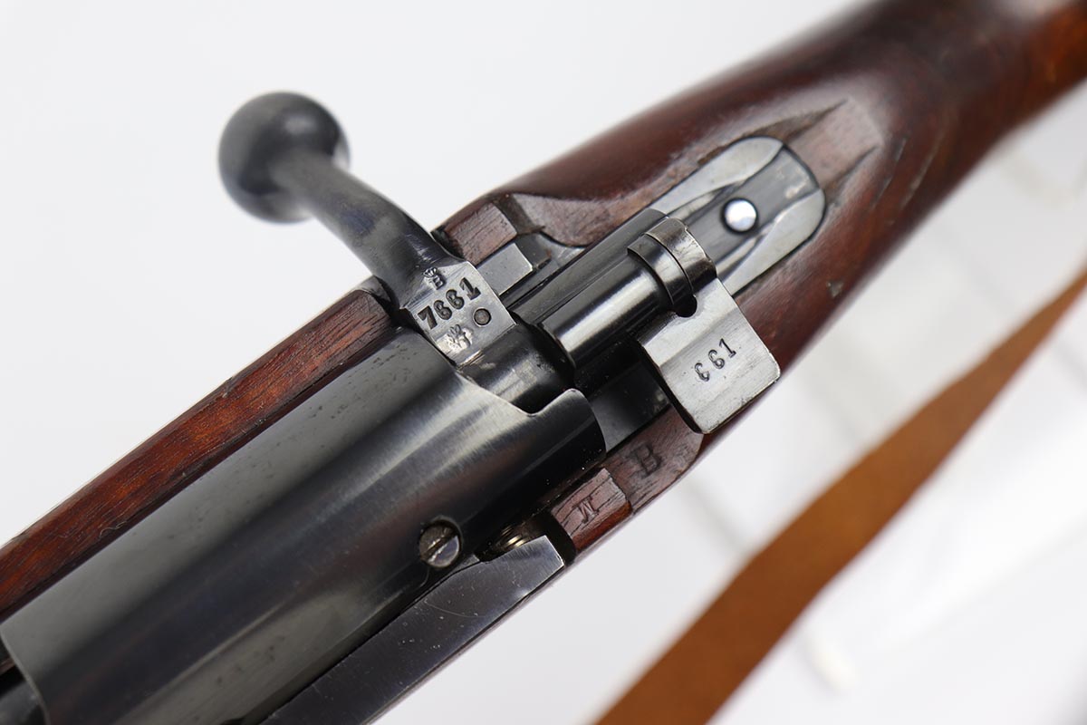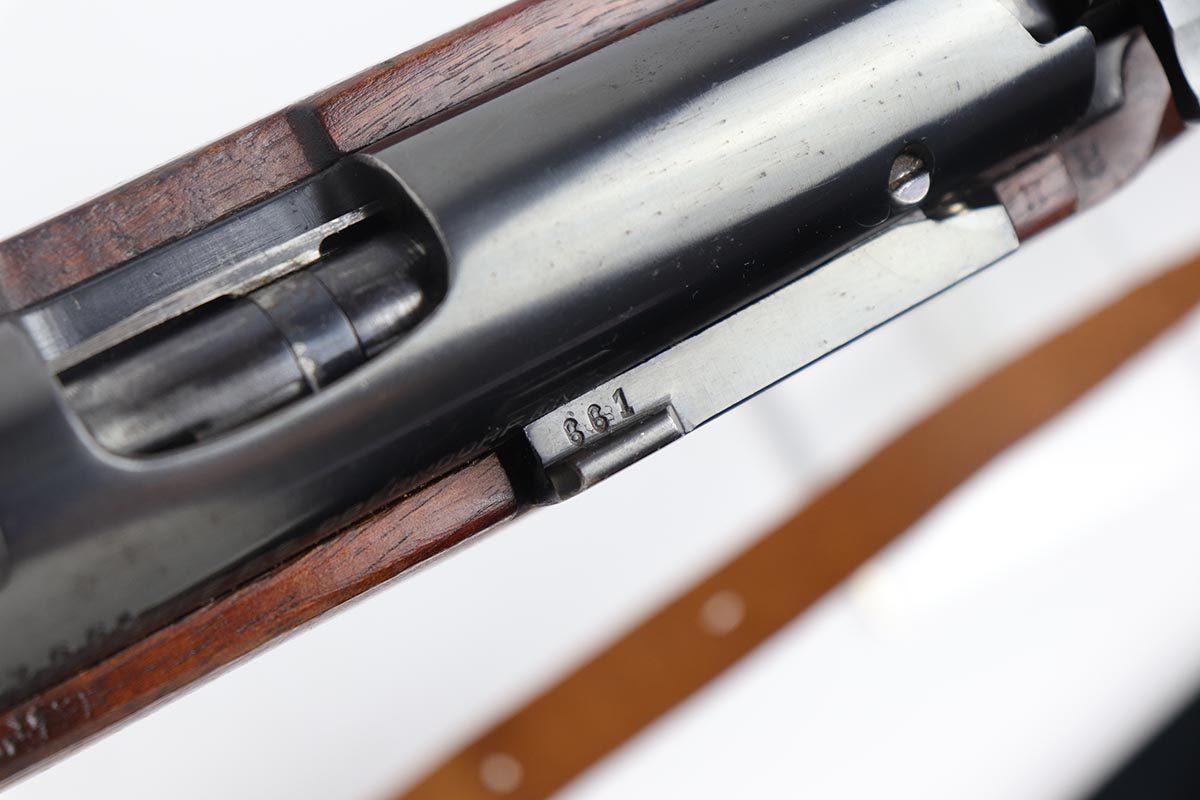 5/3/19 – This is a gorgeous high-polish WW2-era German Commercial Mauser Training Rifle, chambered for .22. The left side of the barrel is marked “Kal. 22 Lang Fur Buchsen”. The left side of the receiver is marked “Mauser-Werke A.G. Oberndorf A.N.”. The receiver is also marked with “Crown B”, “Crown U”, and “Crown G” proofs. All numbered parts are matching. No import marks. The finish is a beautiful high polish and appears to be original. As a whole, we would rate the finish on all the metal parts ~90%. Most of the finish loss is on the butt plate. There is also a little bit of wear on the bottom of the barrel straps and the underside of the trigger guard. If we were to rate the barrel and receiver alone, the finish would be ~98%. Most of the wear is around the muzzle. The wood stock is excellent. There are no major chips or scratches, just light dings and hadling marks throughout. The bore is excellent – shiny with strong rifling, 8.5/10. The action is very smooth and the gun is fully functional. The rifle comes with the original leather strap, although it is starting to crack throughout and has gotten relatively brittle. C&R eligible.