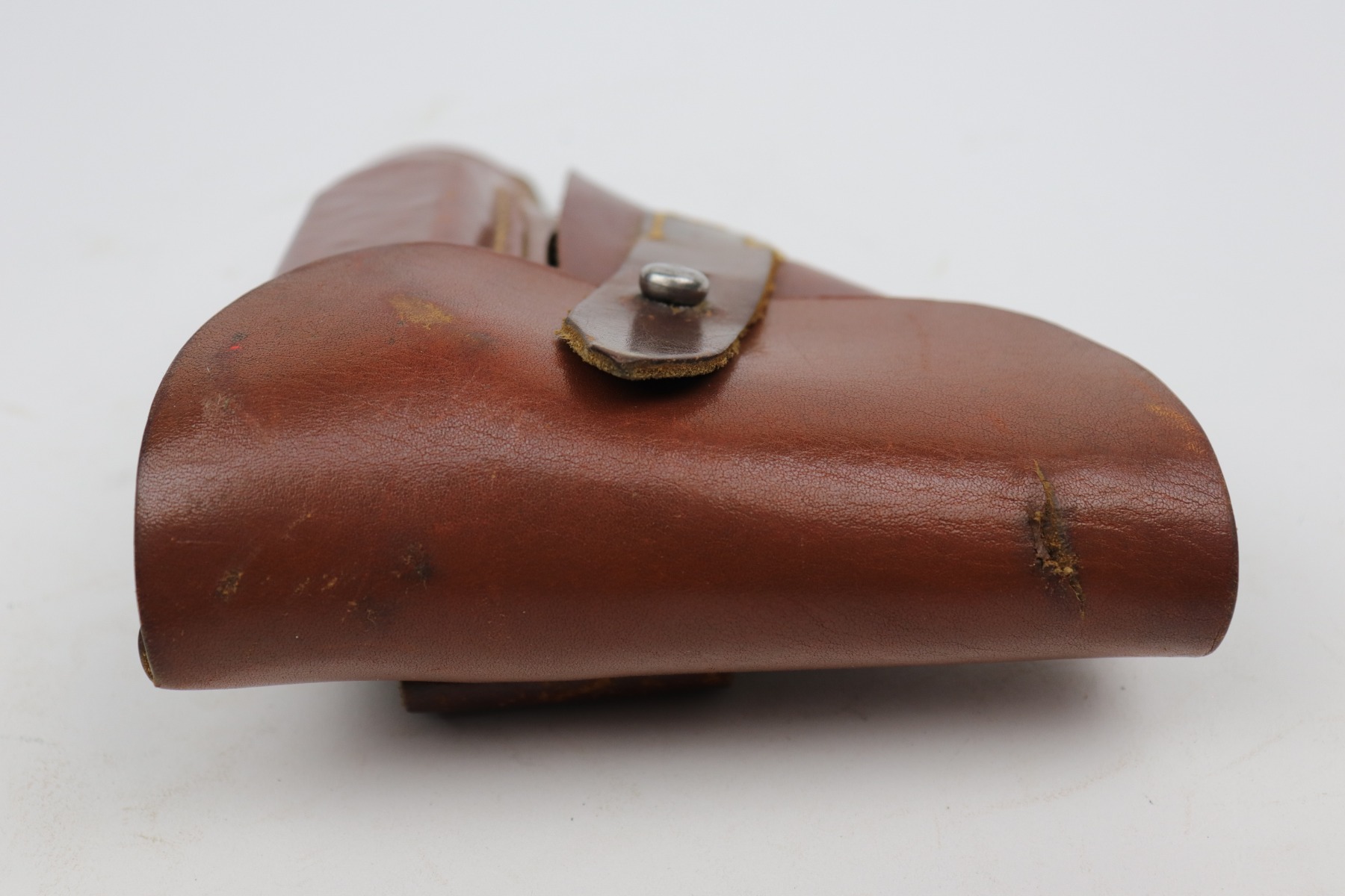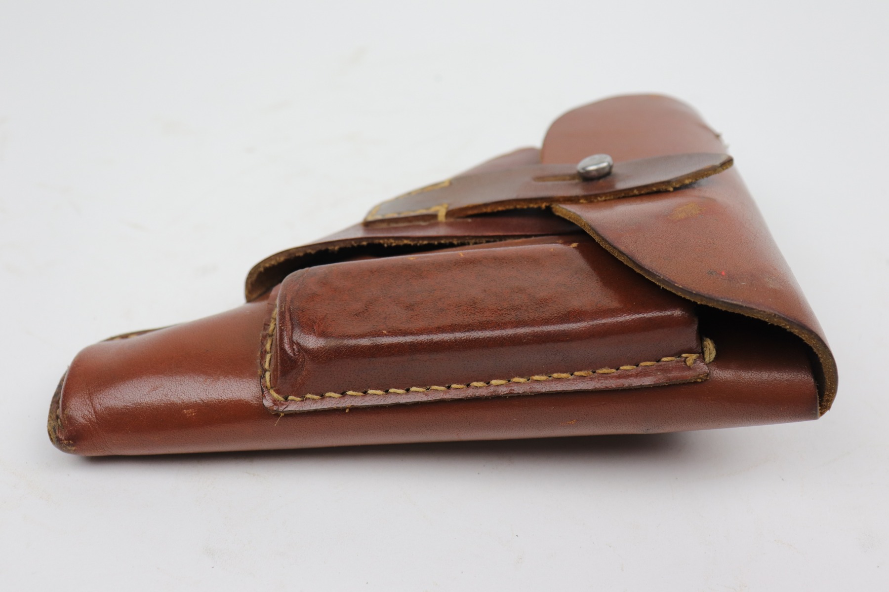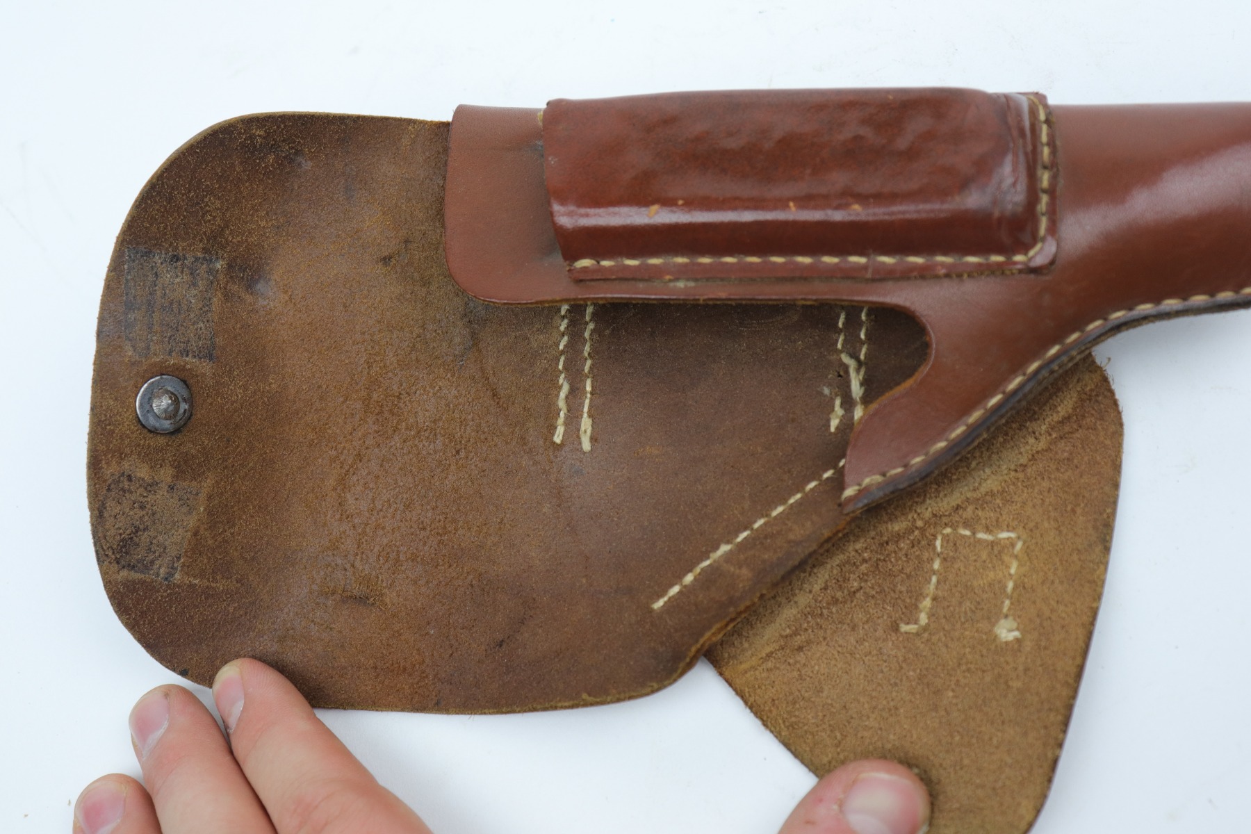 10/14/20 – This is an excellent example of a WW2-era brown leather holster for a Walther PP. The leather is in minty condition except for two small puncture holes in the top flap and a few scuffs here and there. No markings. There are a few stitches missing on the belt loop.