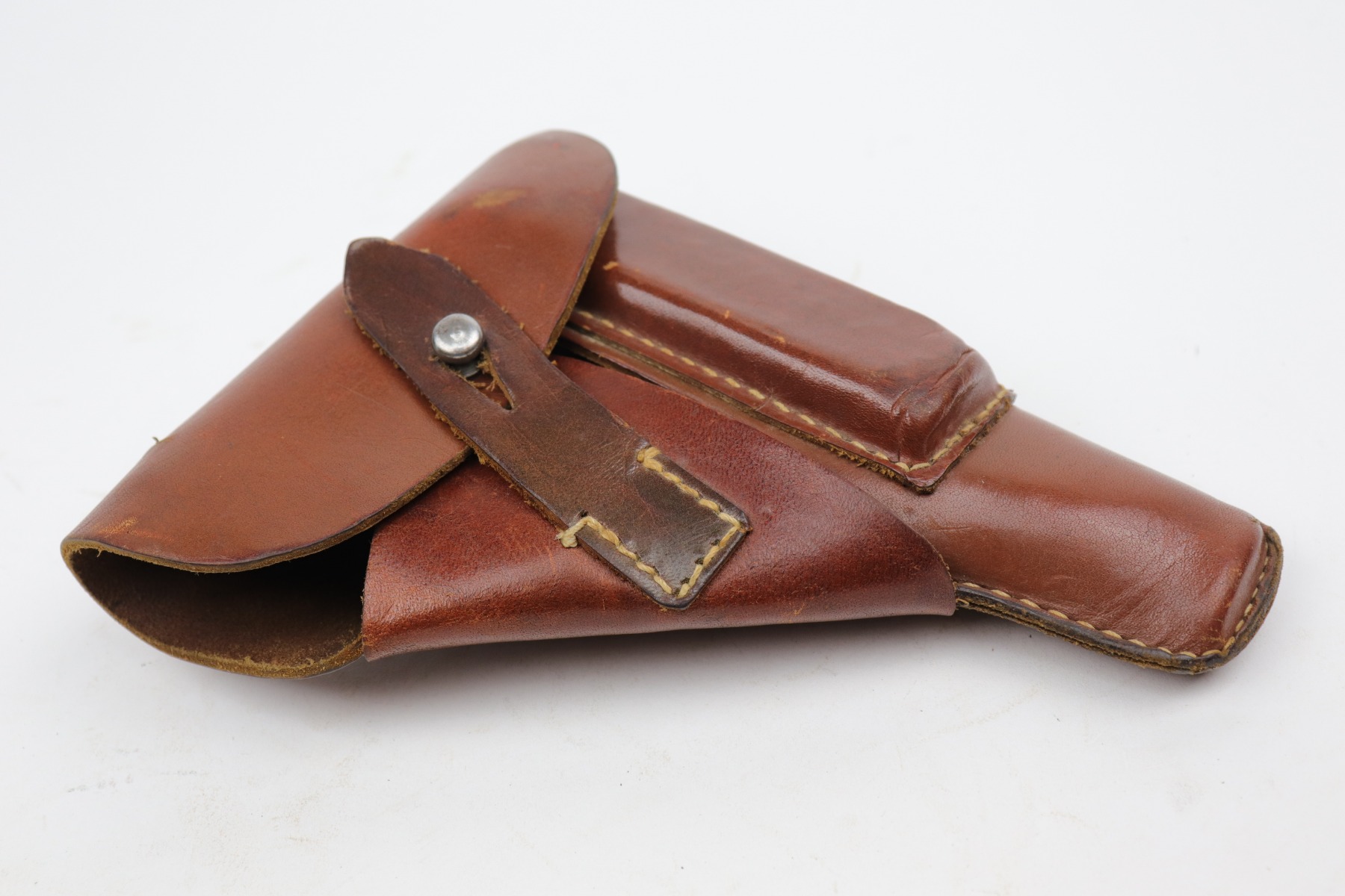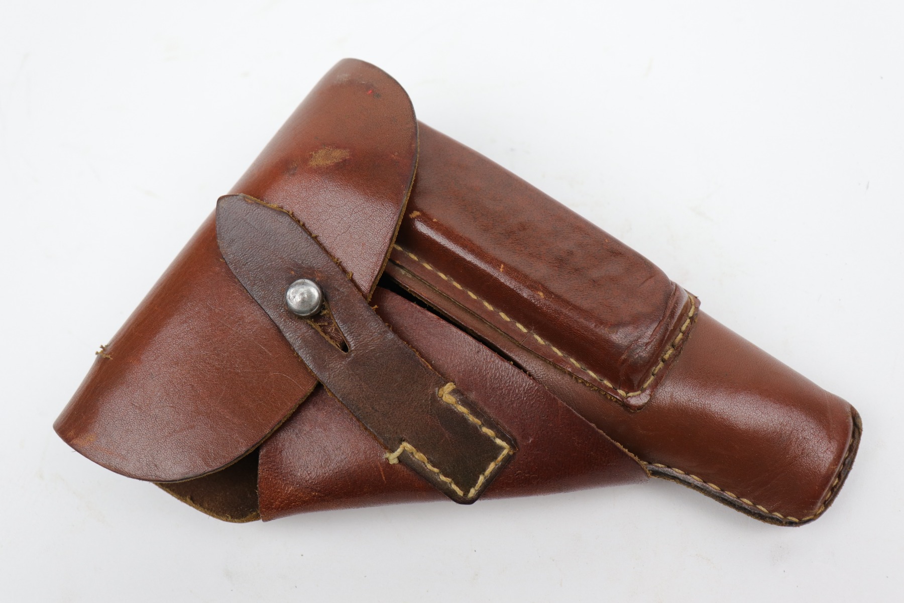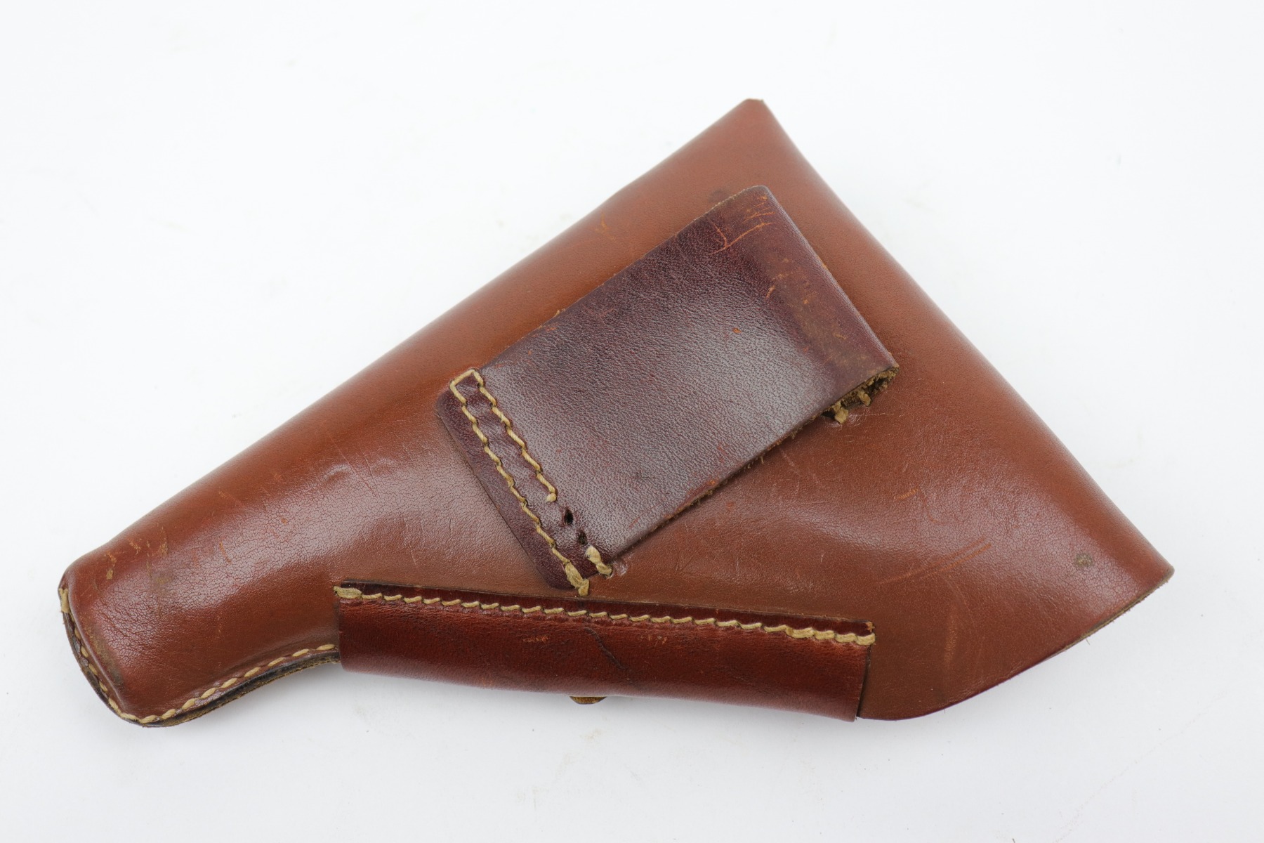 10/14/20 – This is an excellent example of a WW2-era brown leather holster for a Walther PP. The leather is in minty condition except for two small puncture holes in the top flap and a few scuffs here and there. No markings. There are a few stitches missing on the belt loop.