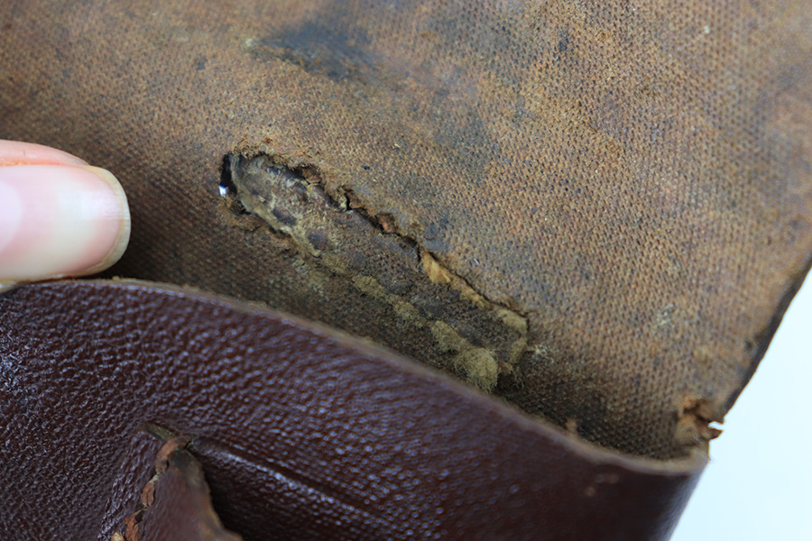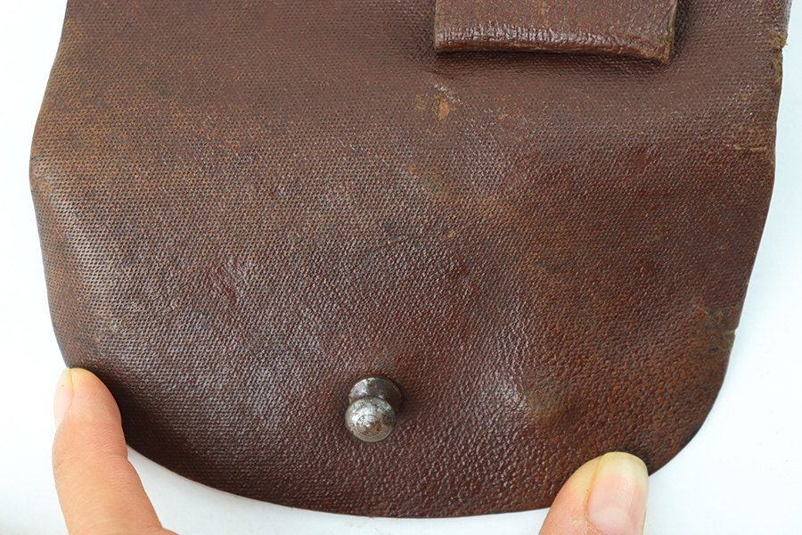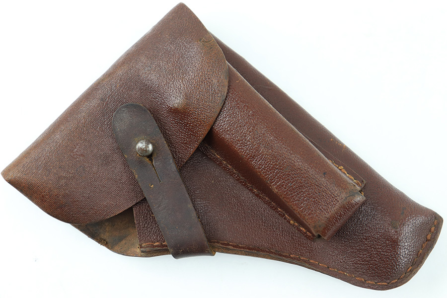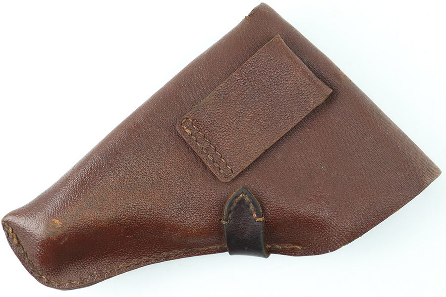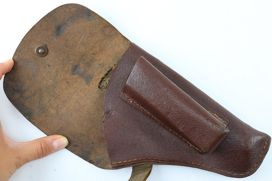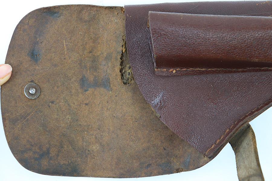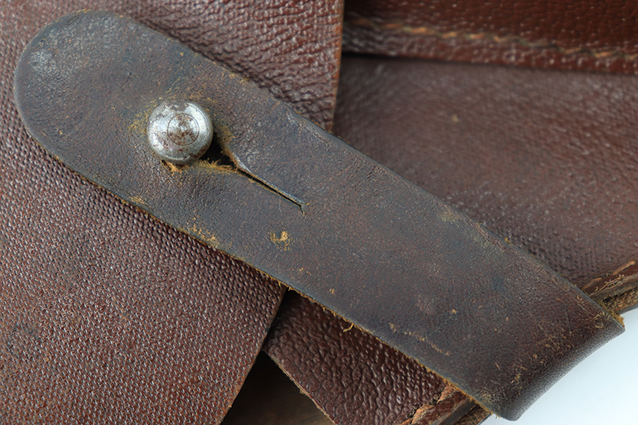 8/18/23 – This is a late WW2 production Ersatz 7.65mm holster for a Mauser HSc, Sauer 38h, or similar sized Axis pistol. The holster is in good overall condition, but there is a significant crack around the top of the belt loop, just above the stitching. The holster is otherwise intact and all original. The closure strap is leather and the rest of the holster is late-war ersatz material. Normal signs of use and aging. No markings or stamps.