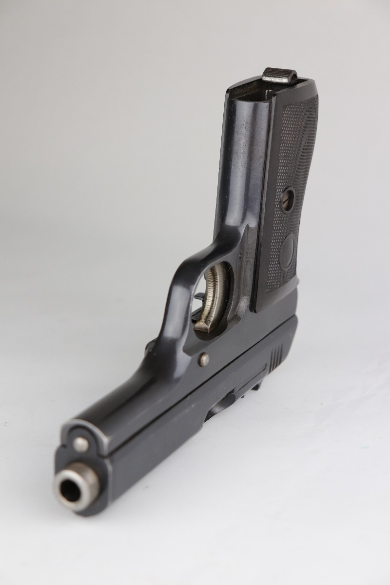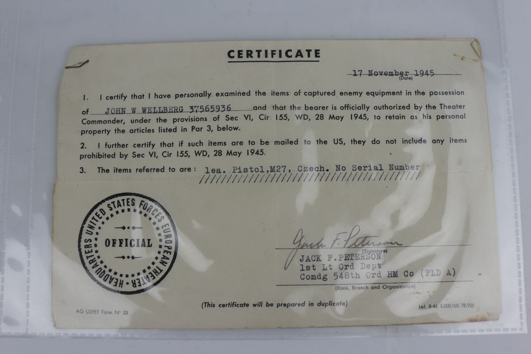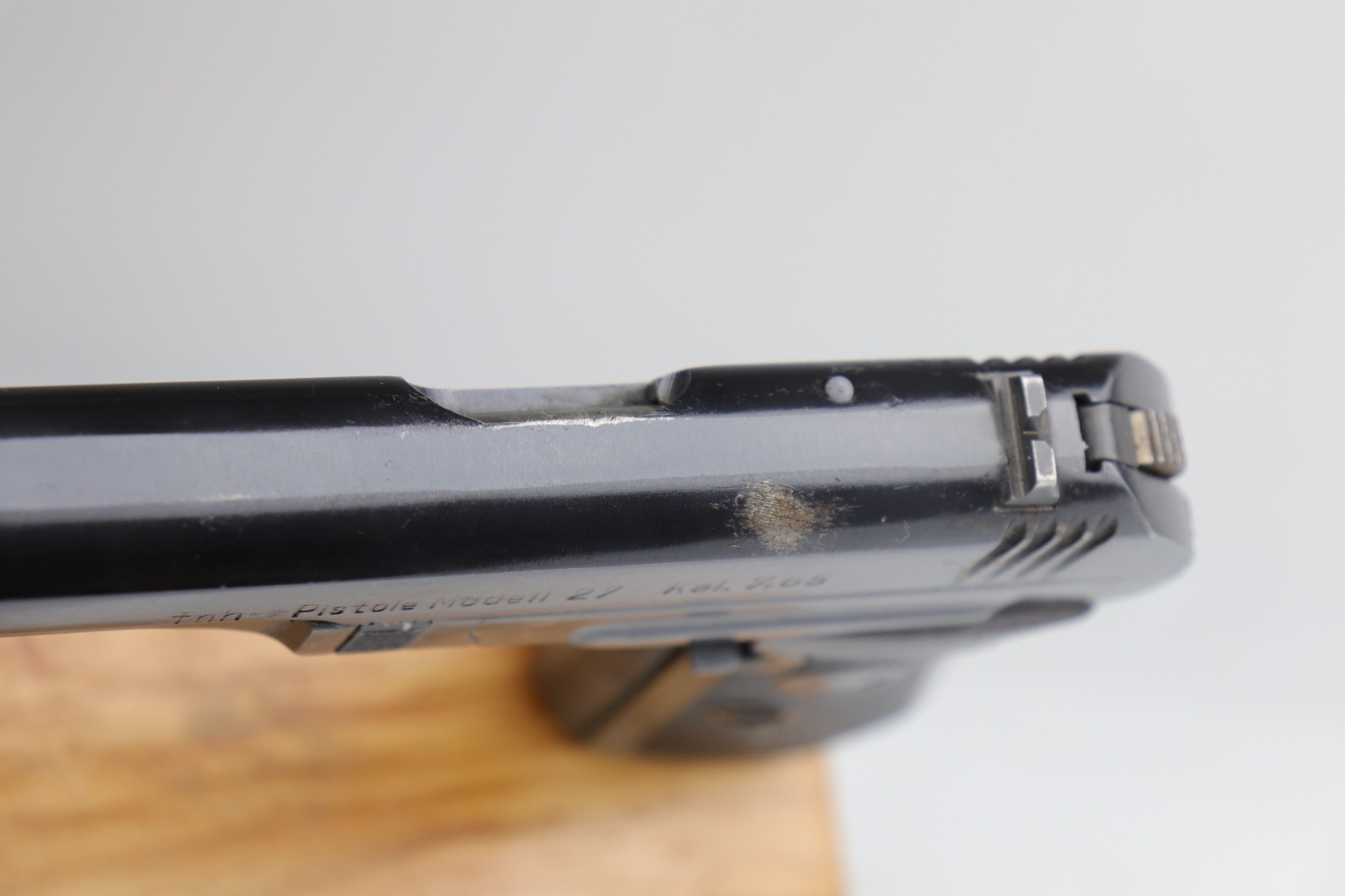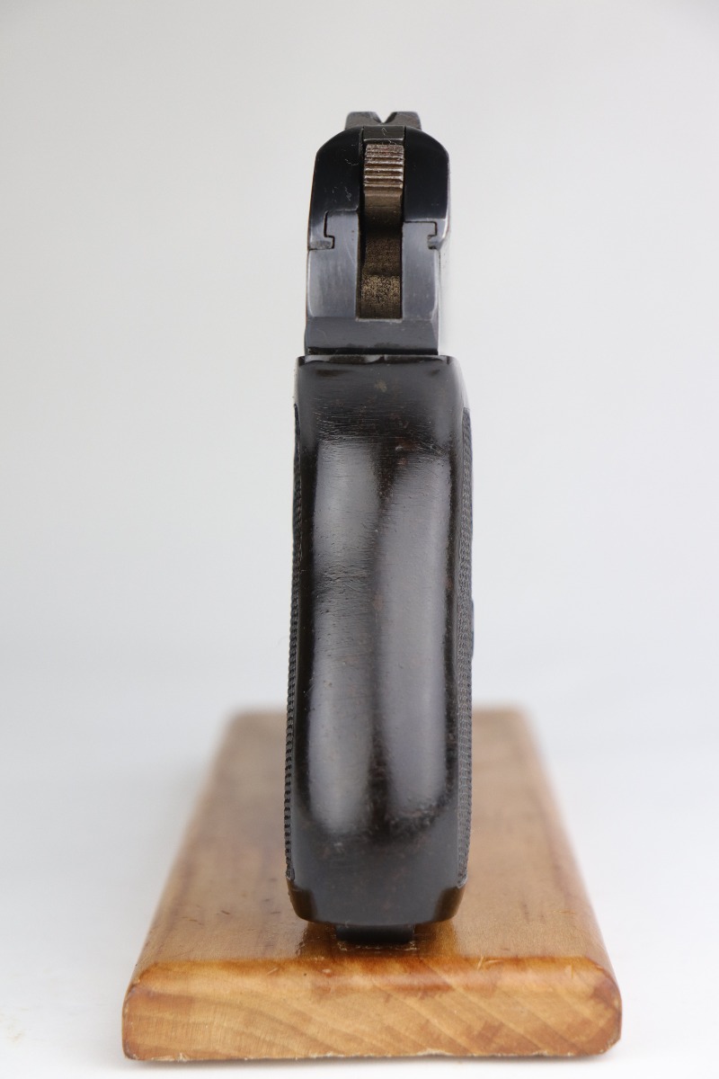 8/21/20 – This particular pistol is a bit of a fascinating mystery. It is a WW2-era CZ 27 with no serial number, no legend on the top of the slide, no firing proofs, no markings (other than the slide legend), and late war grips with no “CZ” symbol. It also comes with a capture document, dated 1945, that says CZ 27 pistol with no serial number. With all of these details in mind, our prevailing theory is that this gun was in the factory at the end of the war, was never test-proofed, and the top slide legend was ground off in the factory to remove all remnants of the Nazi occupation, and it was then captured by a US GI immediately after the war. This is just our theory, but examine the photos and decide for yourself. This gun has retained about 95-96% of its bluing. There are a few areas of wear, most noticeable on toward the top of the left side of the slide, two small spots on the left side of the frame, and a few small spots on the right side of the slide. The grip is excellent – no chips or cracks. It comes with a period-correct magazine. The bore is excellent – shiny with strong rifling.