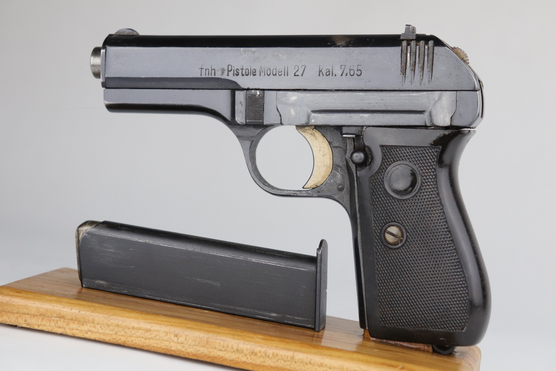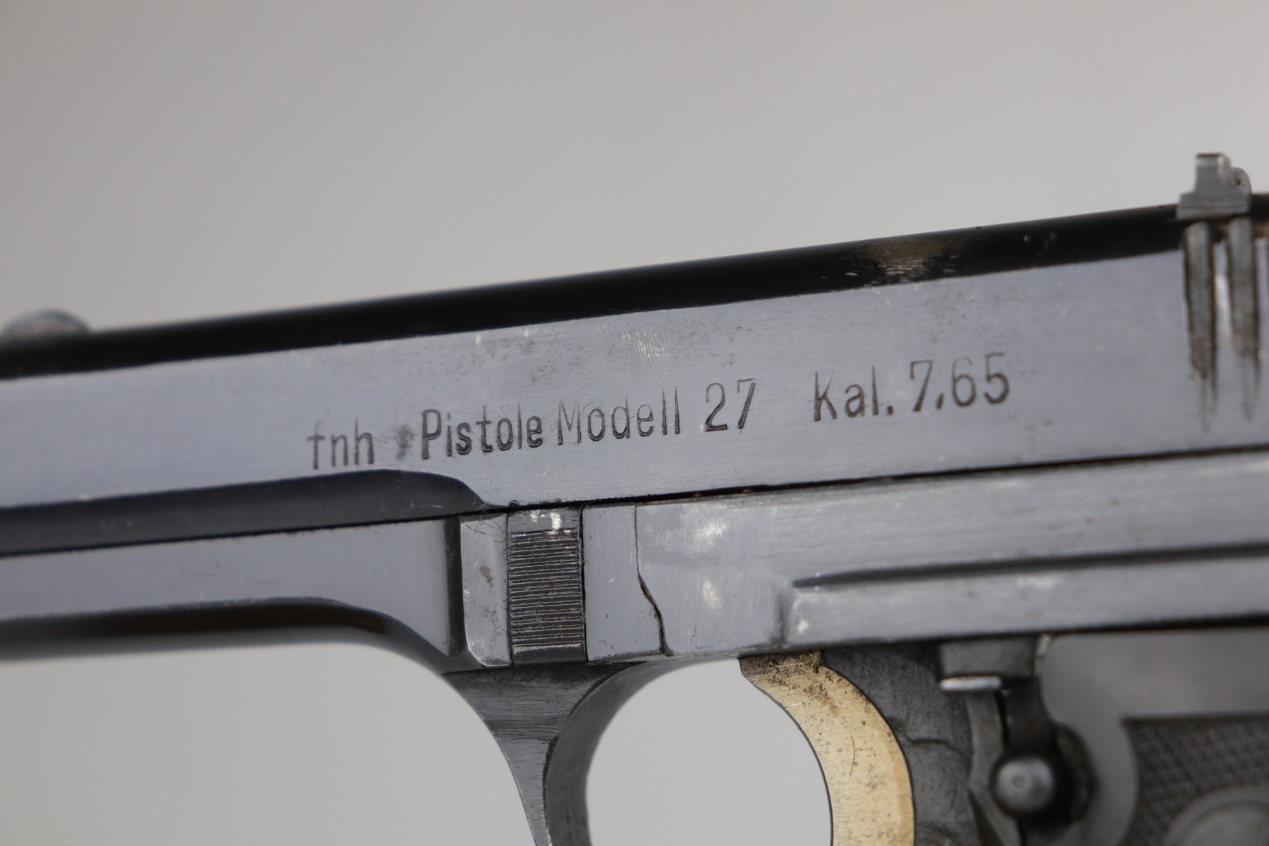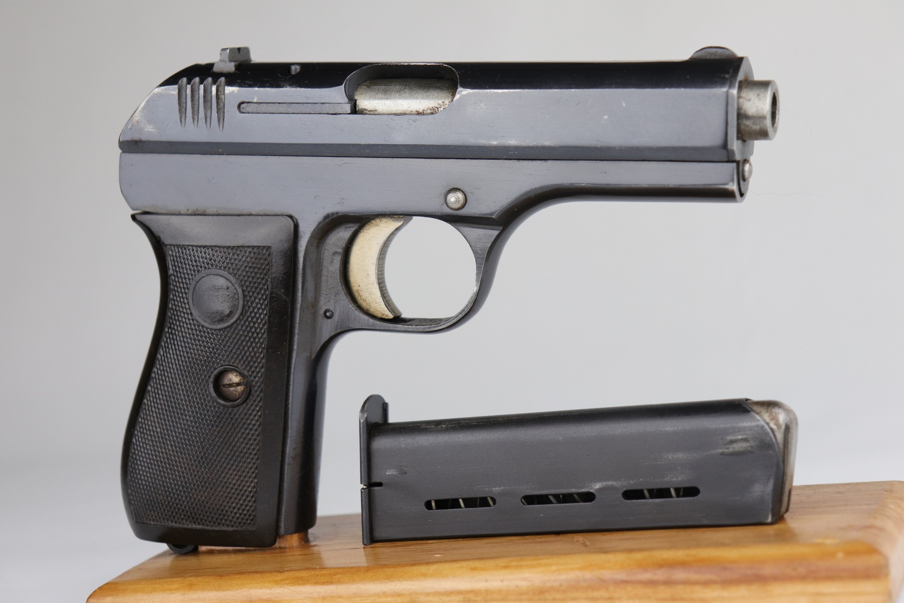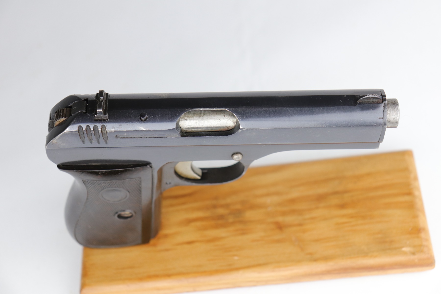 8/21/20 – This particular pistol is a bit of a fascinating mystery. It is a WW2-era CZ 27 with no serial number, no legend on the top of the slide, no firing proofs, no markings (other than the slide legend), and late war grips with no “CZ” symbol. It also comes with a capture document, dated 1945, that says CZ 27 pistol with no serial number. With all of these details in mind, our prevailing theory is that this gun was in the factory at the end of the war, was never test-proofed, and the top slide legend was ground off in the factory to remove all remnants of the Nazi occupation, and it was then captured by a US GI immediately after the war. This is just our theory, but examine the photos and decide for yourself. This gun has retained about 95-96% of its bluing. There are a few areas of wear, most noticeable on toward the top of the left side of the slide, two small spots on the left side of the frame, and a few small spots on the right side of the slide. The grip is excellent – no chips or cracks. It comes with a period-correct magazine. The bore is excellent – shiny with strong rifling.