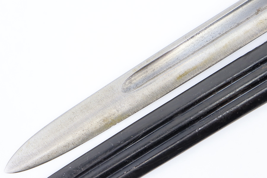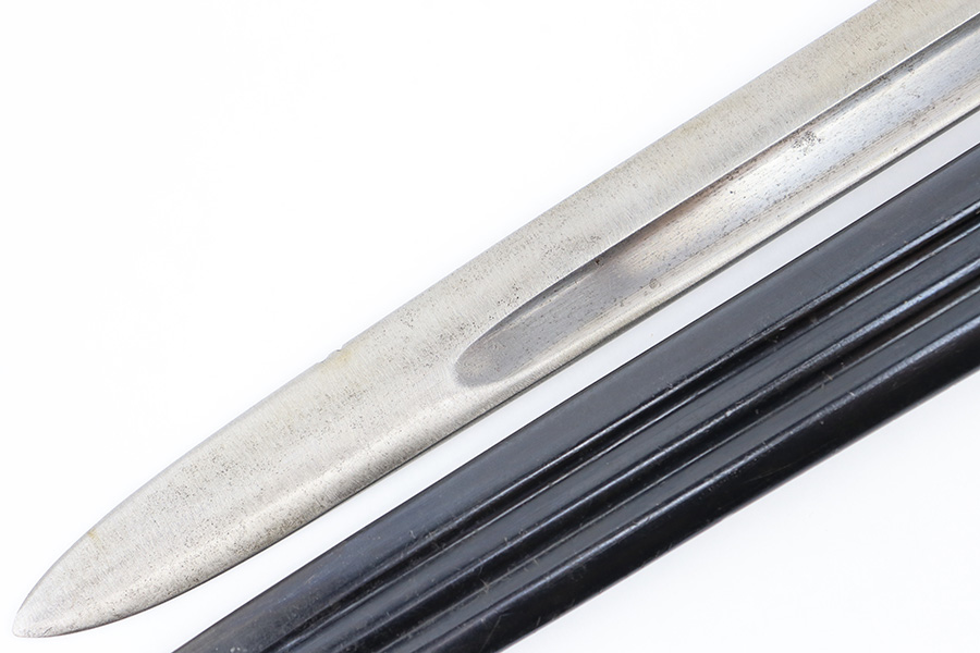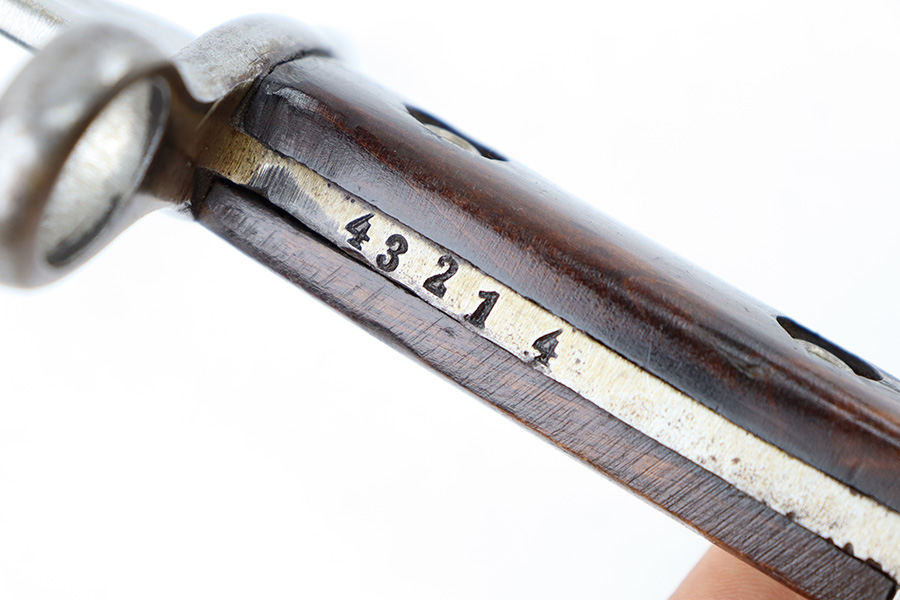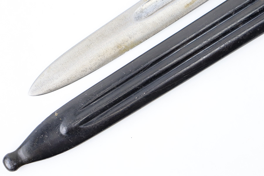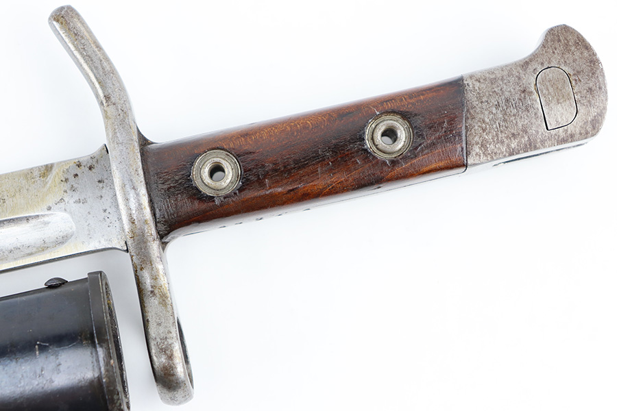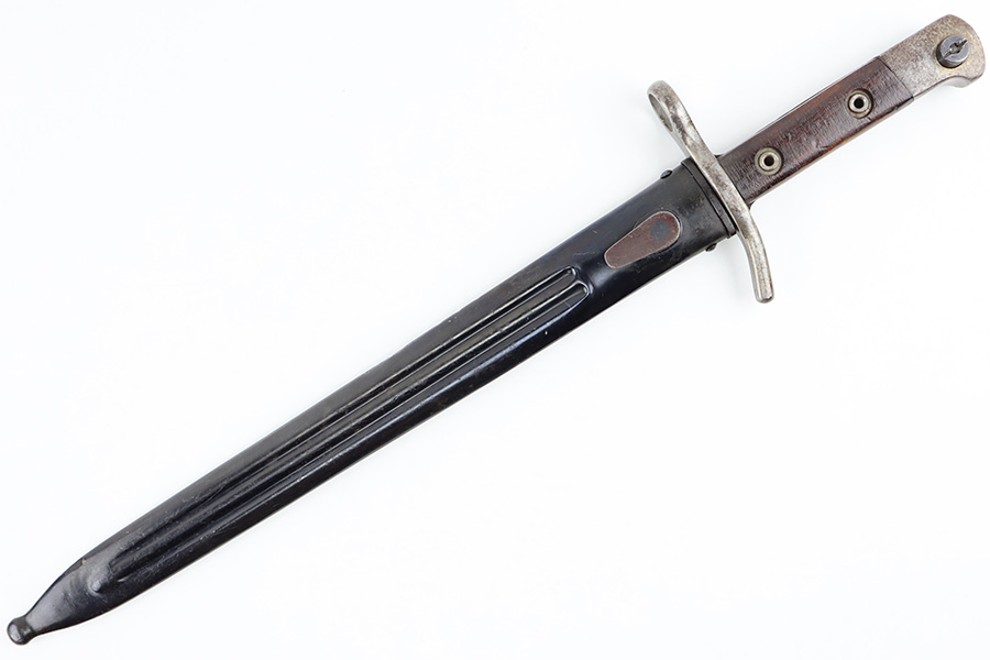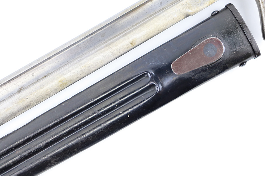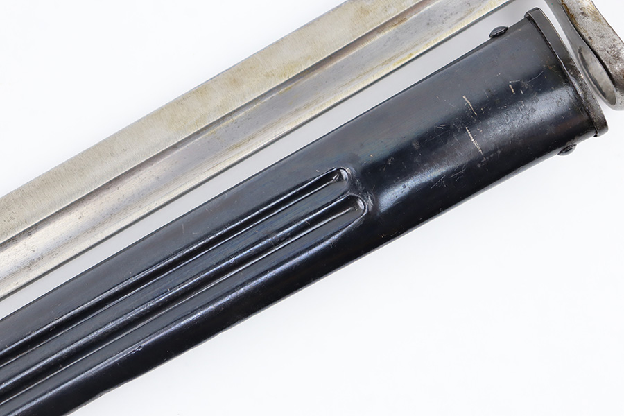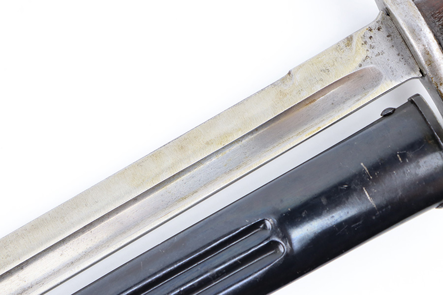 8/30/23 – This is an original Finnish M1927 rifle bayonet. These were mostly used with M/27 Mosin-Nagant Rifles during WW2. The bayonet comes with an original scabbard and is great overall condition. The blade is maker marked “Fiskars” on one side of the base, and has light surface patina throughout. There are two small nicks along the edge from use. No signs of re-sharpening. The cross guard and hilt of the bayonet has mild patina, and the spine of the hilt is serial numbered. The wood grips are original and excellent. The scabbard is in great condition with some mild patina and a few small dings and imperfections but no major issues.