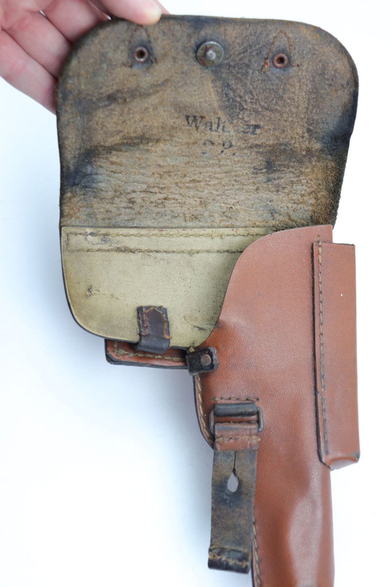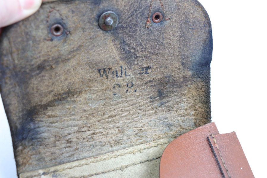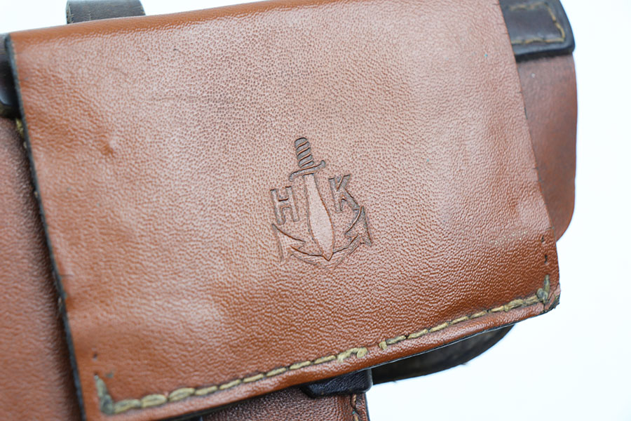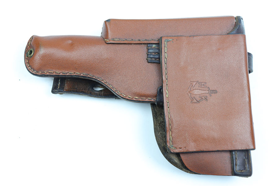 12/31/20 – This is an original luftwaffe dropping style holster for a 1922 FN or Femaru model 37. The holster is late war production with an ersatz lower body and leather upper. An interesting combination and fairly scarce. The interior leather is Walther P.P. ink stamped, but we believe this is a post factory stamp. Not 100% sure however. No stitching issues.