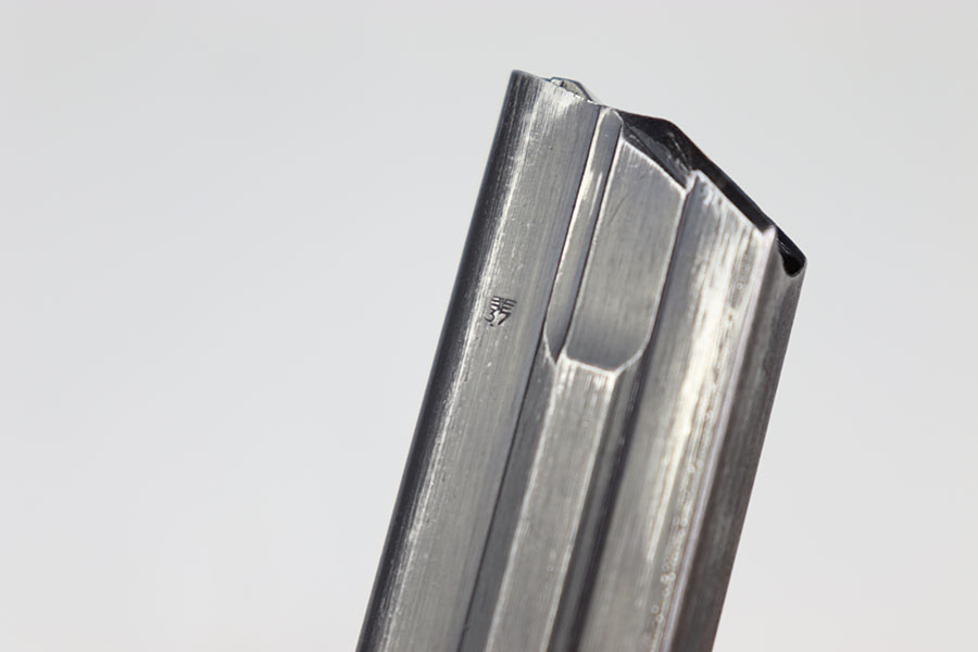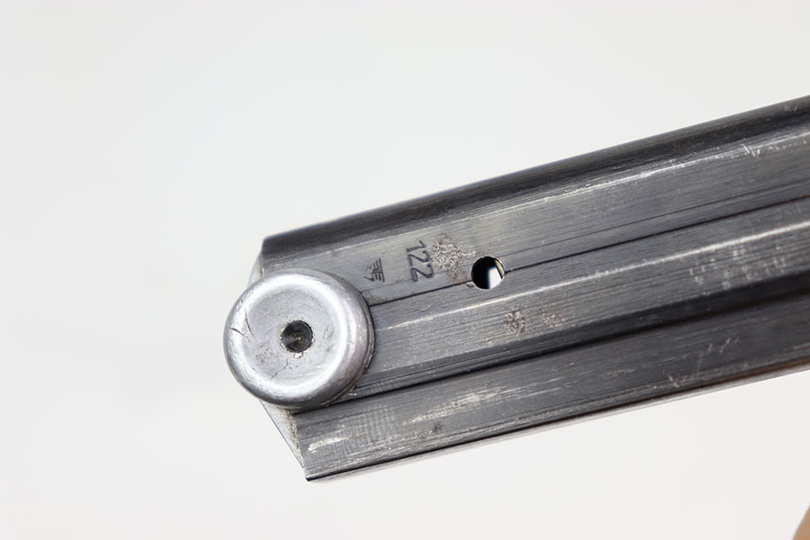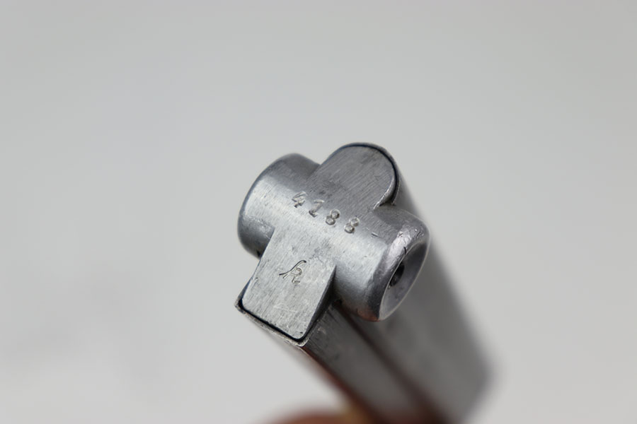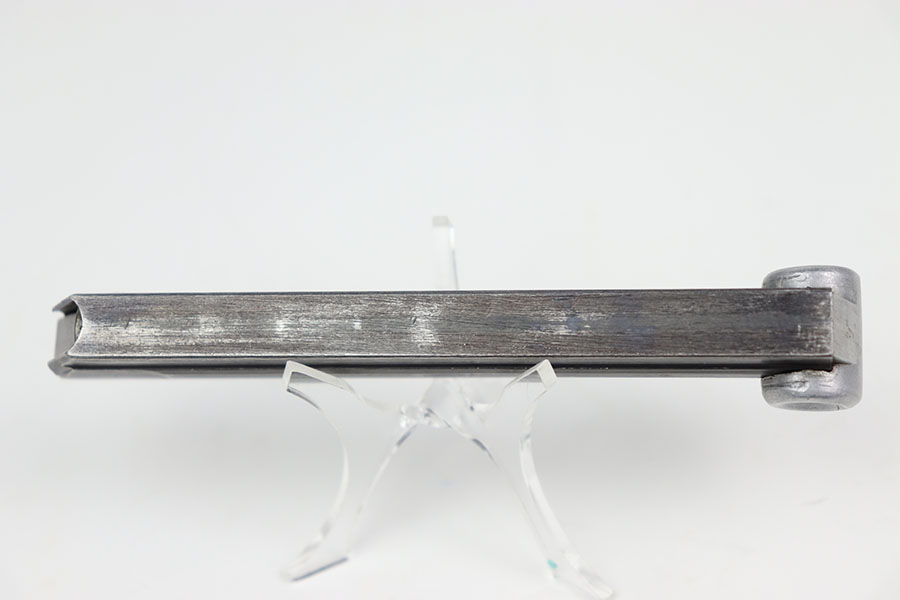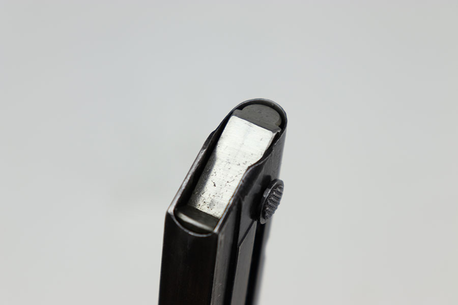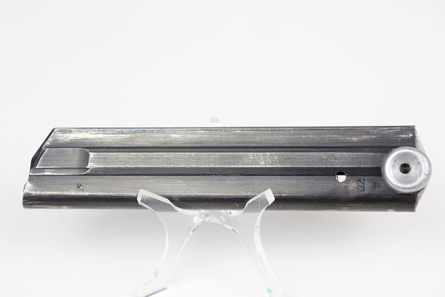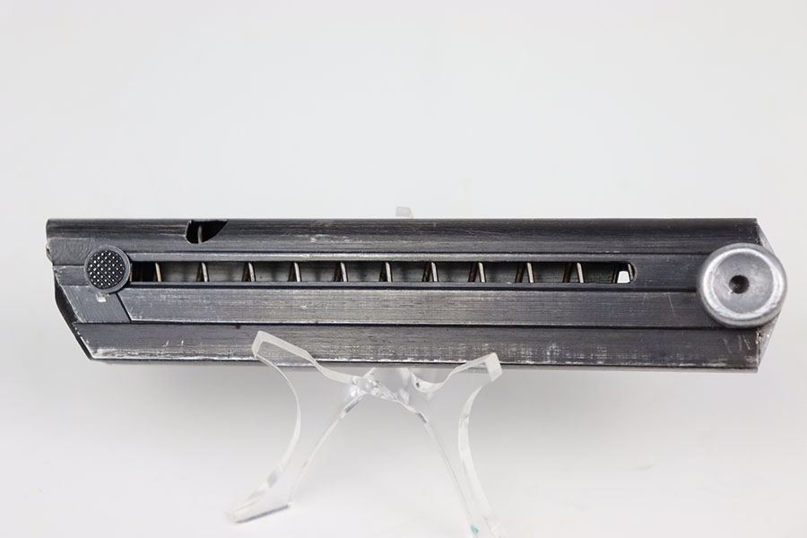 8/31/24 – This is an original “122” code late war variation (1939-41) Luger magazine from WW2. The magazine has a blued tube and aluminum base. The base is marked with the serial number “4188k”. The left side of the tube is “122” code stamped by Haenel with two “Eagle 37” proof stamps. The magazine is in great+ overall condition, with strong bluing throughout the tube. There is some minor wear along the spine and front edge. Has a strong and fully functional spring.