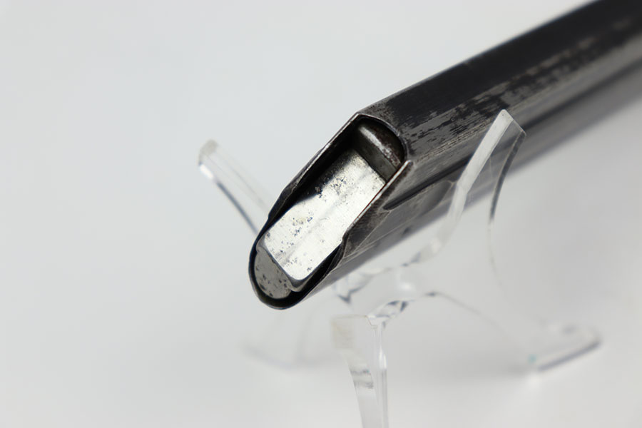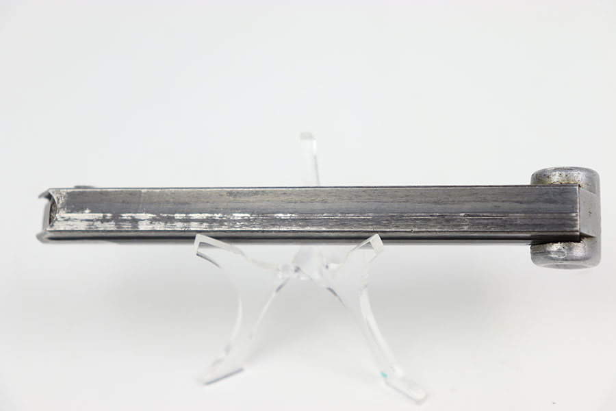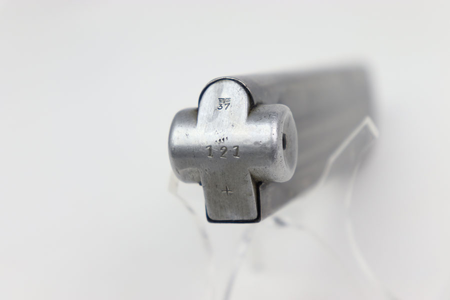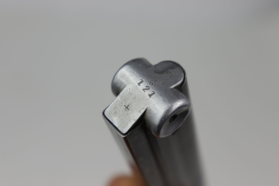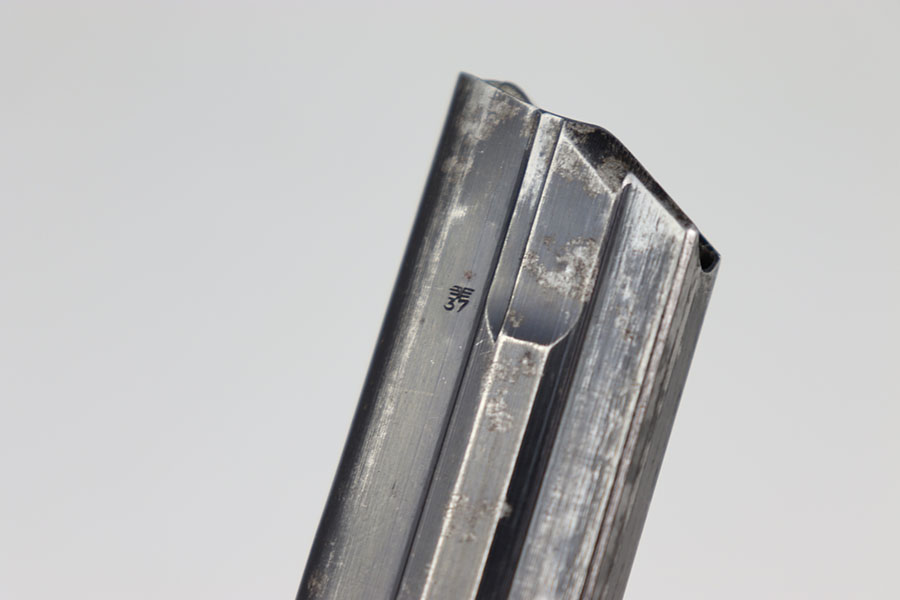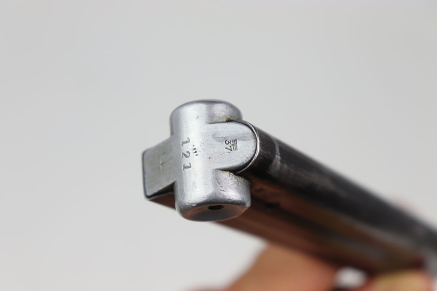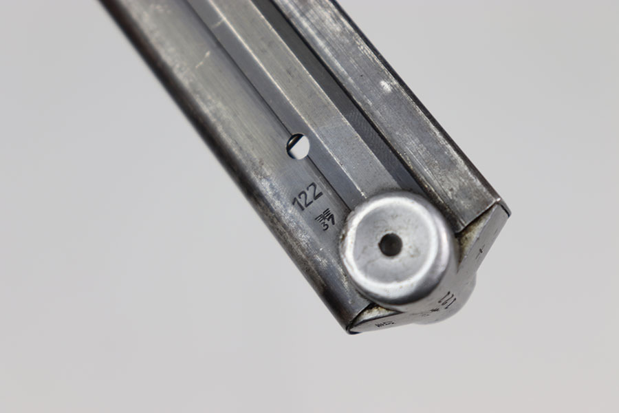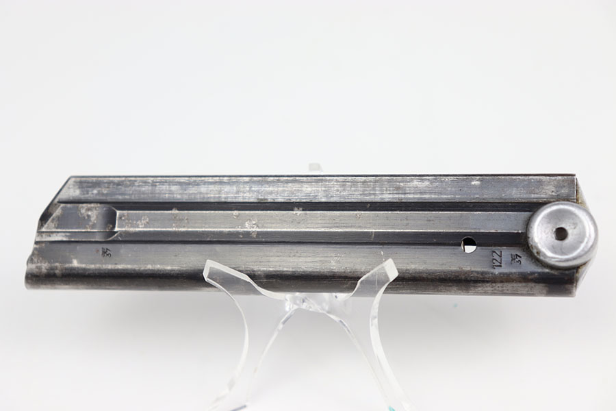 10/2/24 – This is an original “122” code late war variation (1939-41) Luger magazine from WW2. The magazine has a blued tube and aluminum base. The base is marked with the serial number “121” with no suffix which makes this an earlier magazine. The left side of the tube is “122” code stamped by Haenel with two “Eagle 37” proof stamps. The magazine is in good overall condition, with a couple spots of mild oxidation and some moderate wear throughout the original bluing. The aluminum base has some dings on each side but is marked with the “Eagle 37” stamp, serial number, and plus. The magazine has a strong and fully functional spring.