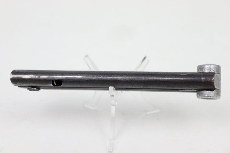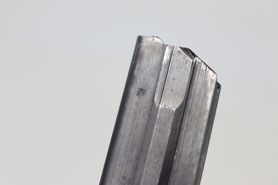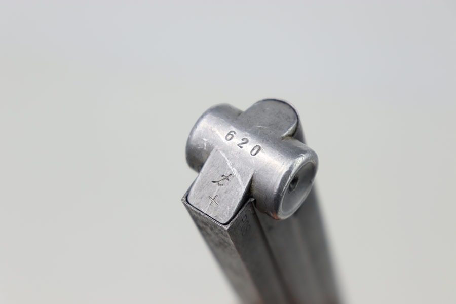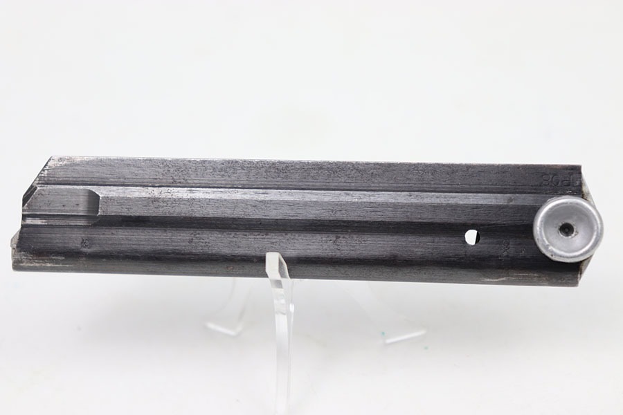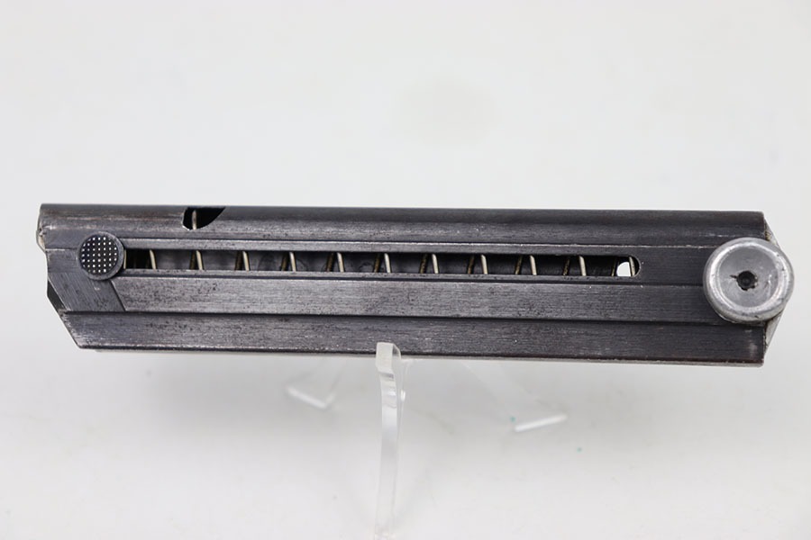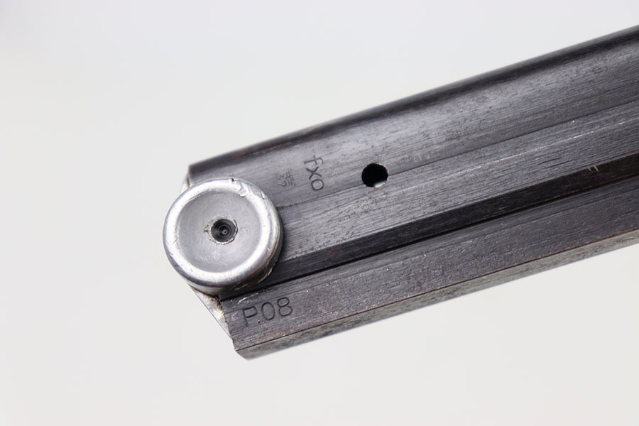 10/12/24 – This is an original example of an Haenel FXO Luger Magazine. This magazine is in excellent condition with the majority of its blued finish remaining. There is little wear on the spine and front edge. On the side of the tube of the magazine is the FXO and two eagle 37 markings. The base is numbered 620 with a “t” suffix. There is also a + sign indicating it is a spare magazine. Strong and functional spring.