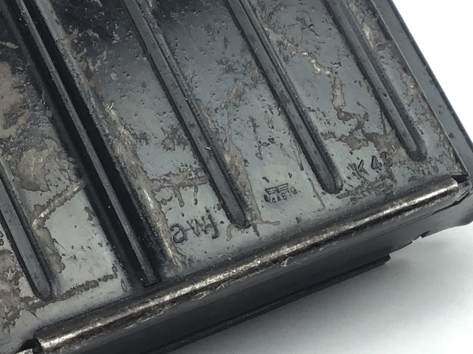 10/15/20 – This is an original WW2 production Mauser G43 / Walther K43 magazine. The magazine is marked “K43” with a “awj” maker code and waffen eagle WaA879. The finish is original and shows honest use wear. There are no dents and no major issues. The spring is strong and fully functional.